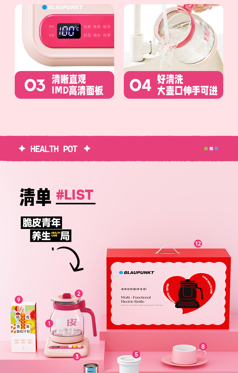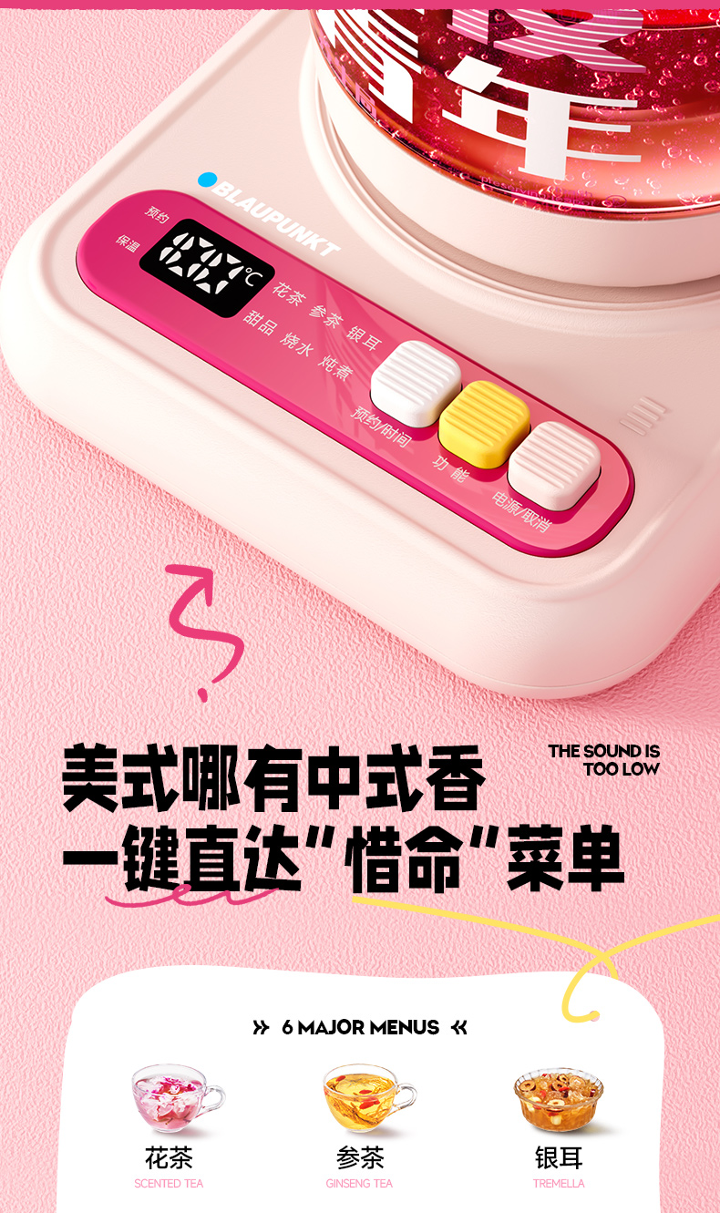 【简要卖点】:发热盘涂层升级「钛晶陶瓷技术」;沸腾自带“消音”,微纳级气泡连沸腾都悄无声息;水垢困扰≈0,水垢附着大幅减少;800W大功率叠加绵密微泡快煮双buff;(升级316不锈钢)茶漏、壶盖全面升级母婴级316L不锈钢;40-90℃共11档调温;6大“惜命”菜单(花茶/参茶/银耳/甜品/烧水/炖煮);12小时长预约,可提前一晚预约