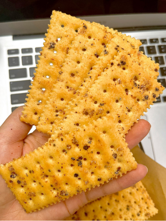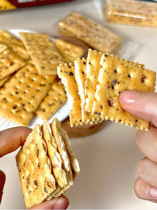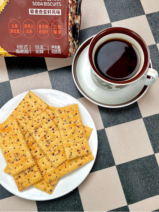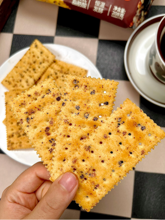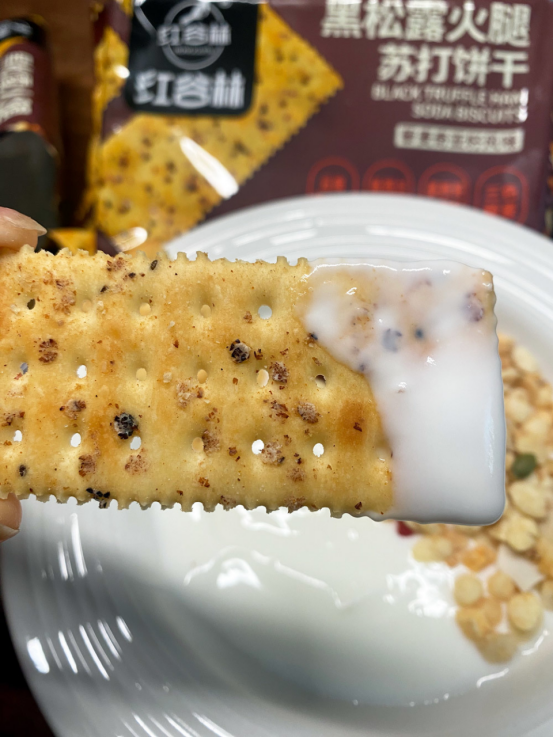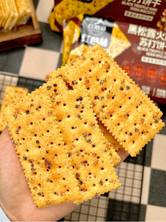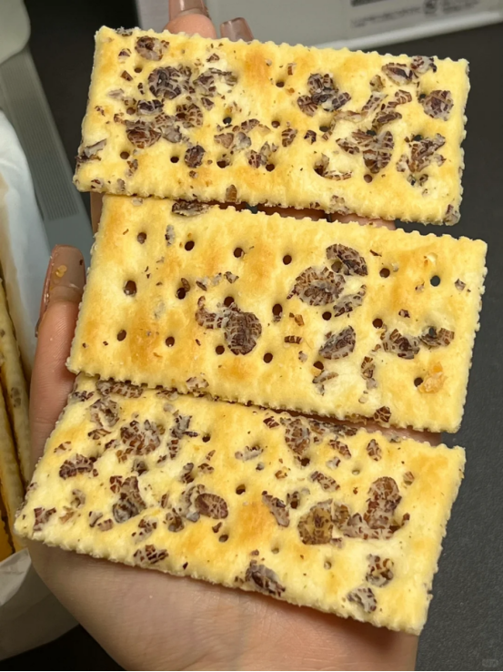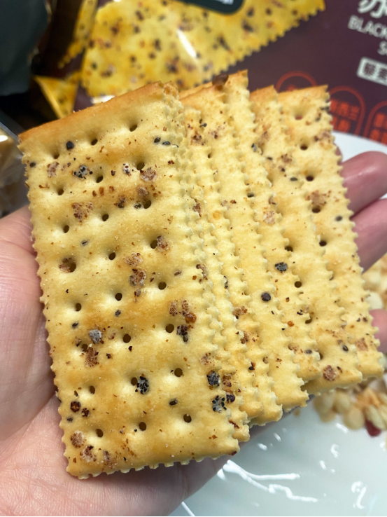 酥脆的口感!咸香的滋味! 入口就是很浓郁的黑松露的味道, 混合着苏打饼的麦香味! 还有藜麦奇亚籽和三色藜麦的加入! 可以嚼到谷物的颗粒感 吃一片就惊艳! 相对比其他的苏打饼干更加的酥脆, 又香又脆又鲜,属于是越吃越上头!
