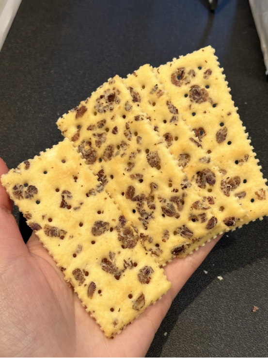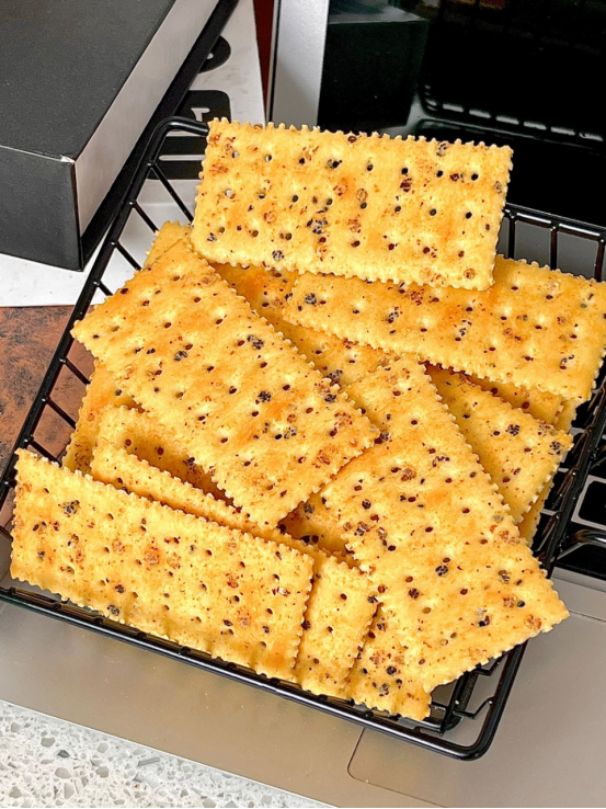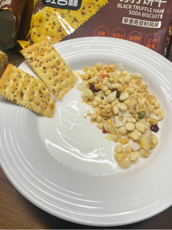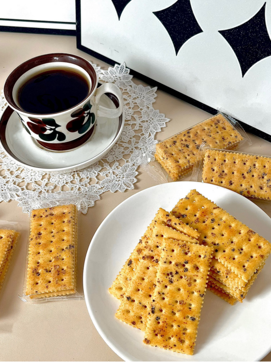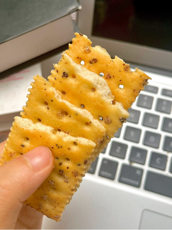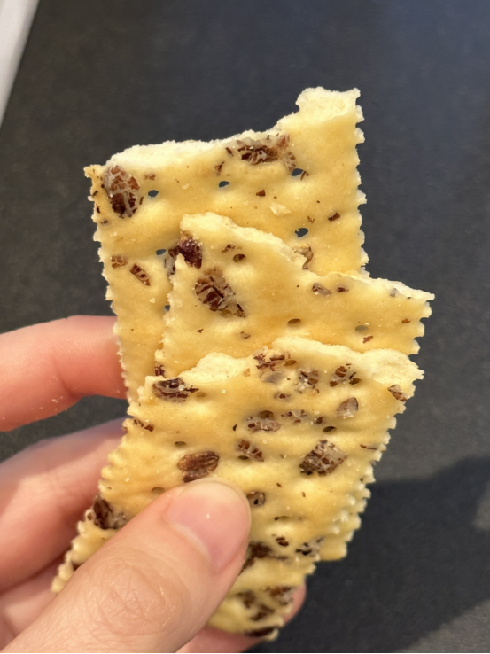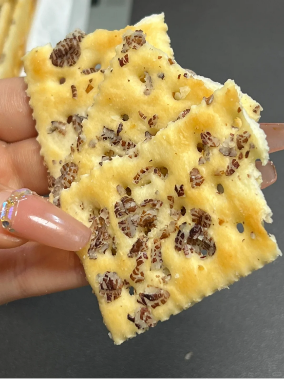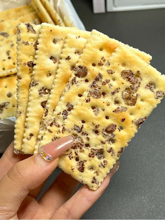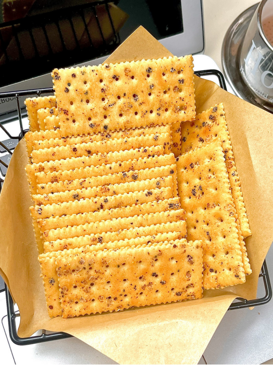 酥脆的口感!咸香的滋味! 入口就是很浓郁的黑松露的味道, 混合着苏打饼的麦香味! 还有藜麦奇亚籽和三色藜麦的加入! 可以嚼到谷物的颗粒感 吃一片就惊艳! 相对比其他的苏打饼干更加的酥脆, 又香又脆又鲜,属于是越吃越上头!