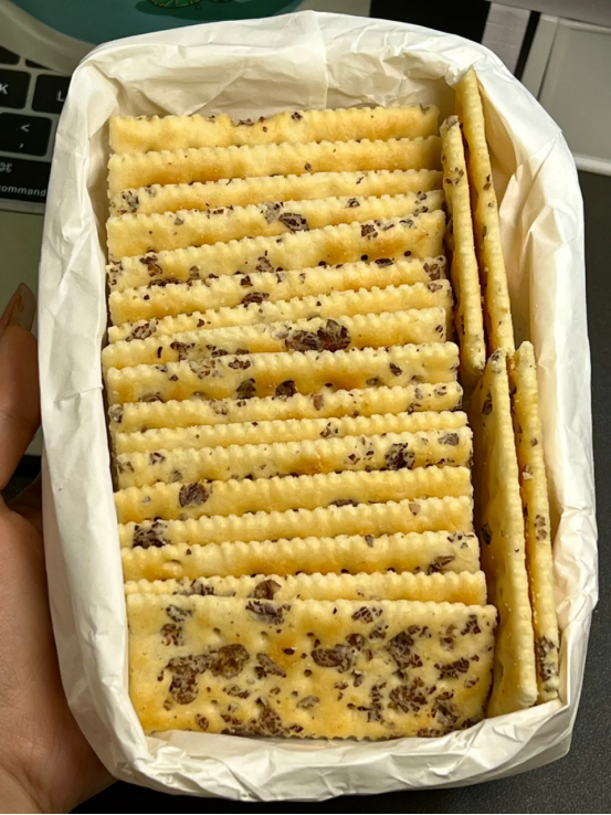 真材实料看得见: 打开就能看到饼干上满满一层黑松露和西班牙火腿颗粒 独特的🍄菌菇香味在口腔萦绕~ 有种减肥时期吃到肉🥩的满足感~ 口感也非常有惊喜,因为加了黄油🧈,入口特别酥脆