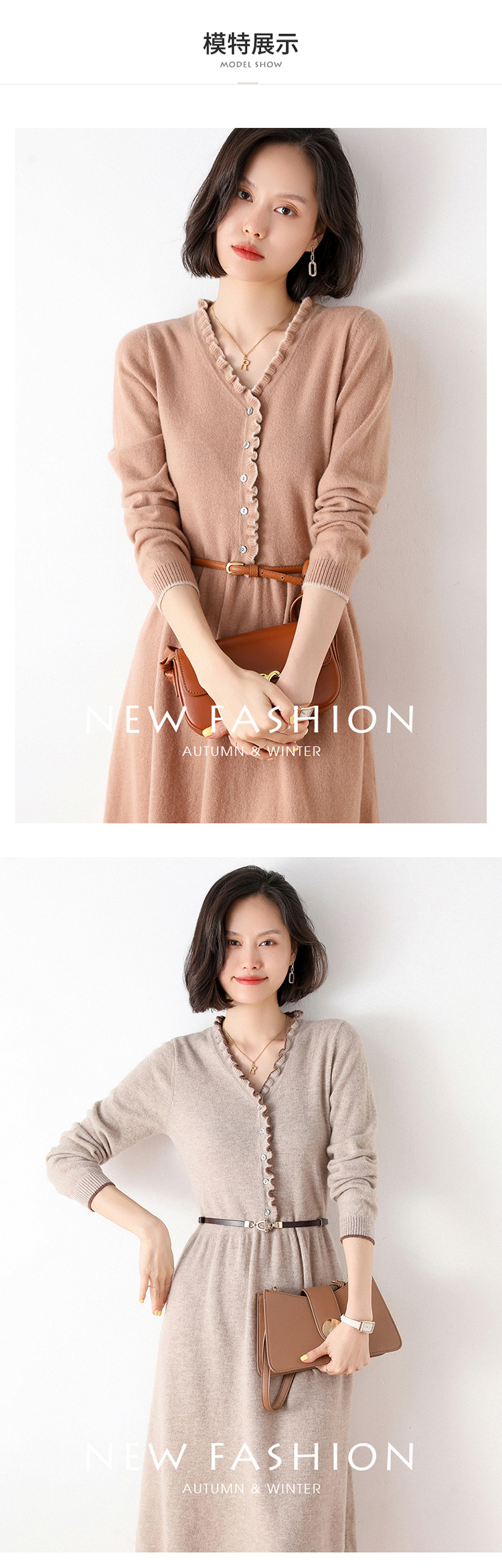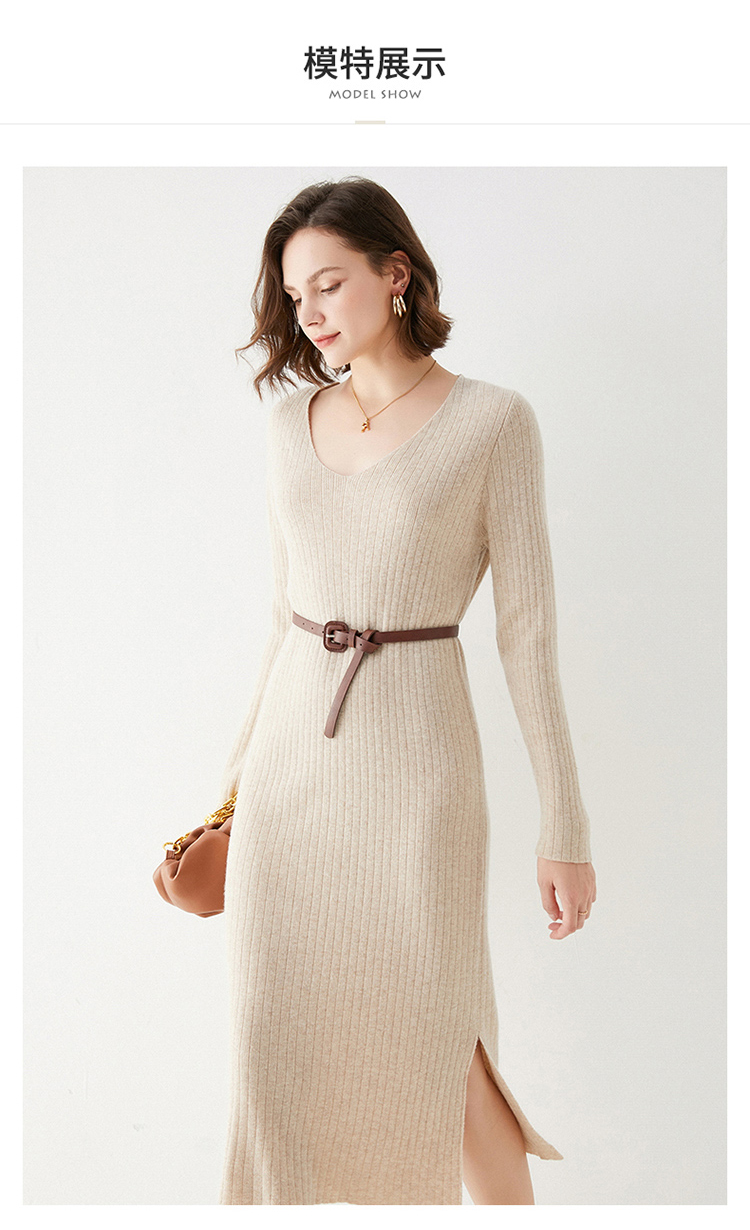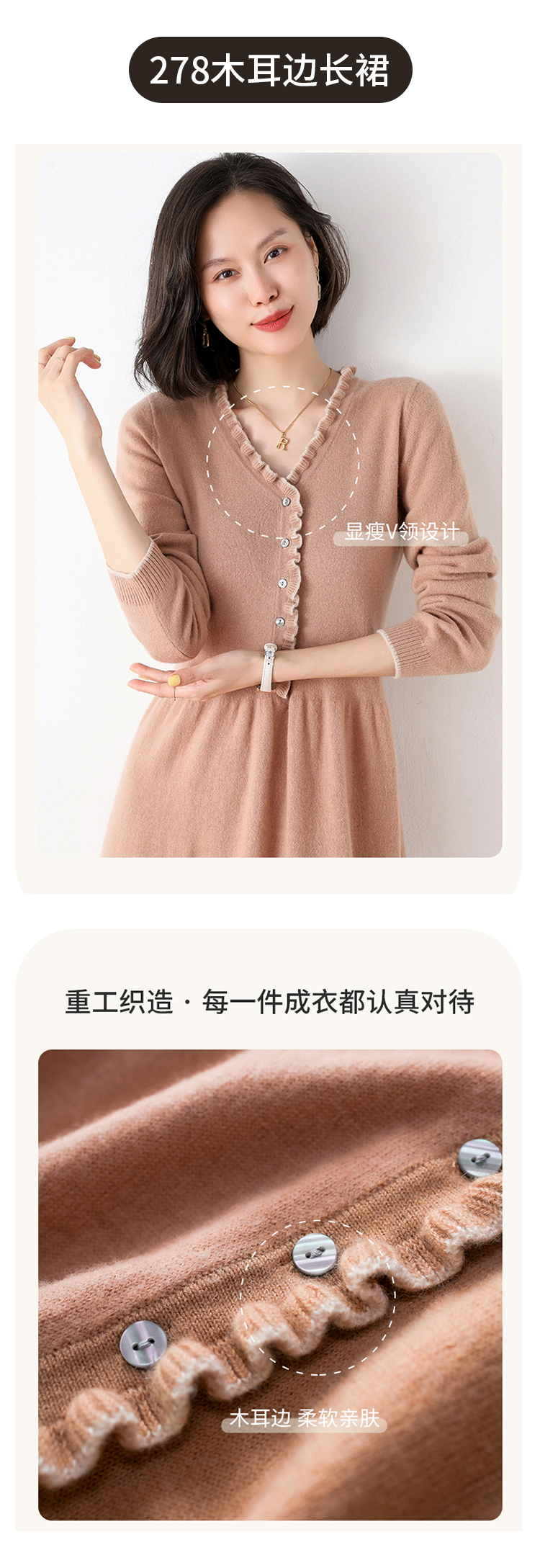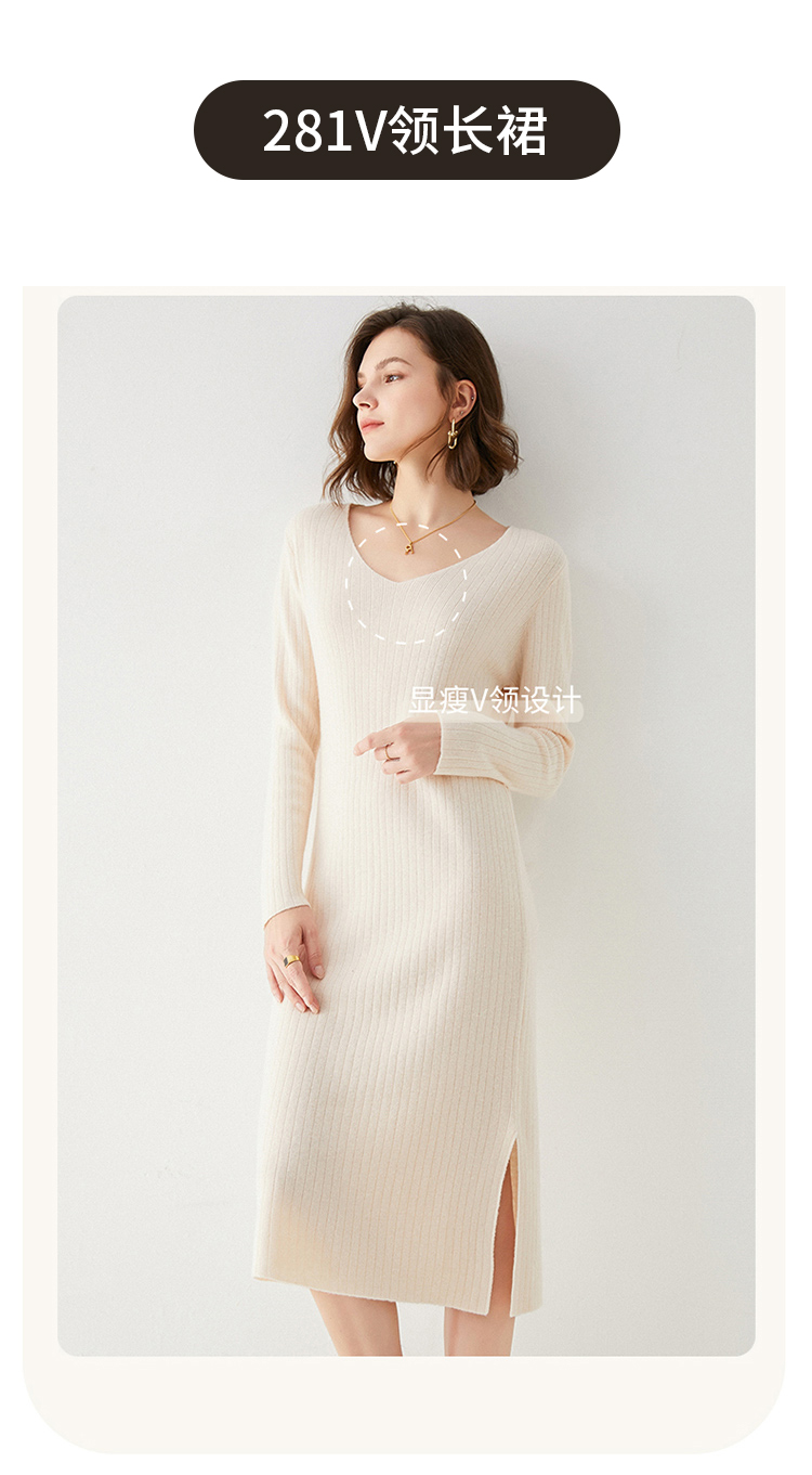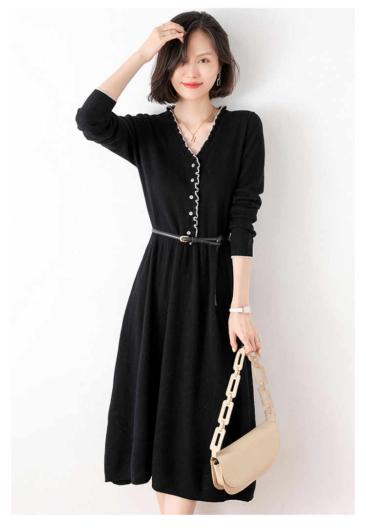 Avann纯羊毛V领-木耳边长裙羊毛女 新款洋气针织裙