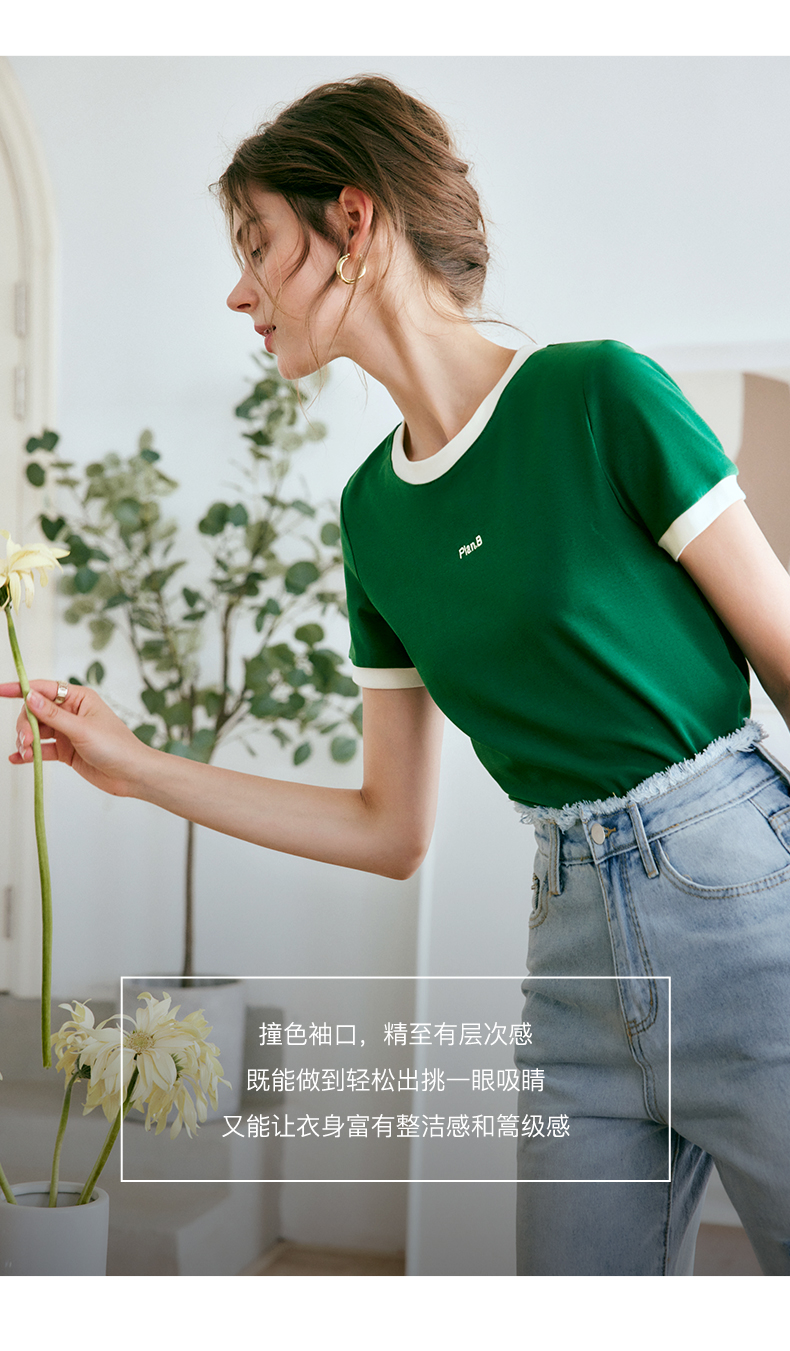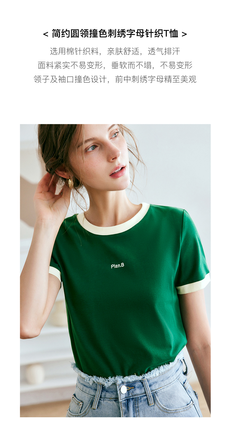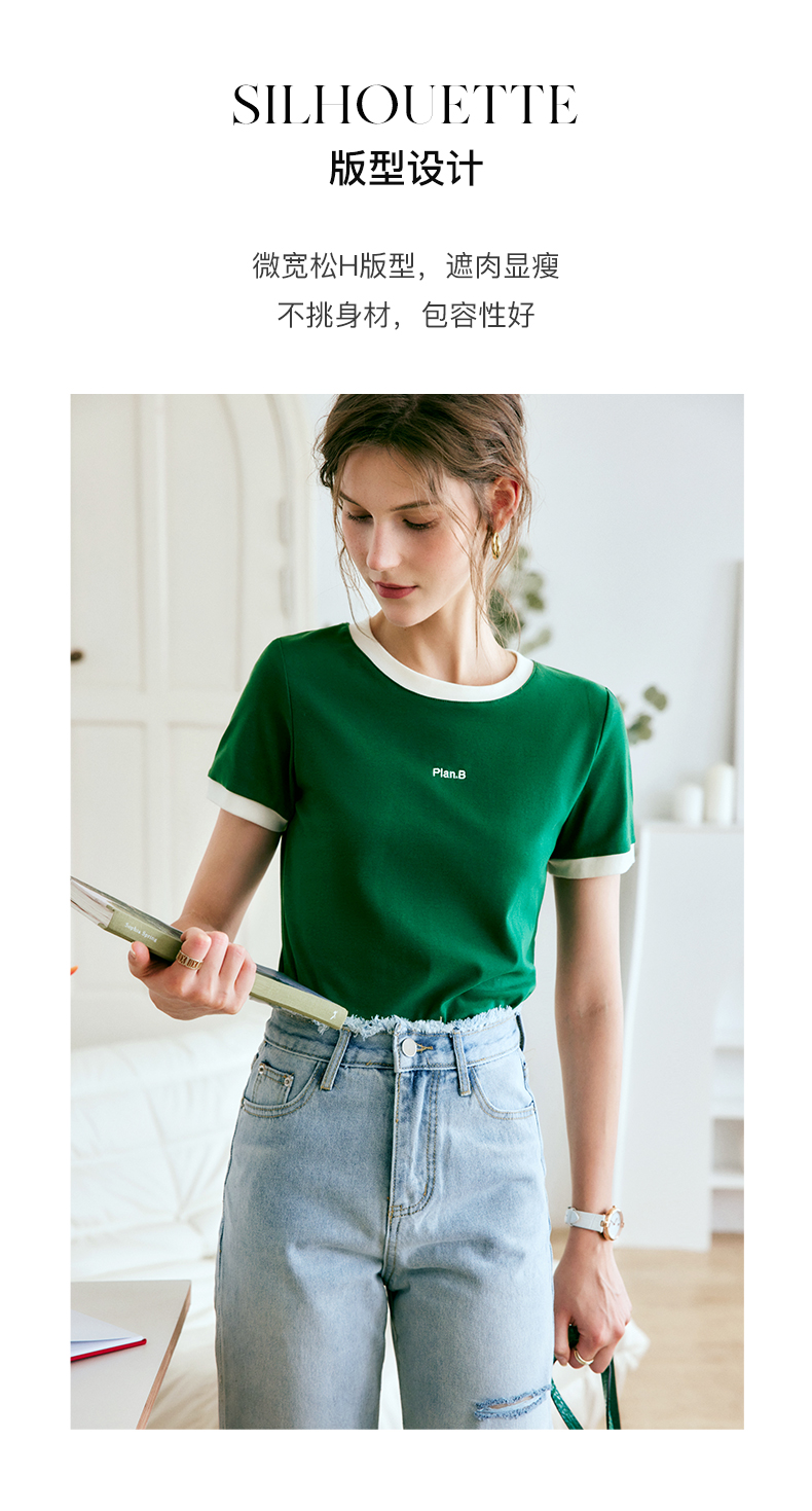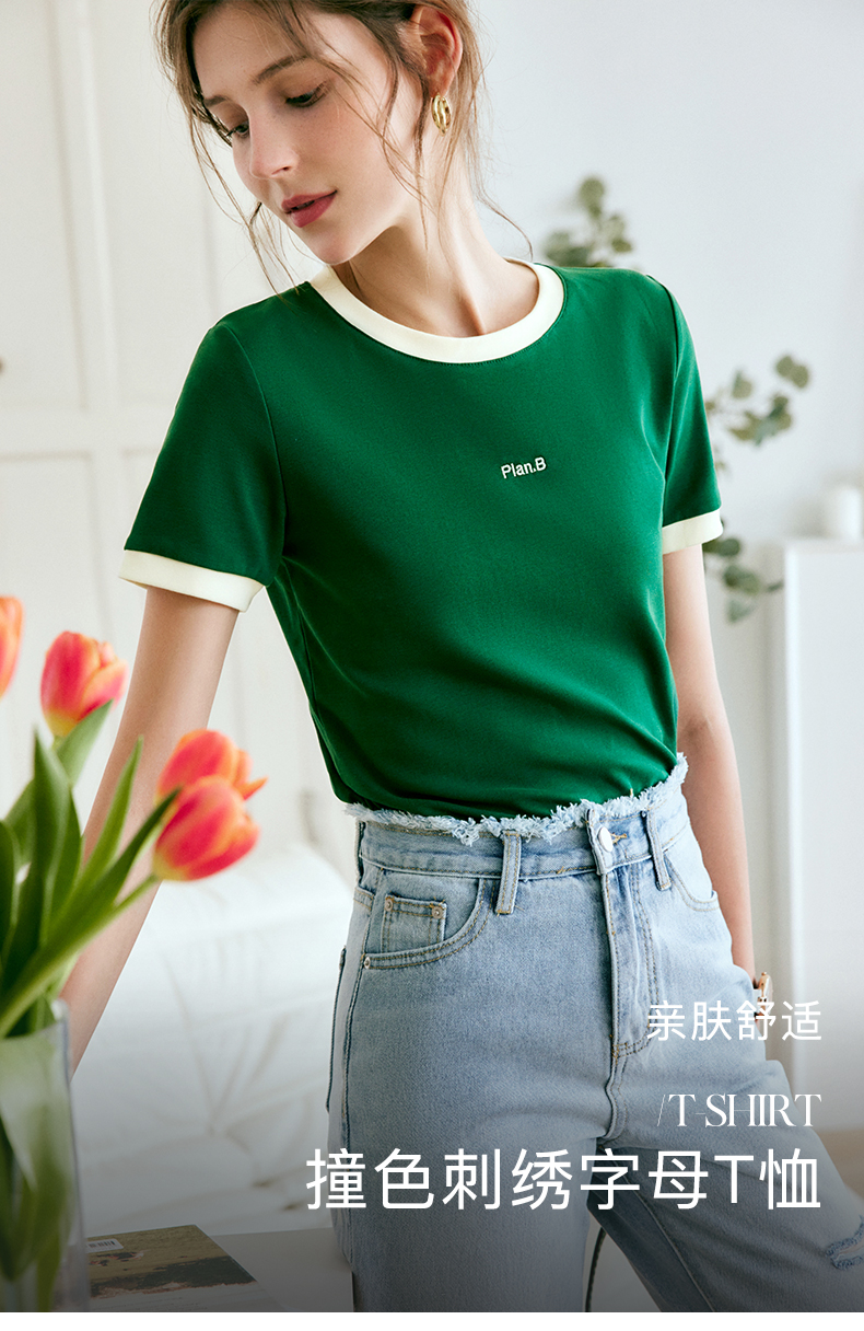 OLrain欧芮儿美式复古T恤女春季2024年新款时尚百搭撞色刺绣短袖