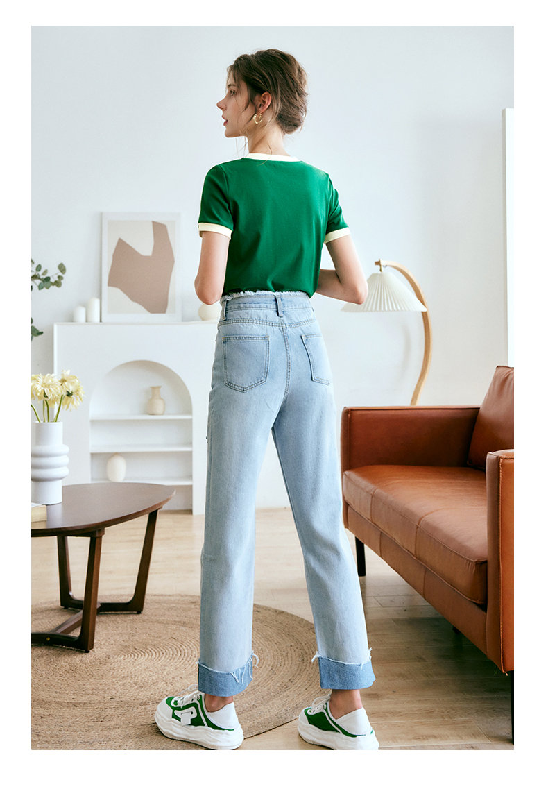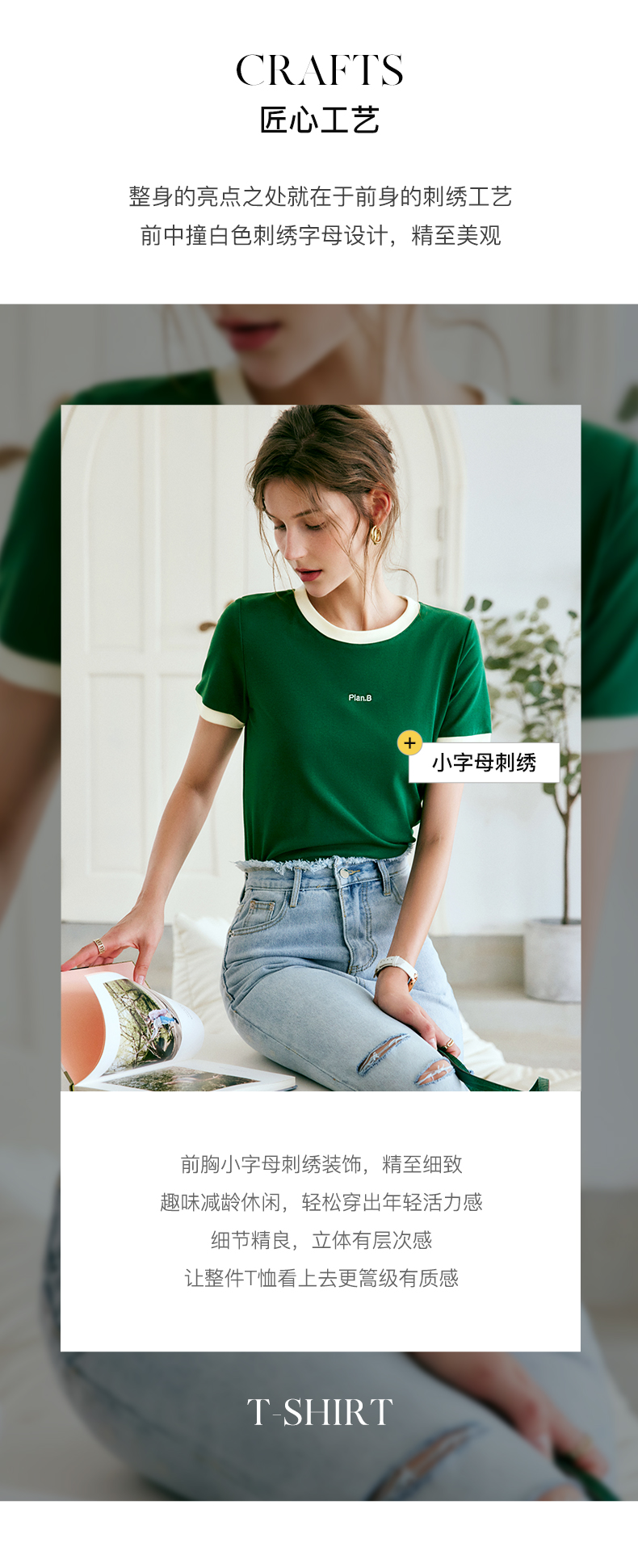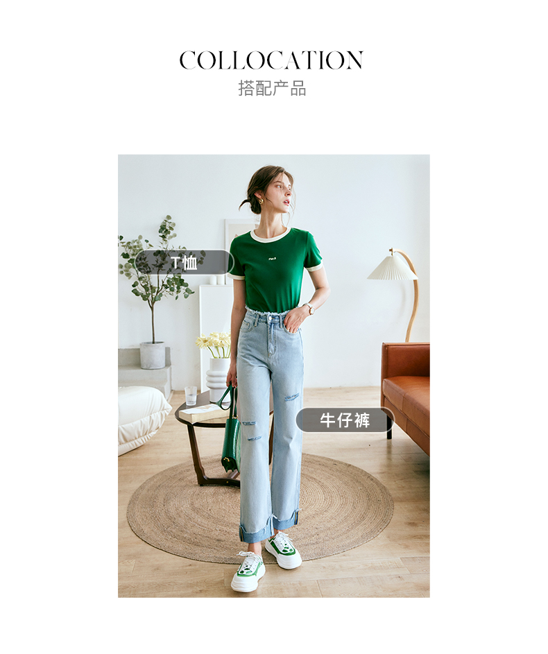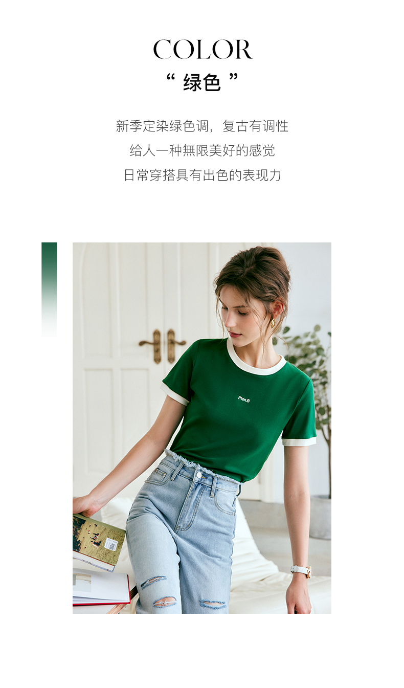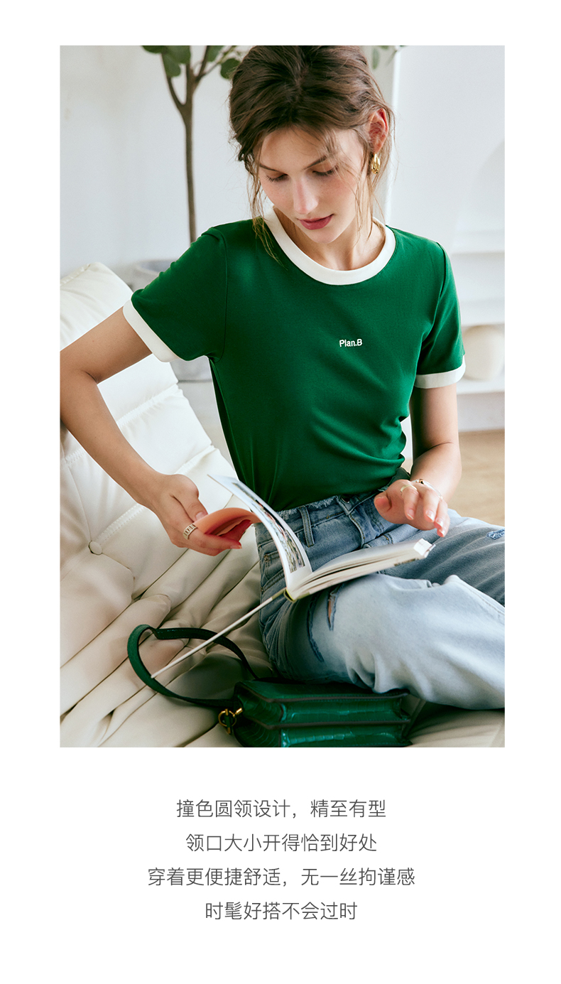 OLrain欧芮儿美式复古T恤女春季2024年新款时尚百搭撞色刺绣短袖
