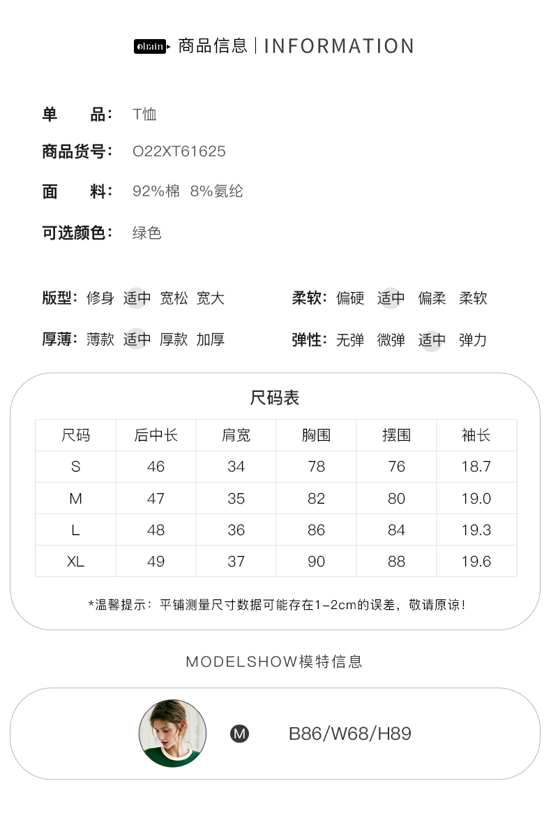 欧芮儿OLrain法式绿色短袖t恤女夏季2022新款修身显瘦高级感上衣