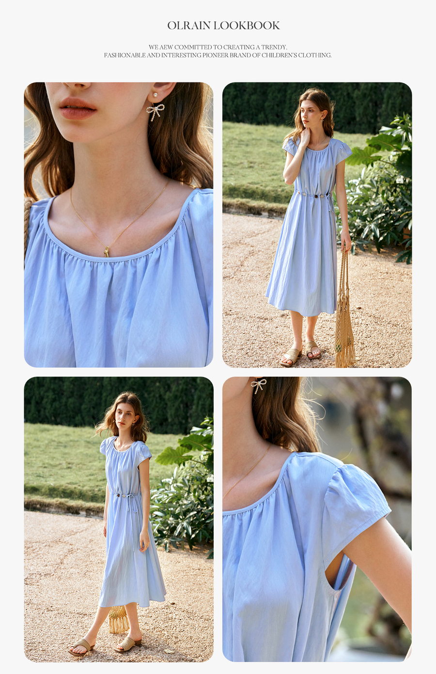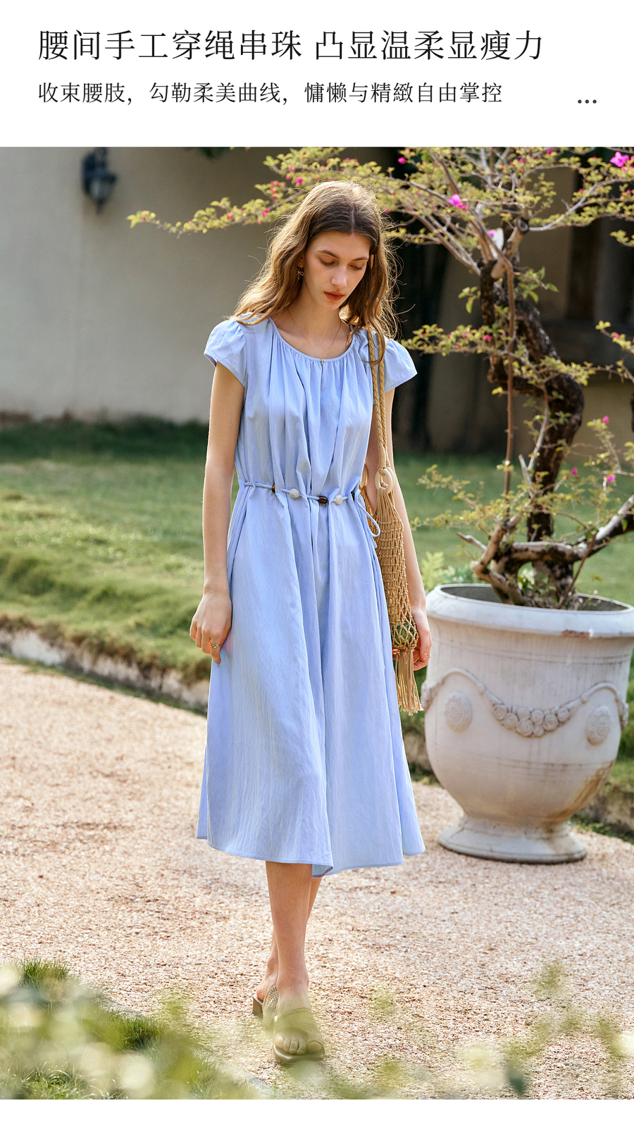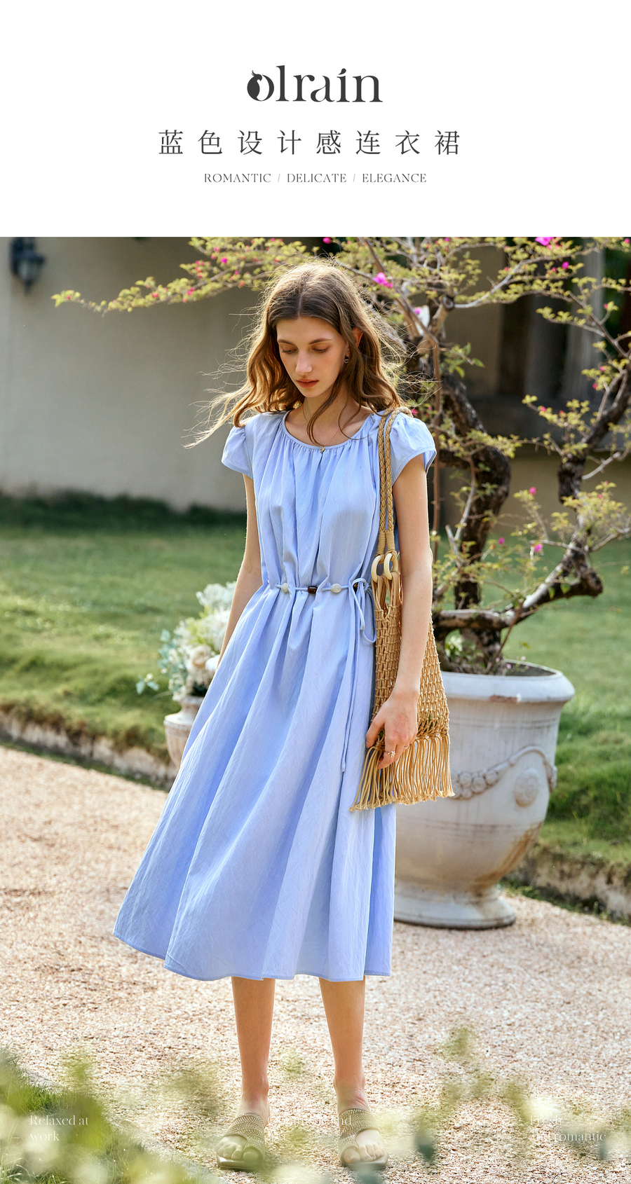 OLrain欧芮儿度假风串珠蓝色连衣裙女2025夏季新款法式独特掐腰裙