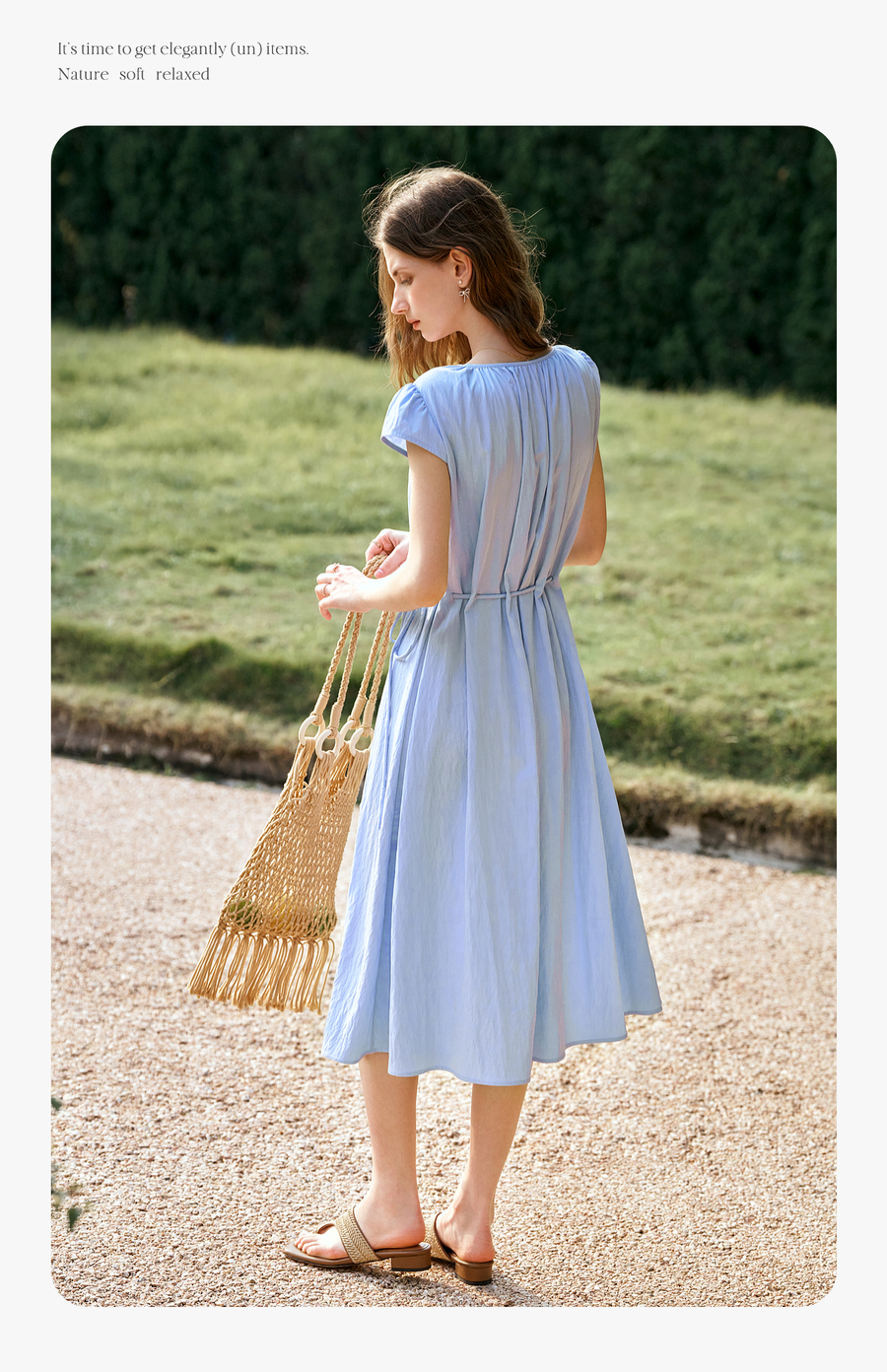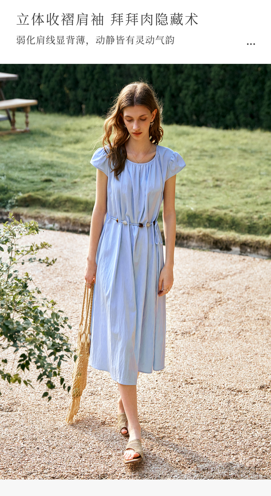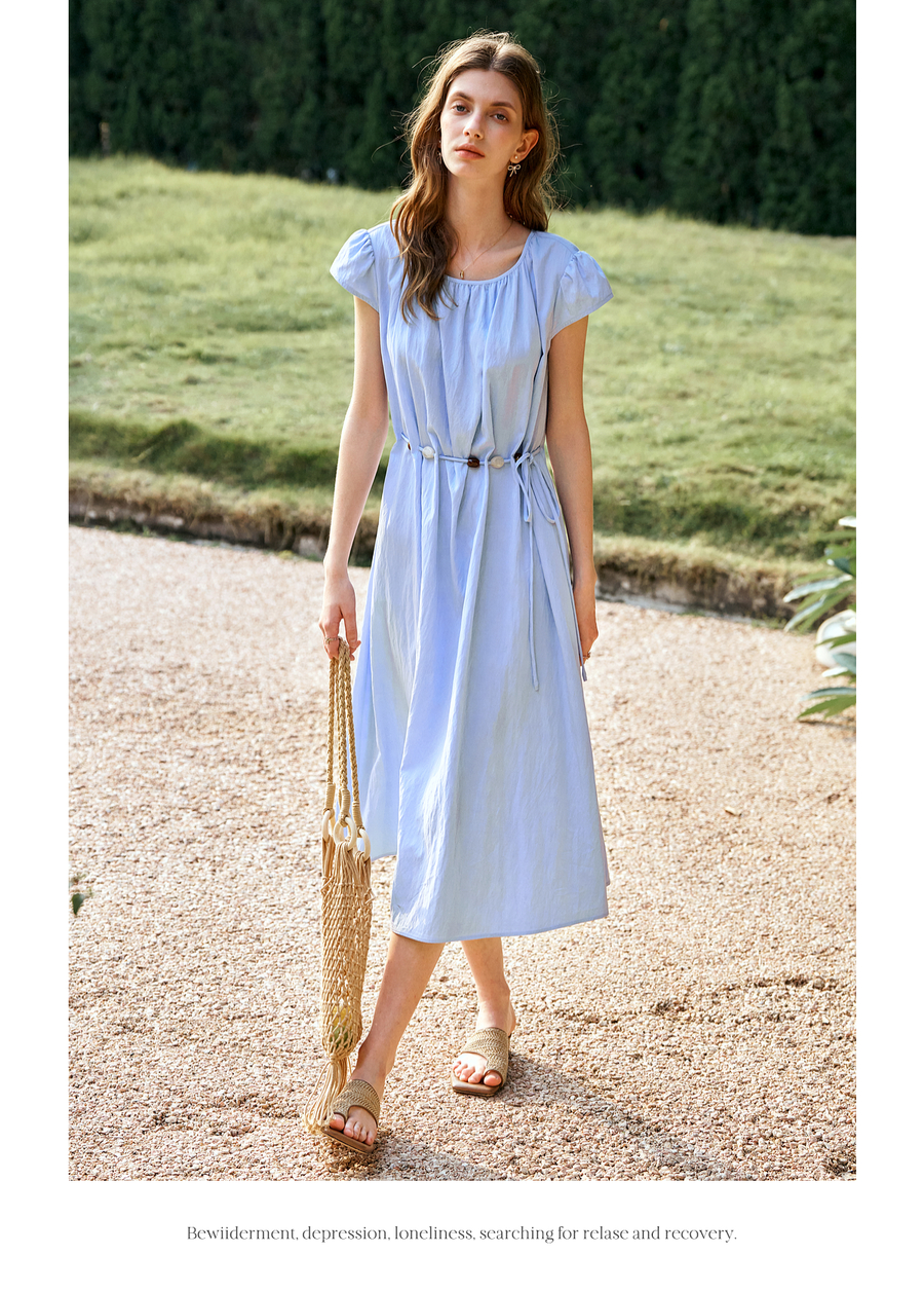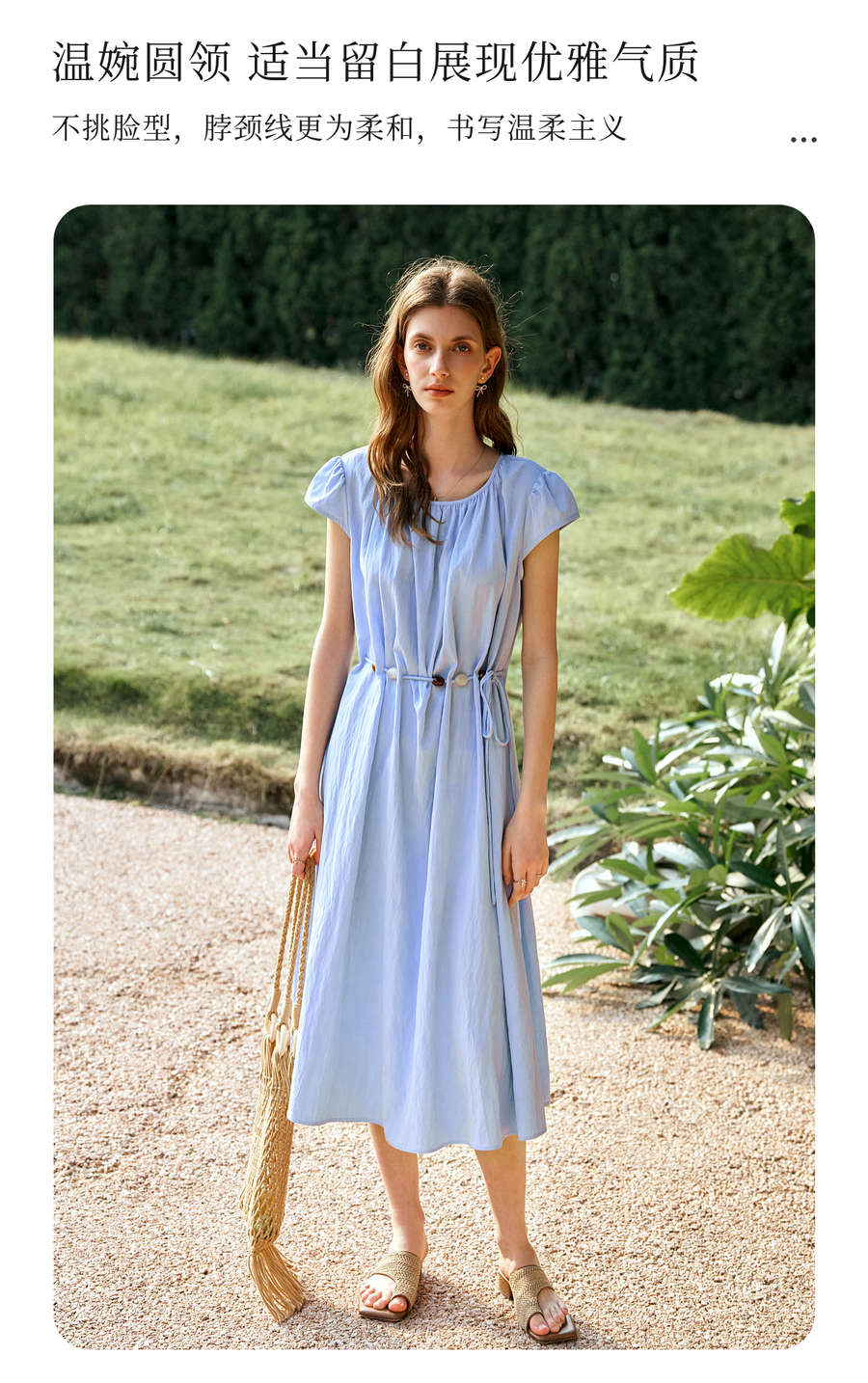 OLrain欧芮儿度假风串珠蓝色连衣裙女2025夏季新款法式独特掐腰裙