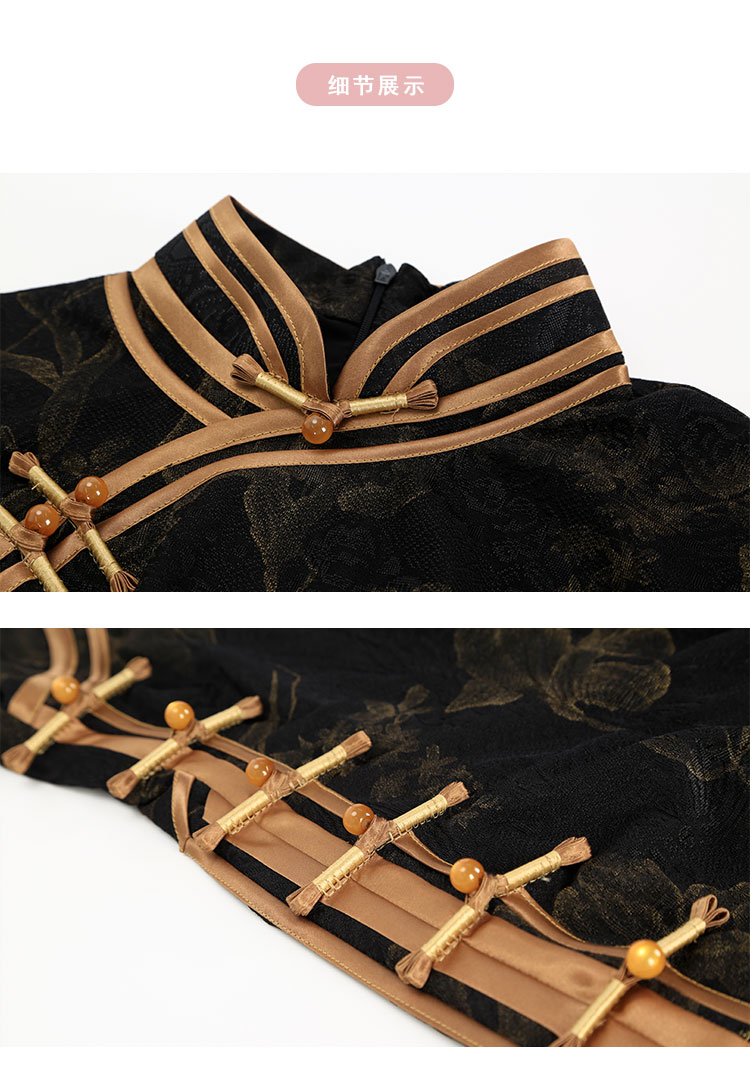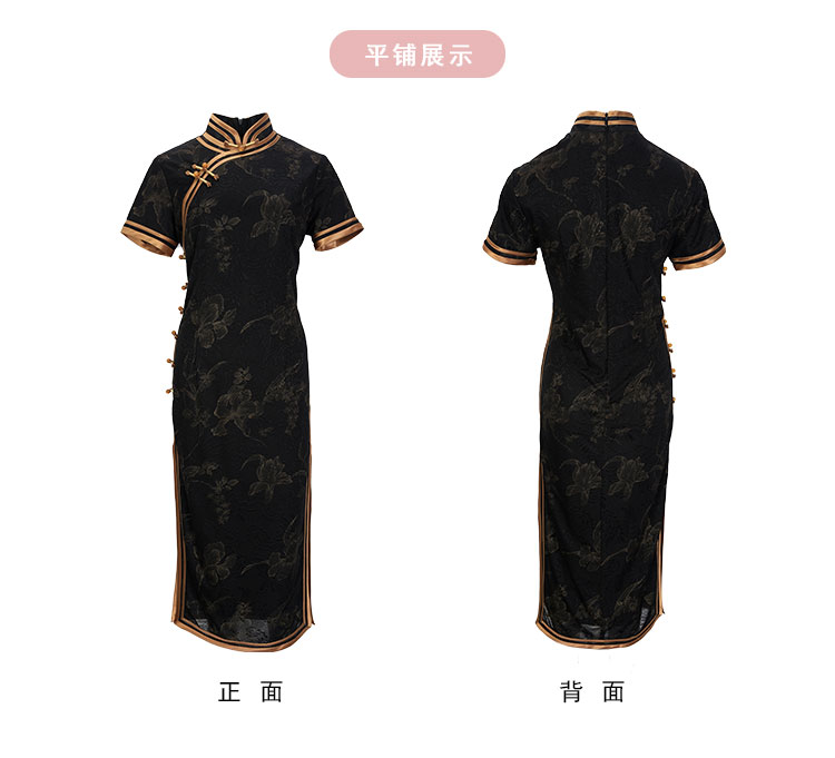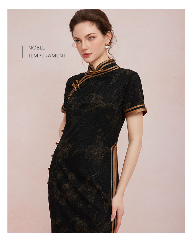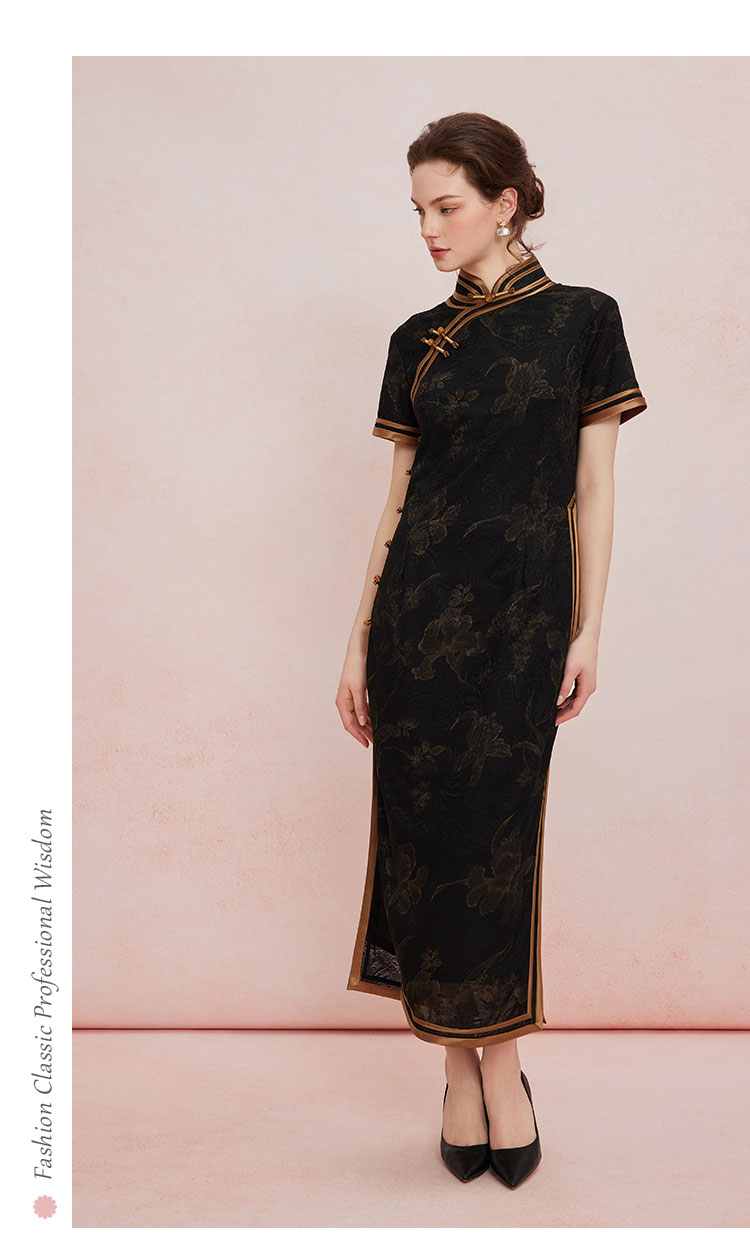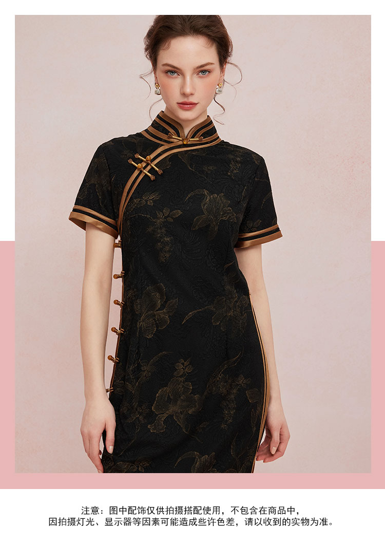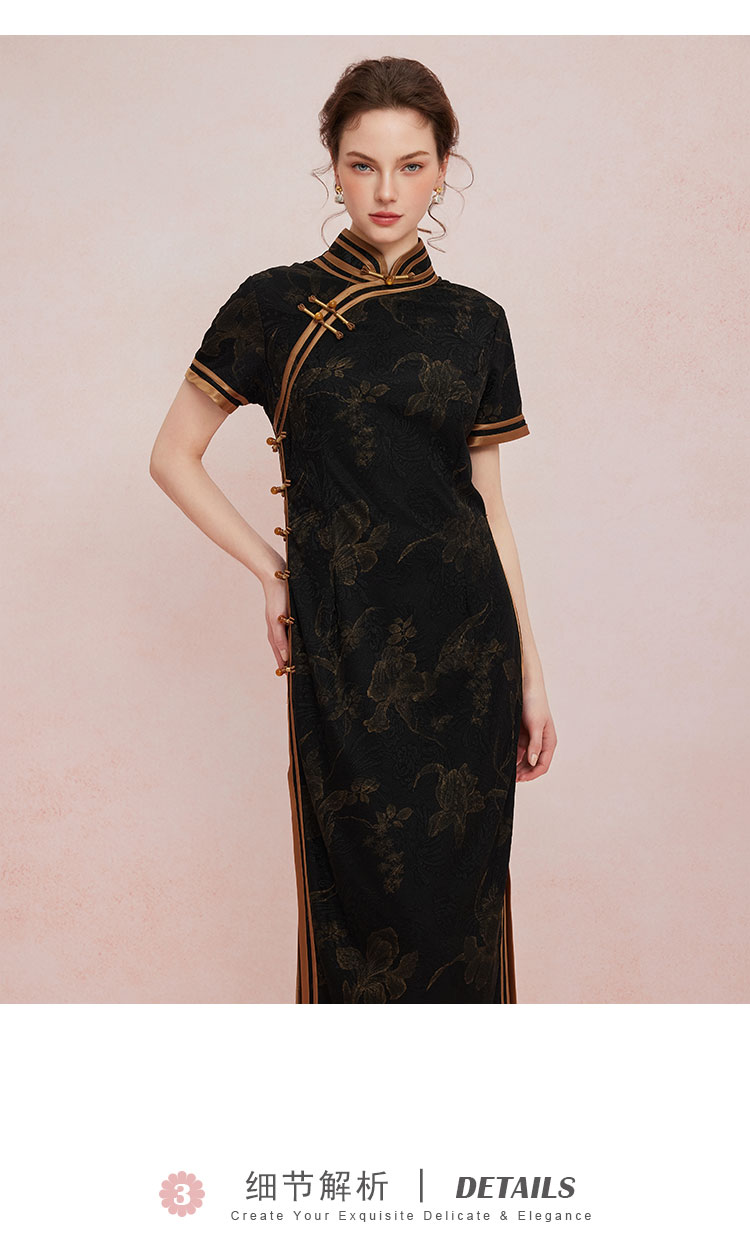 QF81925新款优雅暗花纹线条流畅撞色镶边盘扣短袖旗袍连衣裙