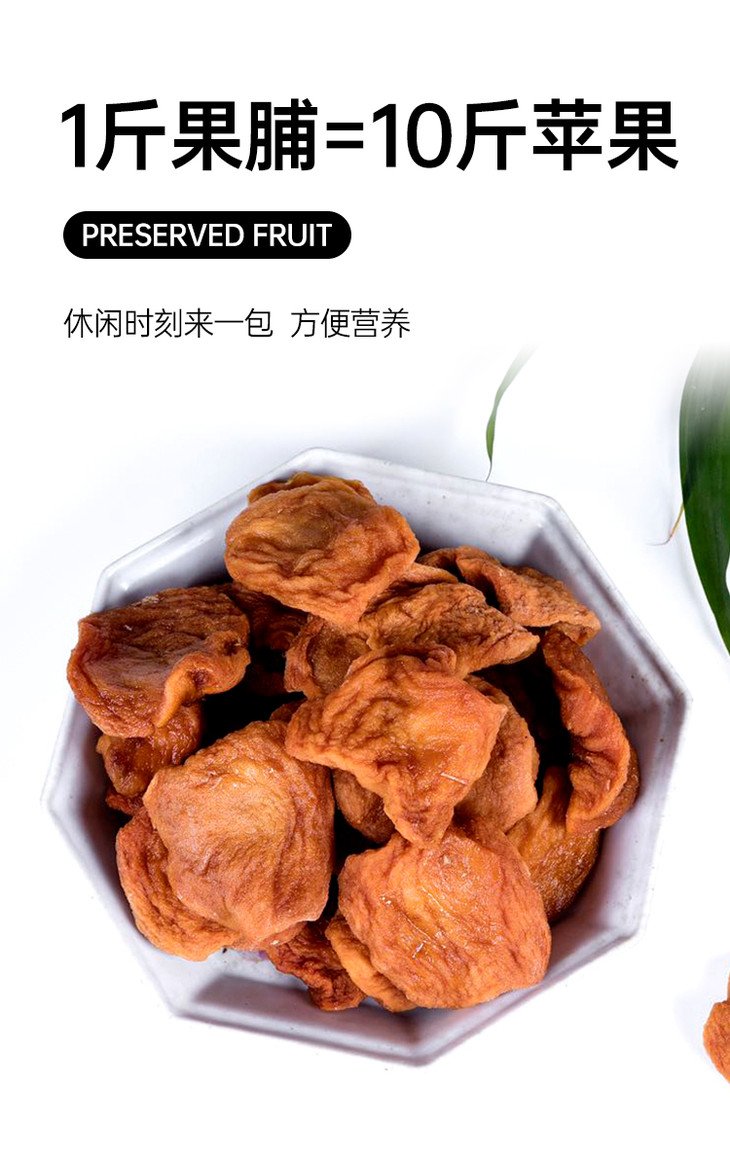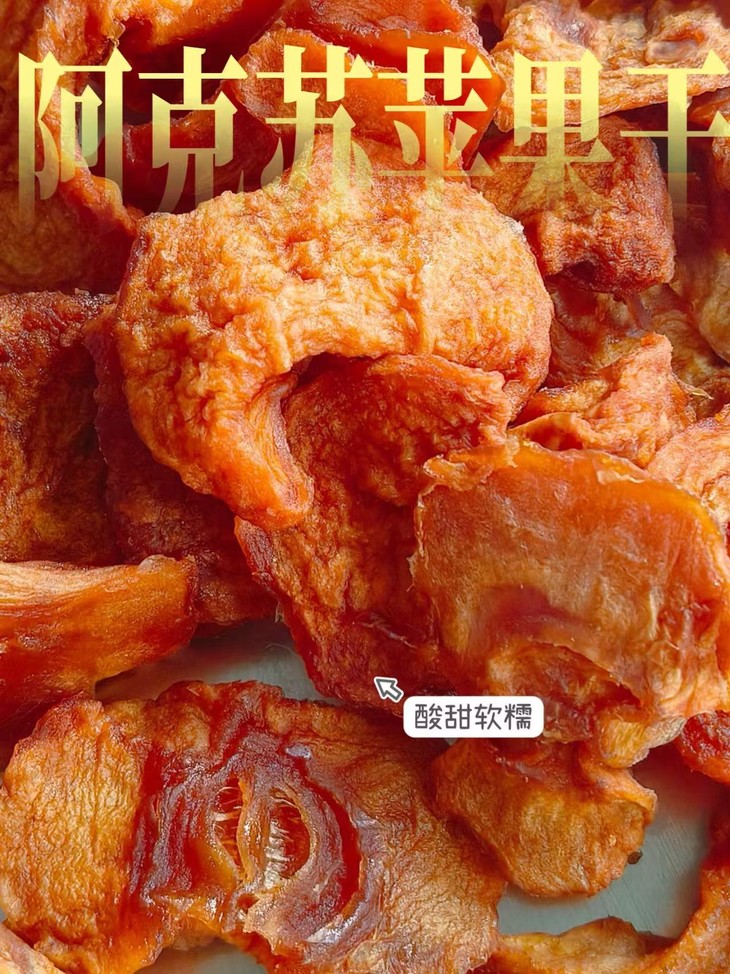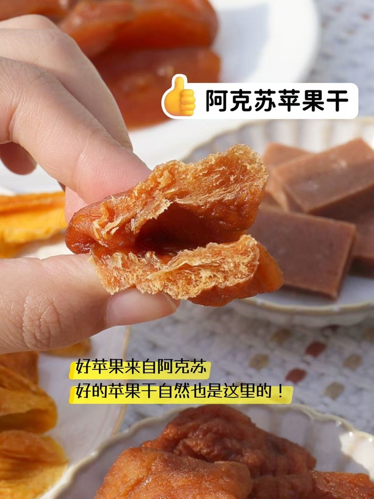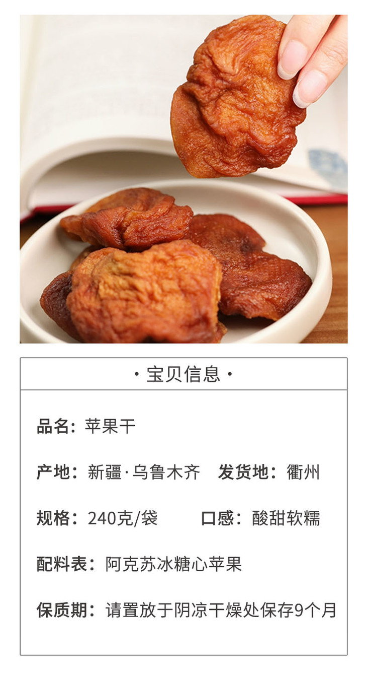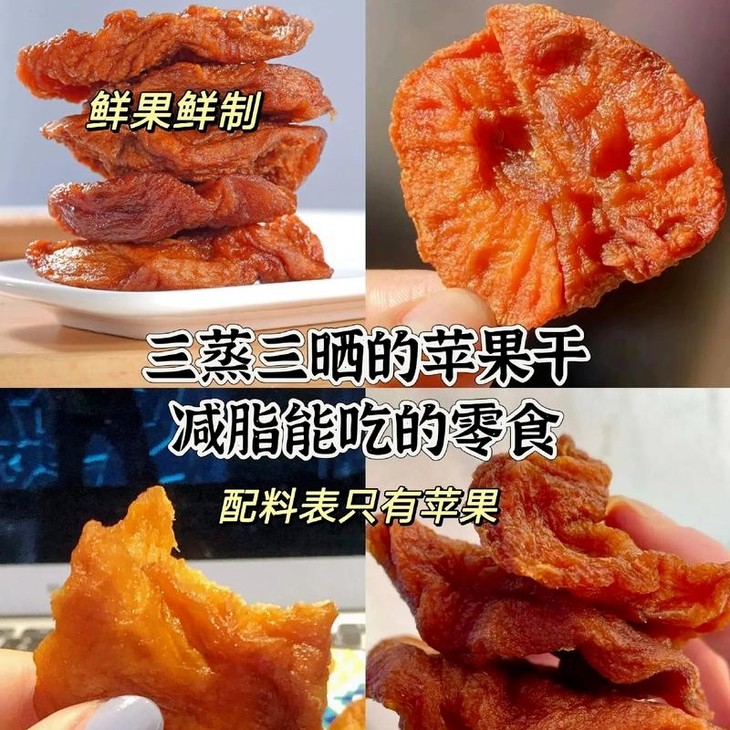 【苹果干】树上熟苹果新鲜制作,古法三蒸三晒,果味十足,厚实软糯有嚼劲,采用鲜果制作,经过九道工序和手工古法制作而成,每一袋都做了独立小包装,吃起来方便卫生,香甜软糯,果味浓郁