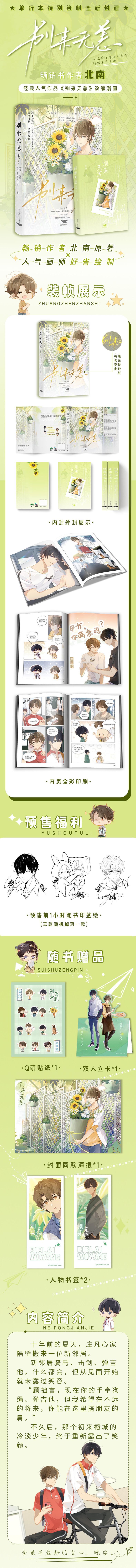 1. 《别来无恙》原著小说2019年首发于晋江,荣获2019年晋江纯爱作品年度佳作,收藏量达39万,总书评达25万,积分98亿多,稳居晋江各大榜单前列,深受广大读者喜爱追捧。同名漫画2021年首发于哔哩哔哩漫画,一经上线就好评无数,截至目前阅读指数高达67.1万。 2. 全彩印刷,设计精美,画手精心绘制全新封面,且漫画先于小说出版,大大提高读者购买漫画版的动力。 3. 经久不衰的久别重逢+破镜重圆的真香定律,两位少年的青春故事,相识,分别,至此热爱未改。让无数读者直呼“破镜重圆”天花板,后劲十足。 4. 小说作者北南,晋江口碑作者,已出版《碎玉投珠》等多部畅销作品。画师好省Suuygo,网络超人气画师,以画风独特,擅长人物刻画出名,绘制过《FOG》漫画版和《我行让我上1、3》封面。