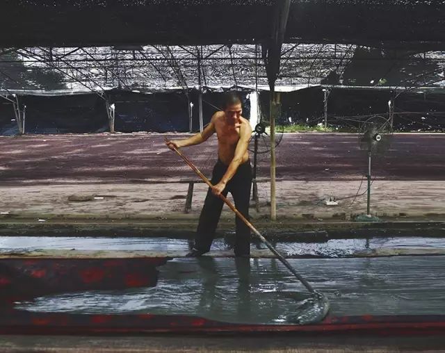 「涂泥」也称「过乌」。如果说浸莨与晒莨,凭的多是对「火候」的把握与手上的功夫,那么「涂泥」所靠的,是实实在在的体力。入行不久的年轻工匠,最先接触到的多是这一环节。