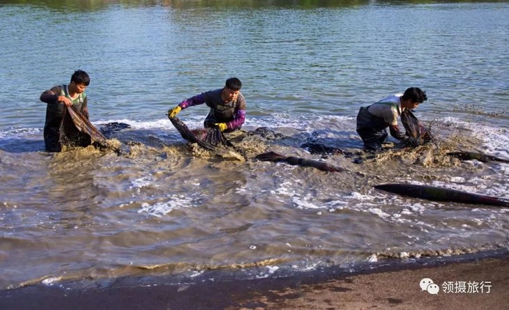要在最短的时间将数十块长达20米的面料完全浸泡与搓洗,需要的仍旧是速度和力量。河中水花四溅,匠人们熟稔的操作像极了另一端舞蹈。健硕的臂膀裸露着,完全湿润,已分不清是汗水还是河水。