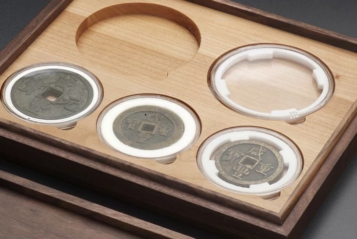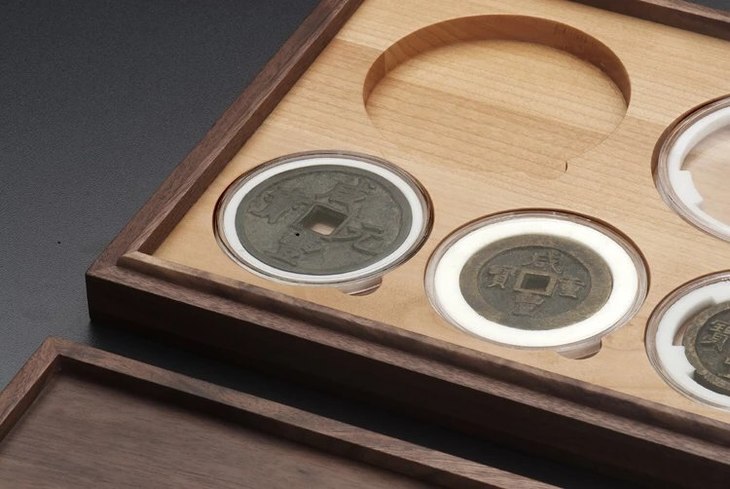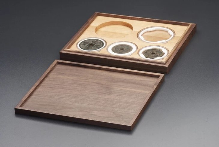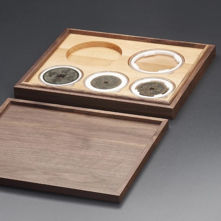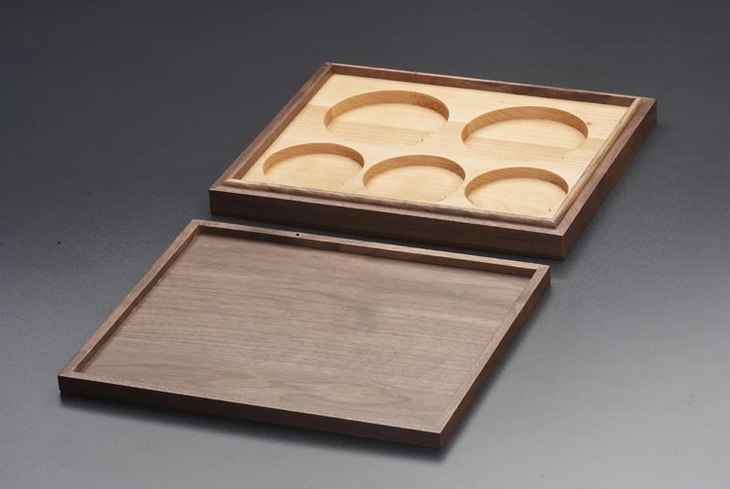 黑胡桃(枫木)单层实木托盘(2枚90mm+3枚71mm圆盒),外盒尺寸:264*220*35mm,适用于市场上常见的各种90mm和71mm的塑料水晶圆盒!为了加强盒子的更安全性,避免温差与天气干湿带来的盒子变型与开裂脱胶,主盒与盖四边采用黑胡桃实木,盒盖上面二个面用DMF贴厚黑胡桃实木;里面全枫木CNC缕槽,四边嵌边工艺制作,以力保整体美观,精细,安全,耐用!