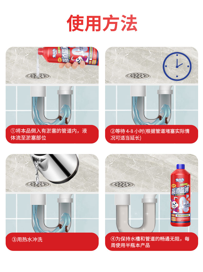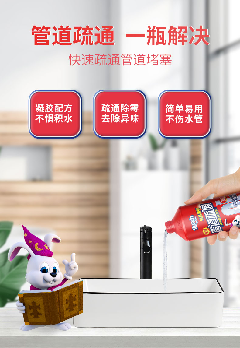 兔力液体管道通消臭啫喱 通道疏通剂下水道厨房油污头发堵塞马桶液体消臭溶解剂 500g/瓶