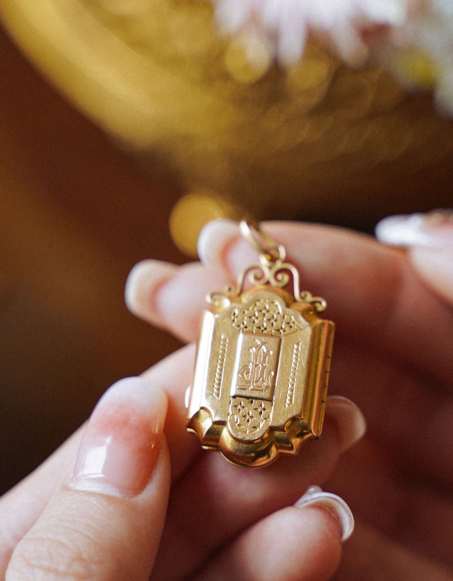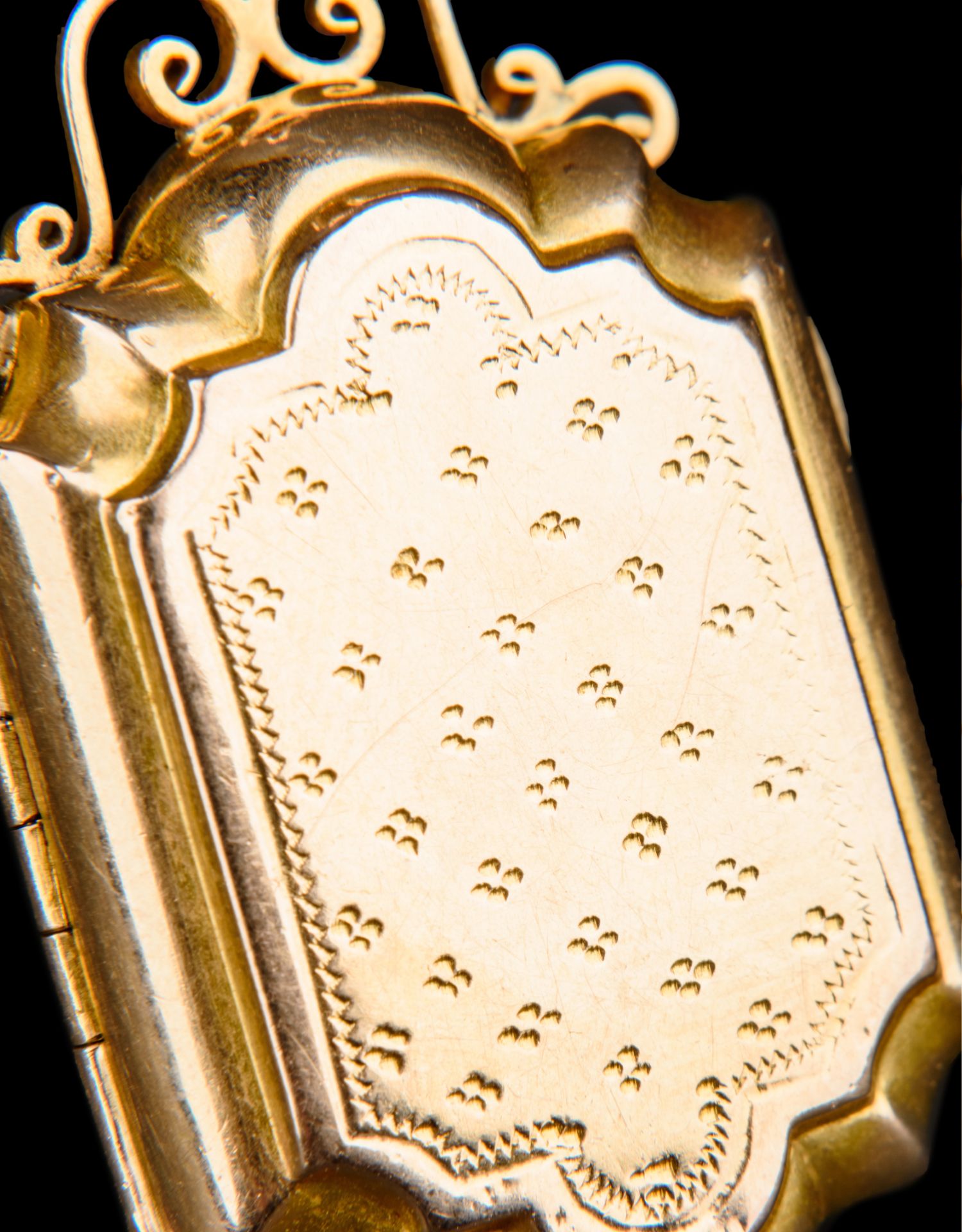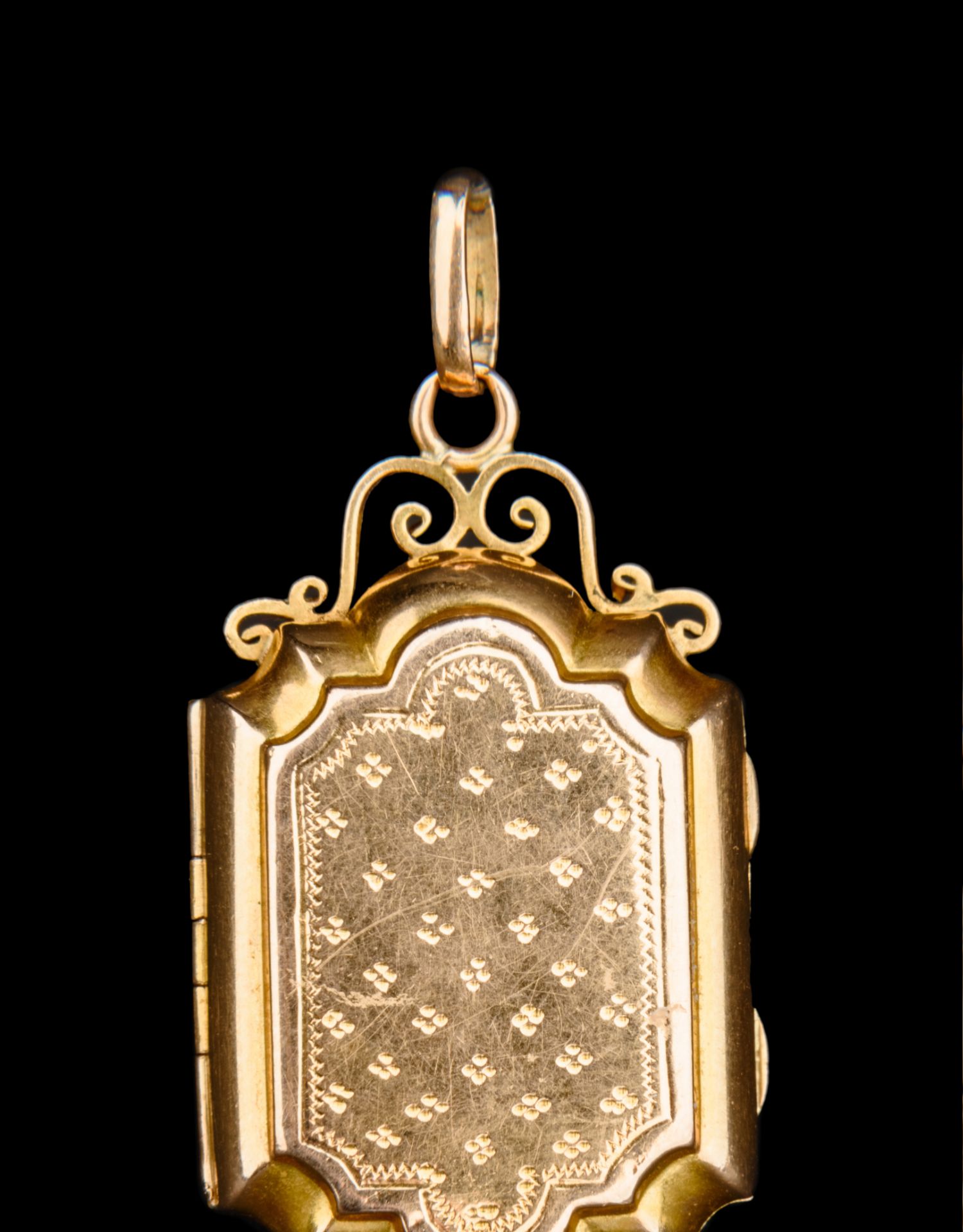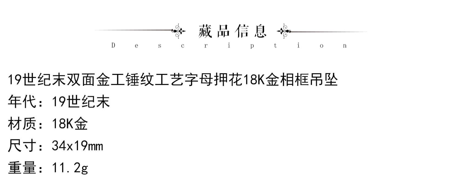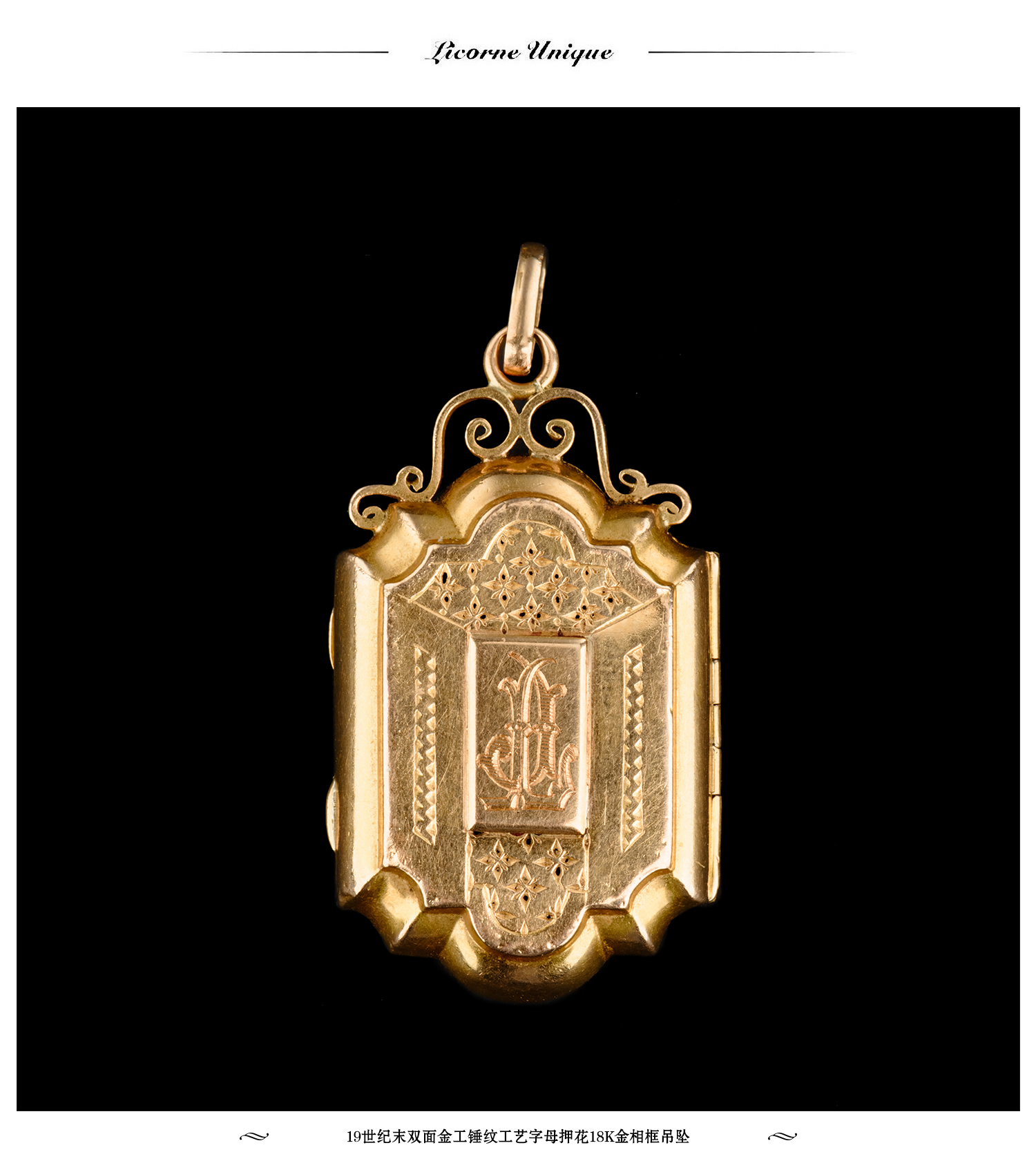独角鹿西洋古董珠宝首饰双面金工锤纹工艺字母押花18K金相框吊坠