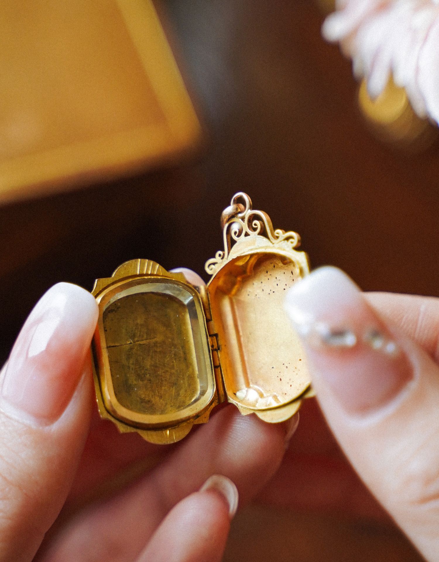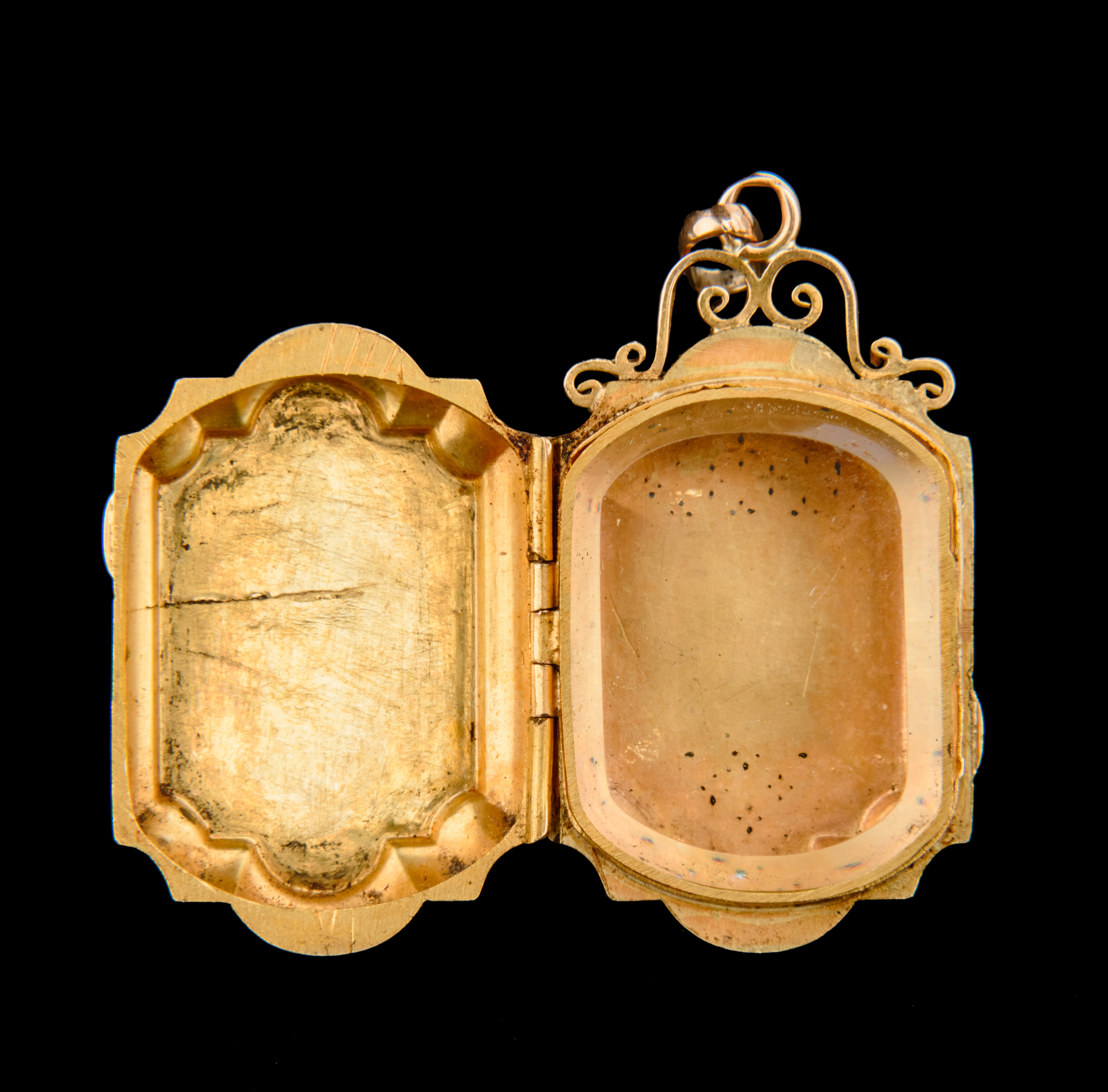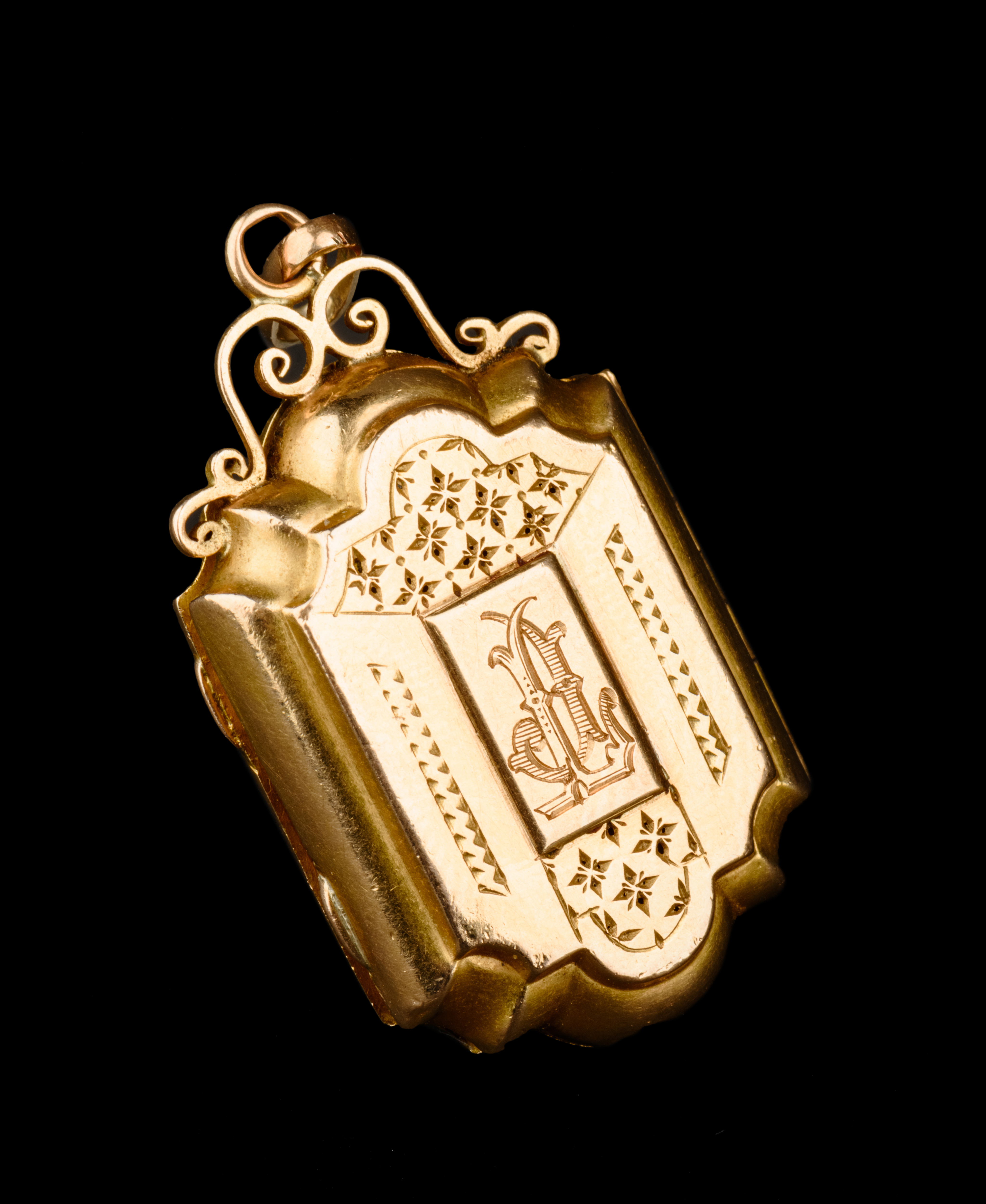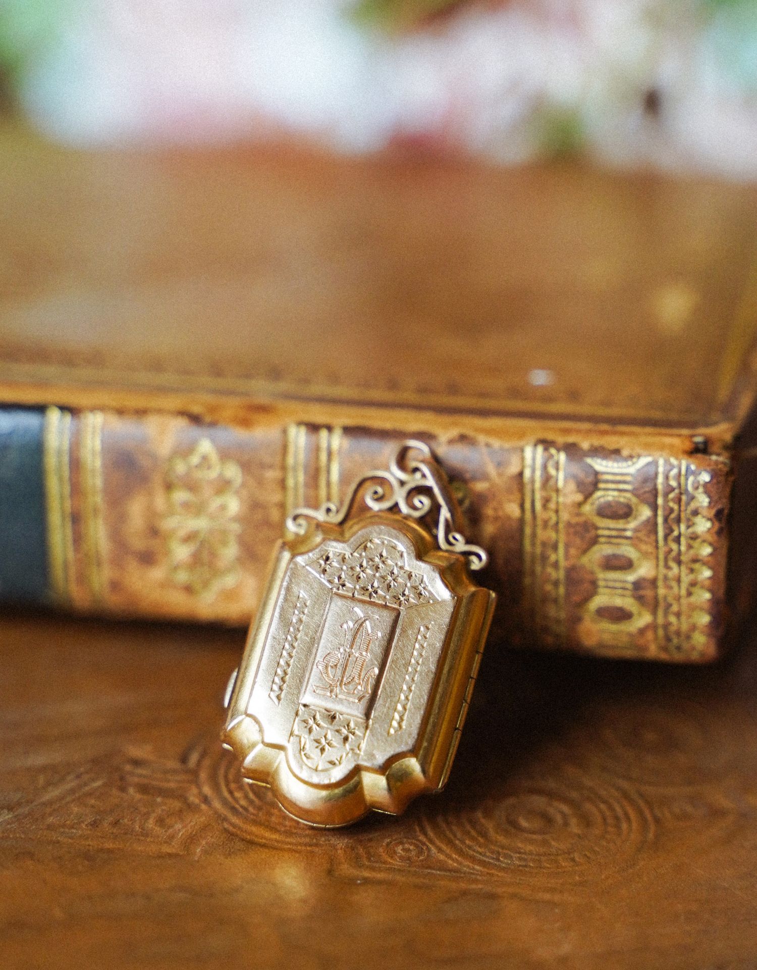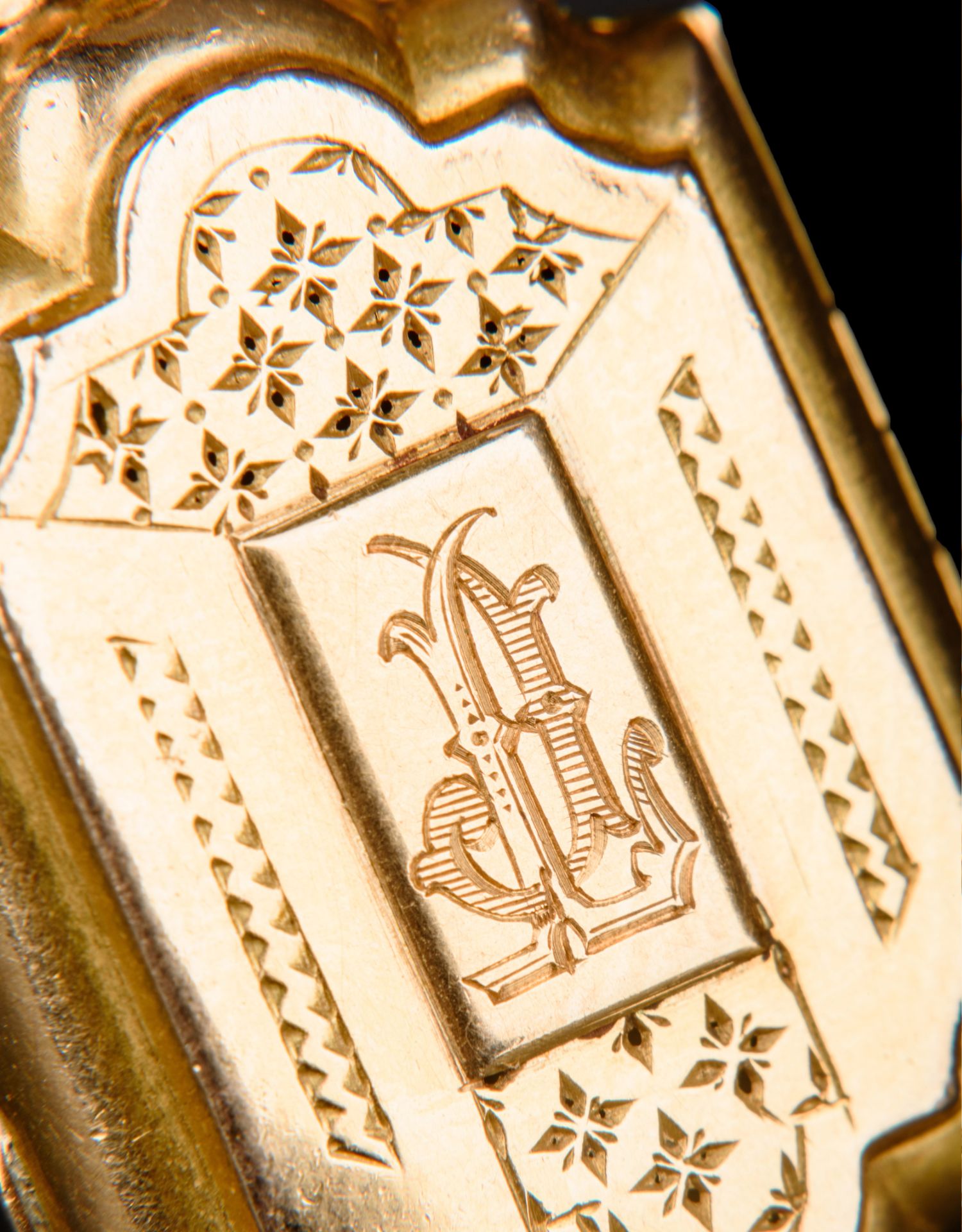 独角鹿西洋古董珠宝首饰双面金工锤纹工艺字母押花18K金相框吊坠