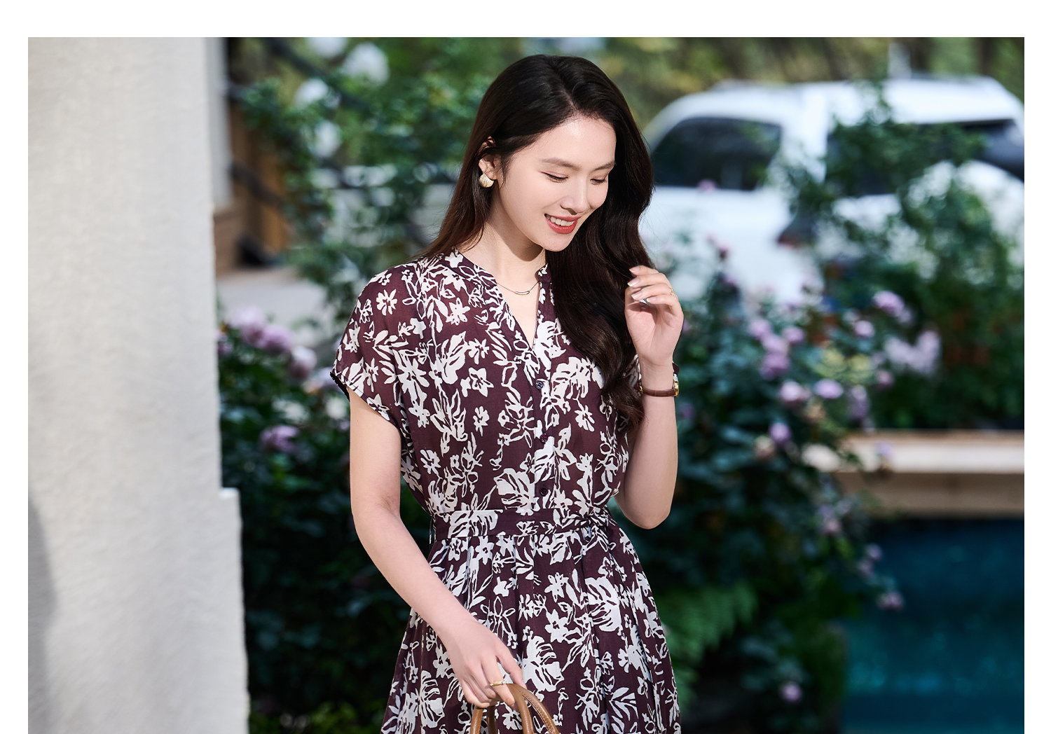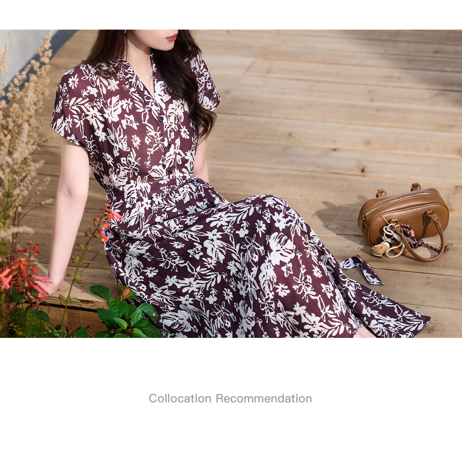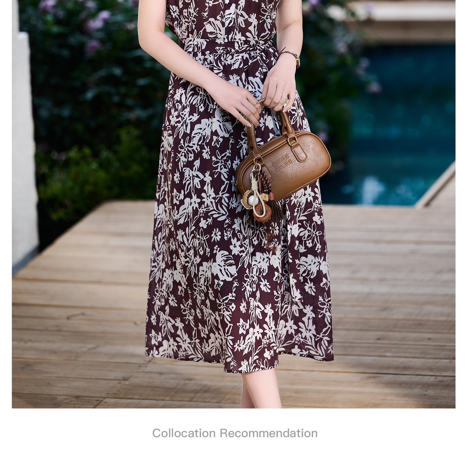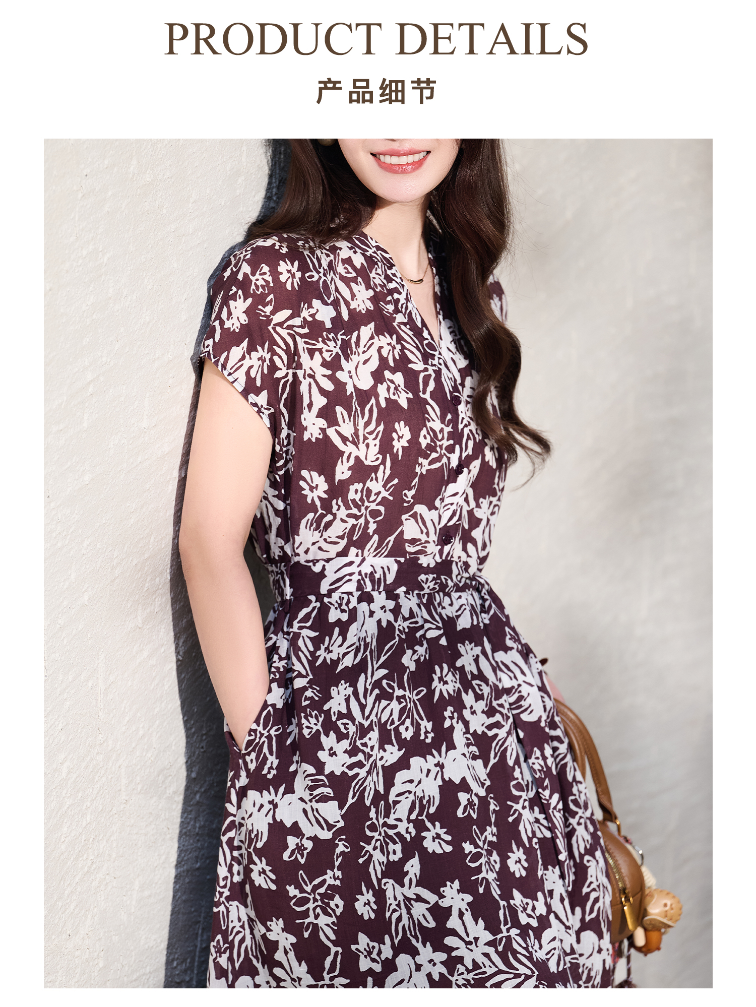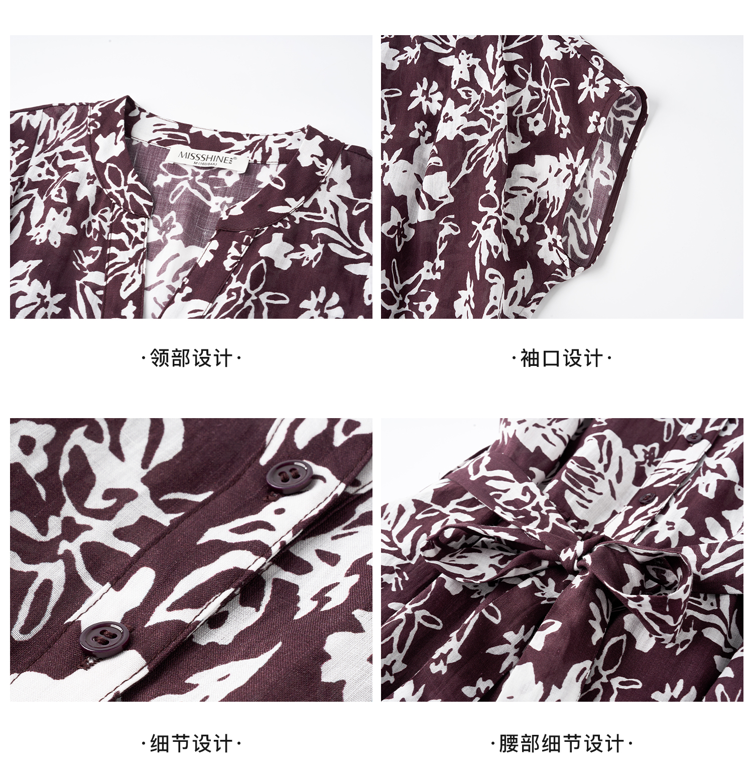 轻法式度假风"朗姆酒红" 苎麻天丝 米思阳2026夏新品复古印花小包袖A摆系腰连衣裙6149