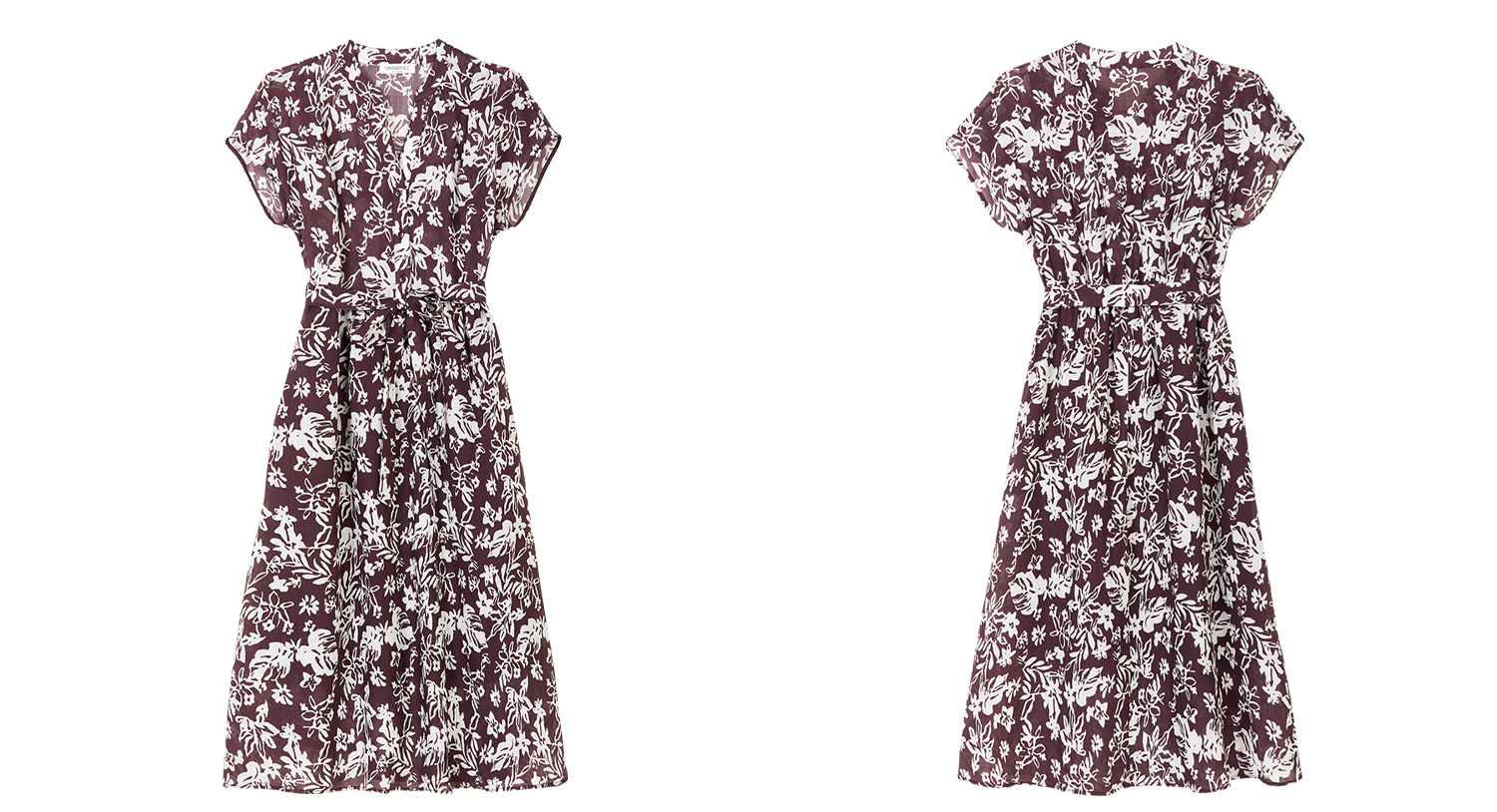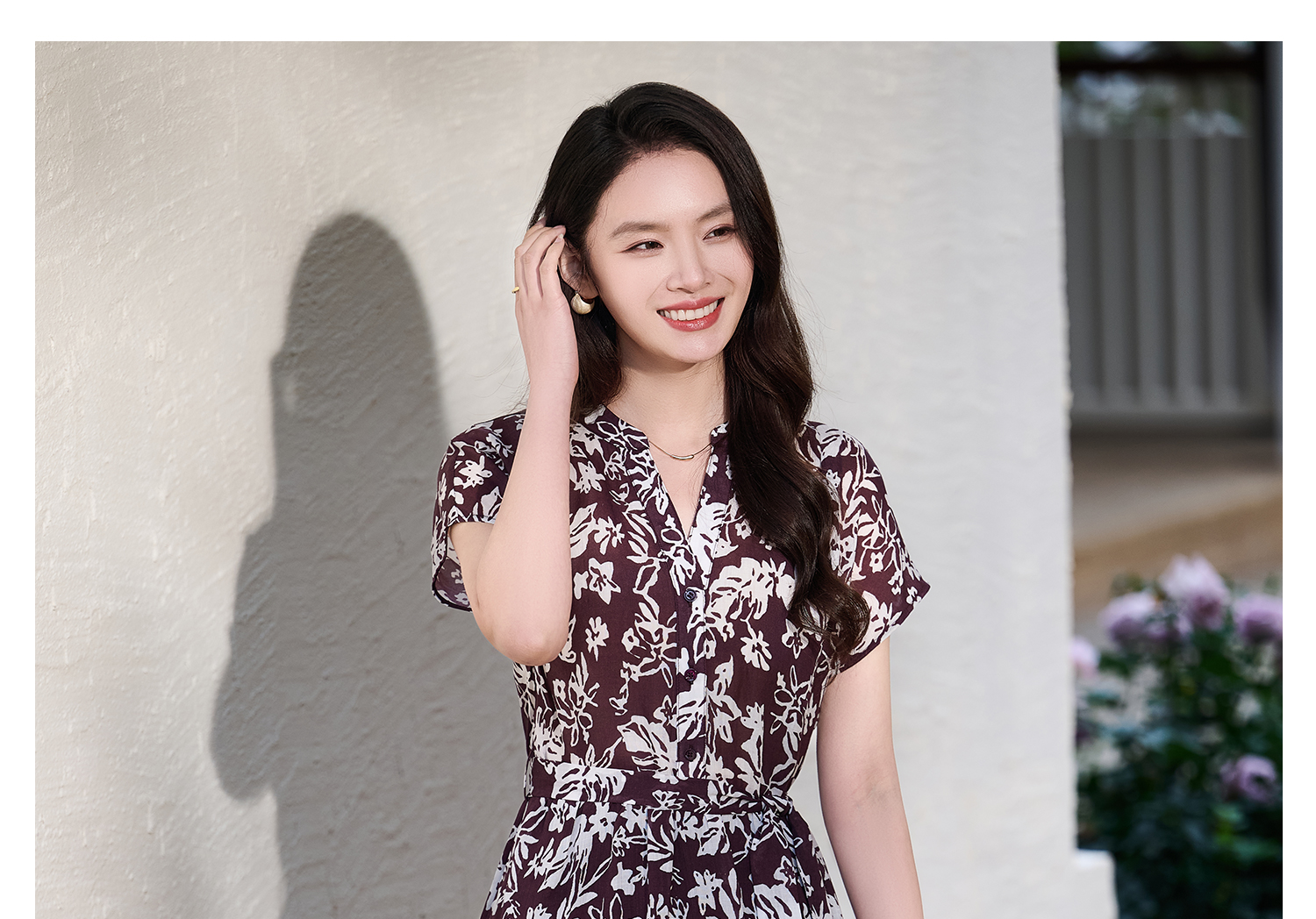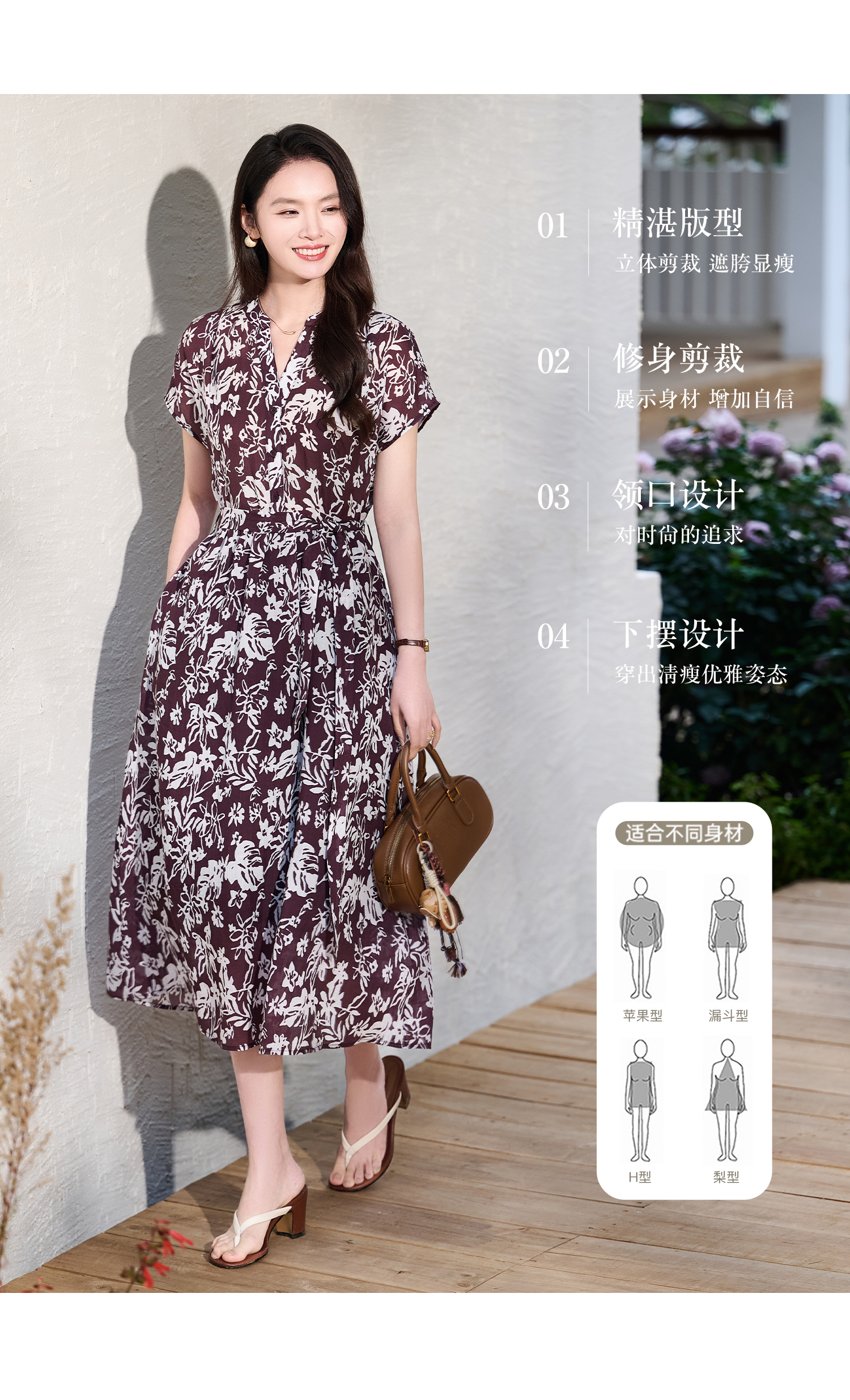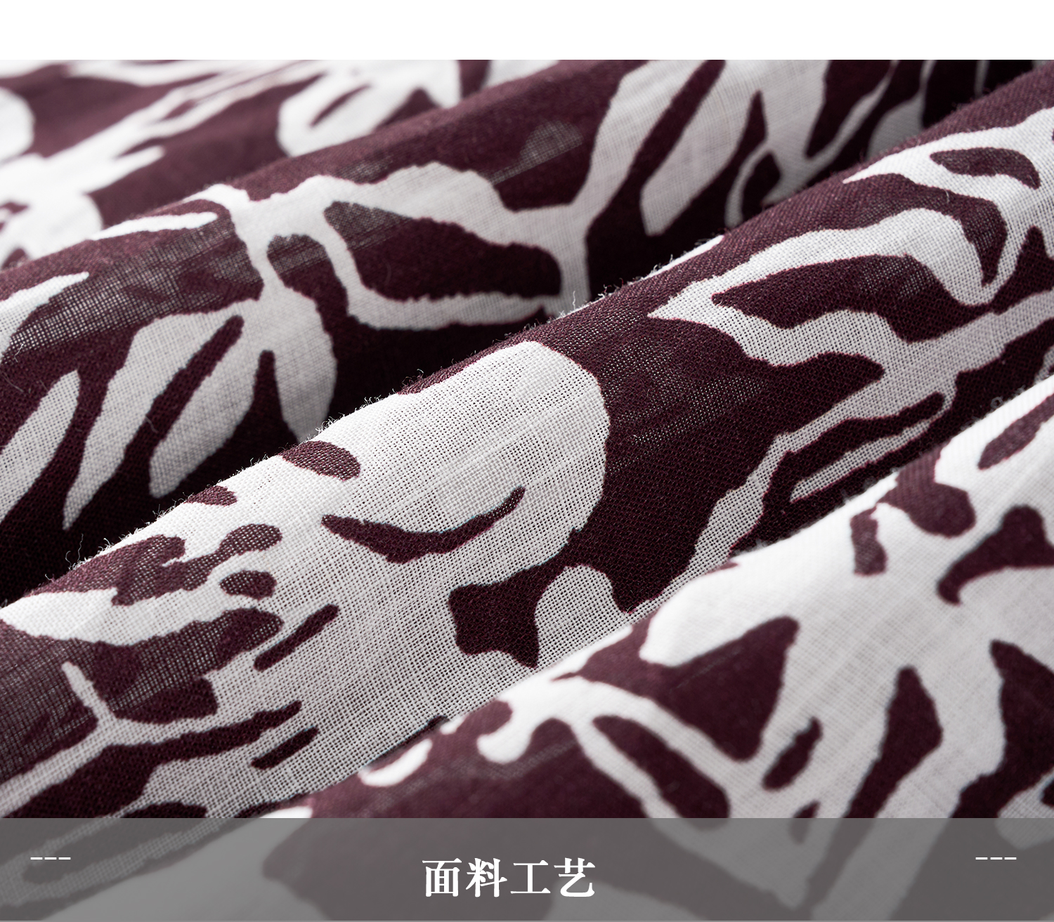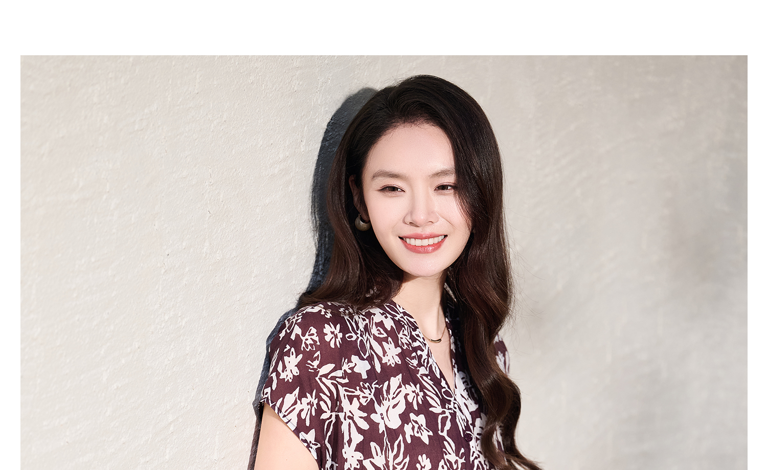 轻法式度假风"朗姆酒红" 苎麻天丝 米思阳2026夏新品复古印花小包袖A摆系腰连衣裙6149