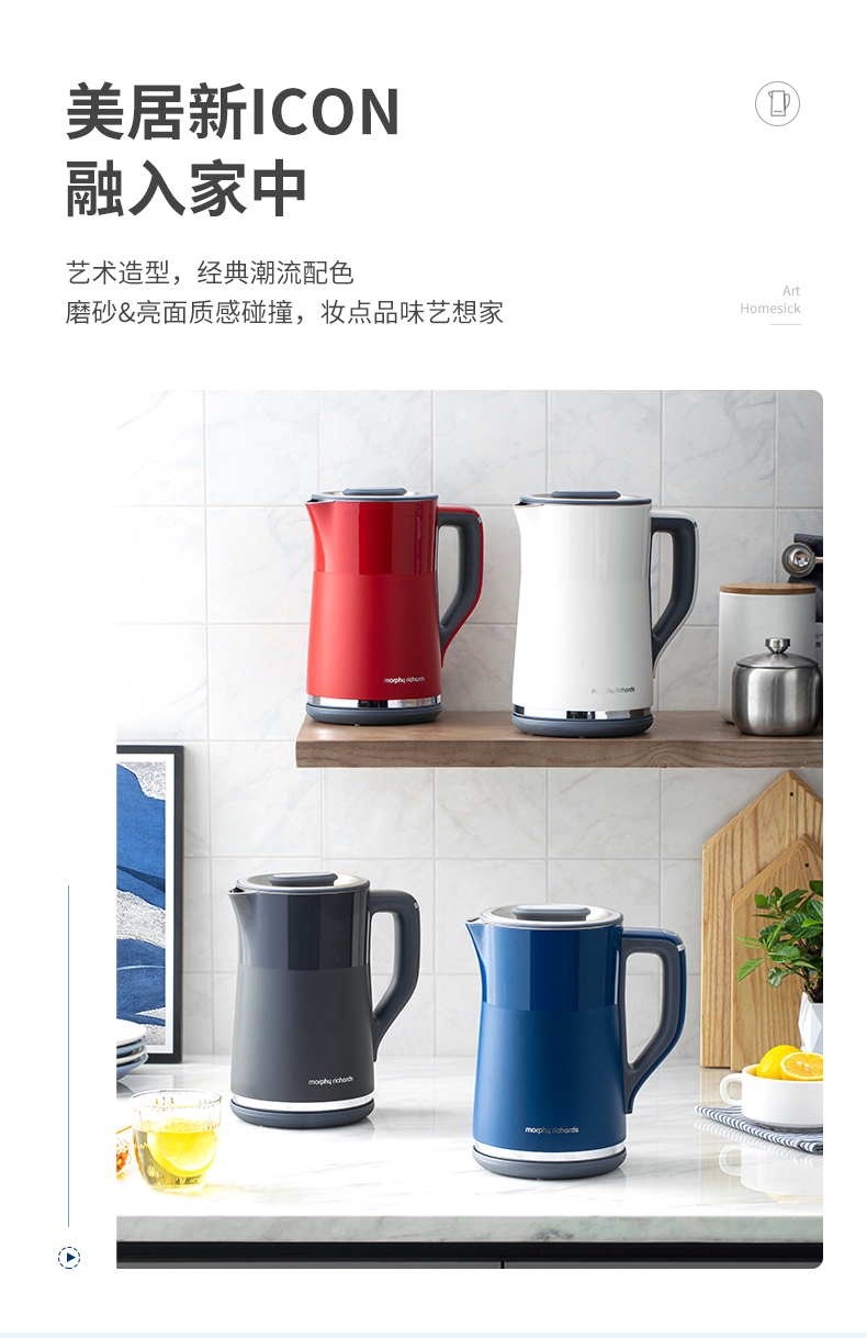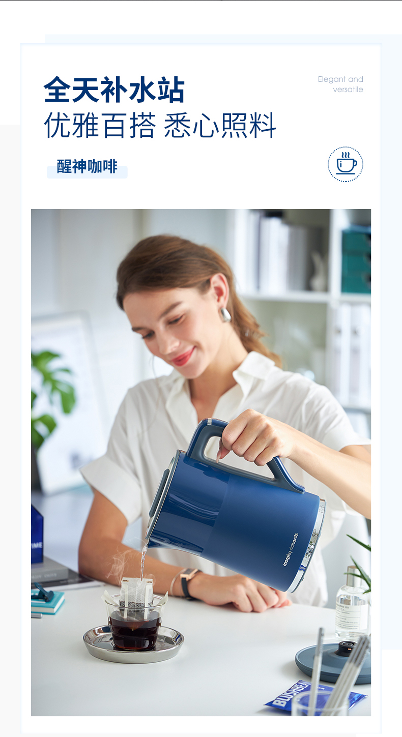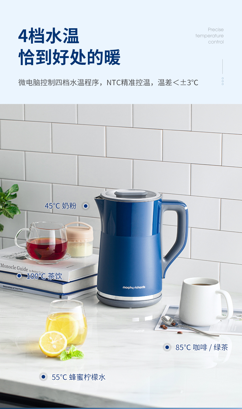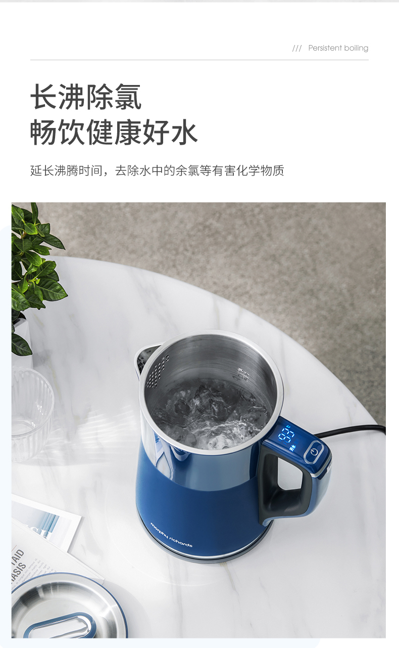 摩飞电器(Morphyrichards) 电热水壶1.5L实时显温烧水壶4档调温保温水壶MR6070 轻奢蓝