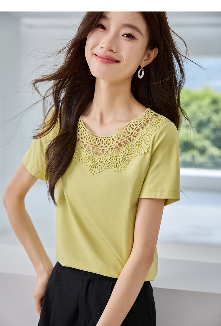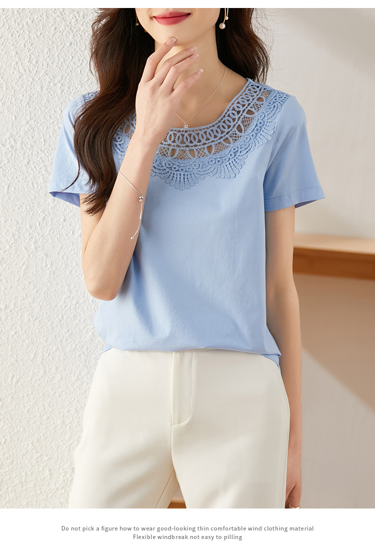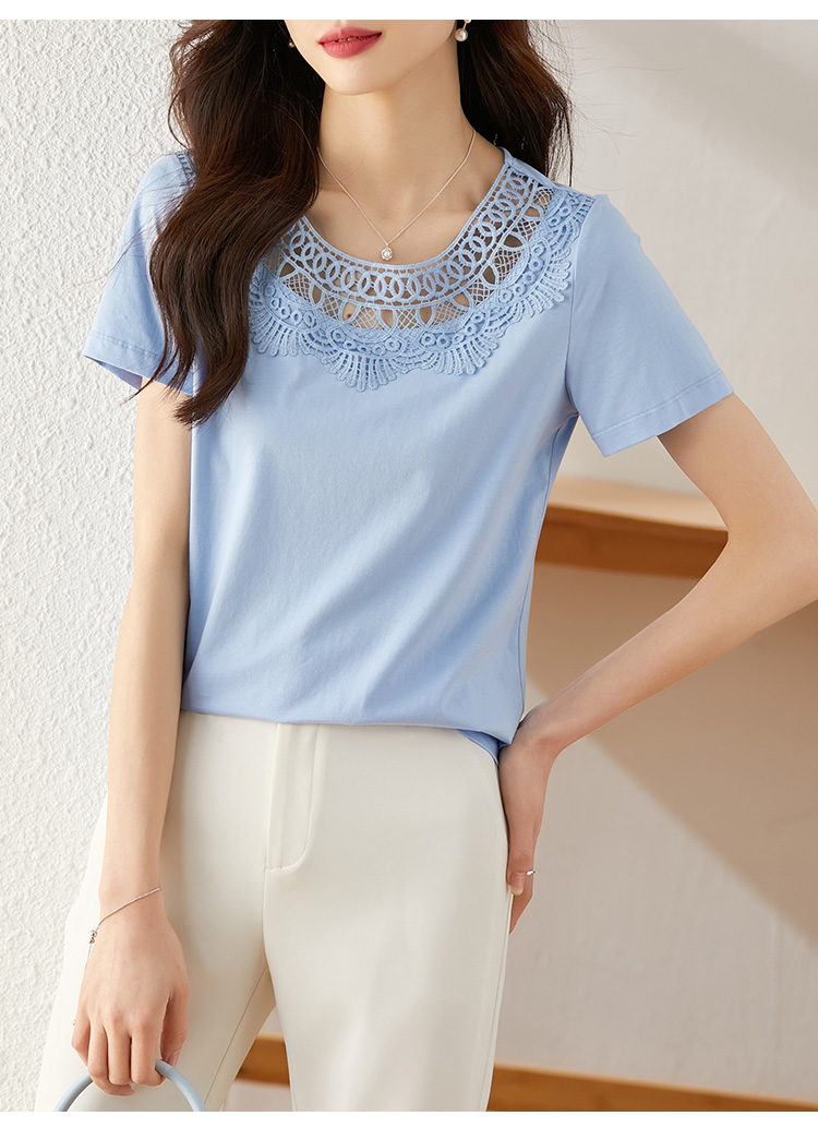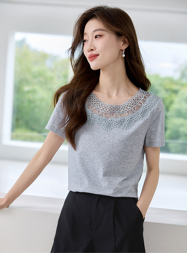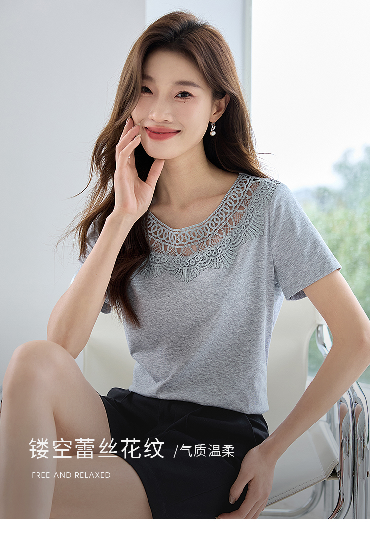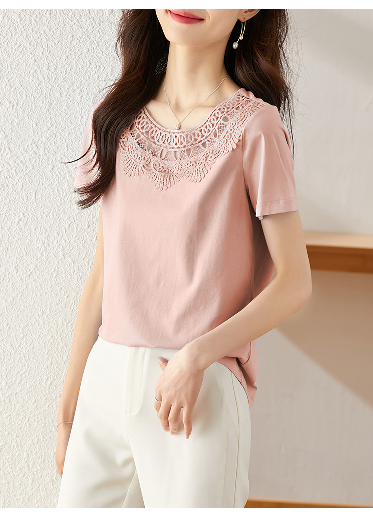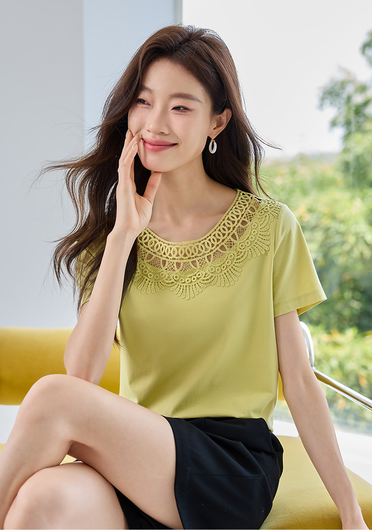 【专属特价】熙世界镂空蕾丝花纹圆领短袖T恤女气质时尚洋气小衫上衣2025夏