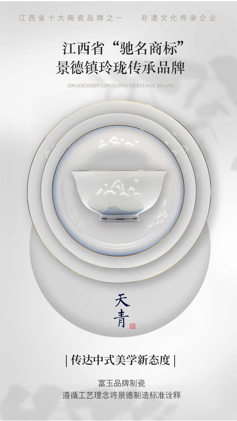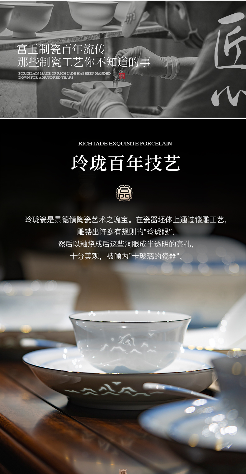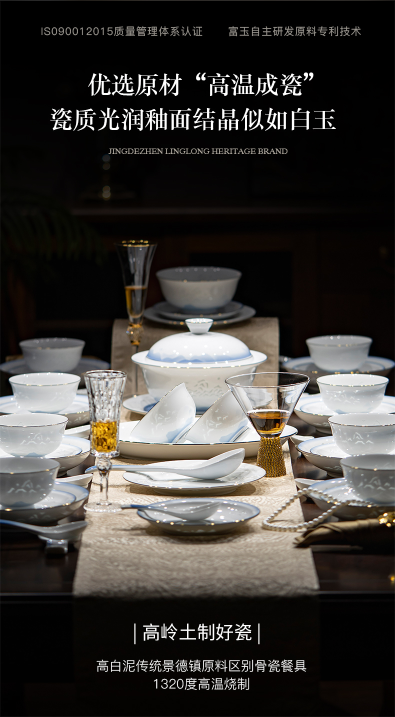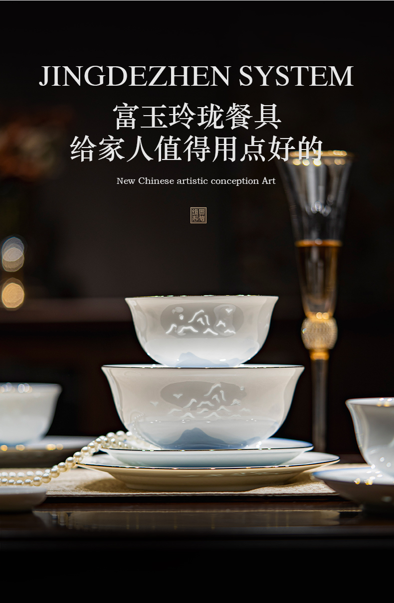 富玉 景德镇高温玲珑瓷餐具套装家用 新中式国风天青餐具礼盒装