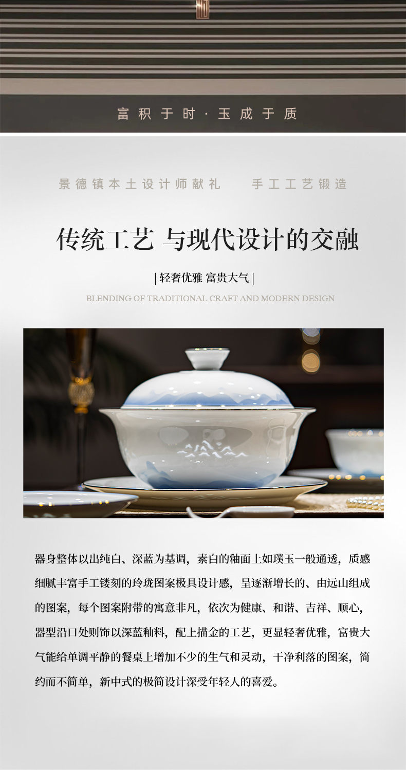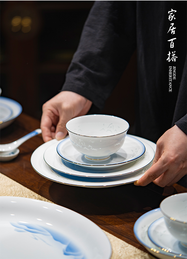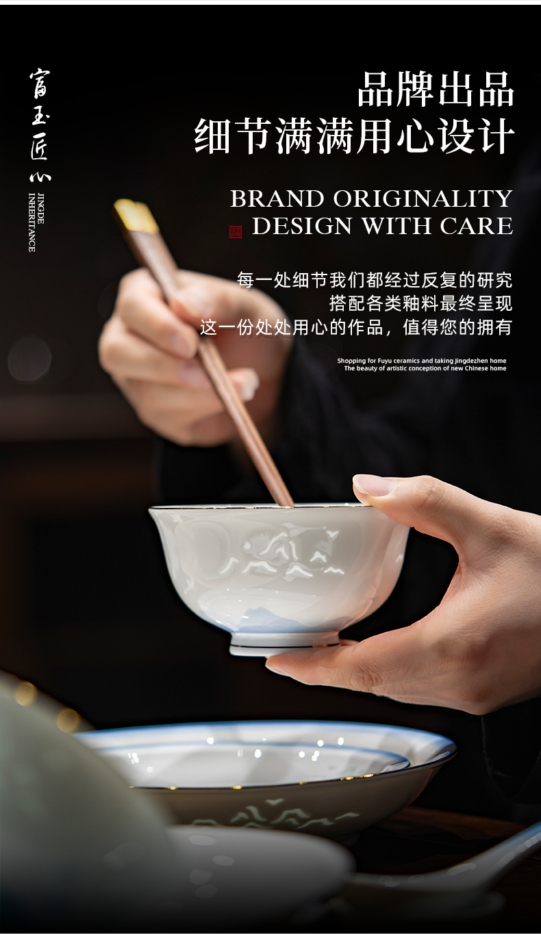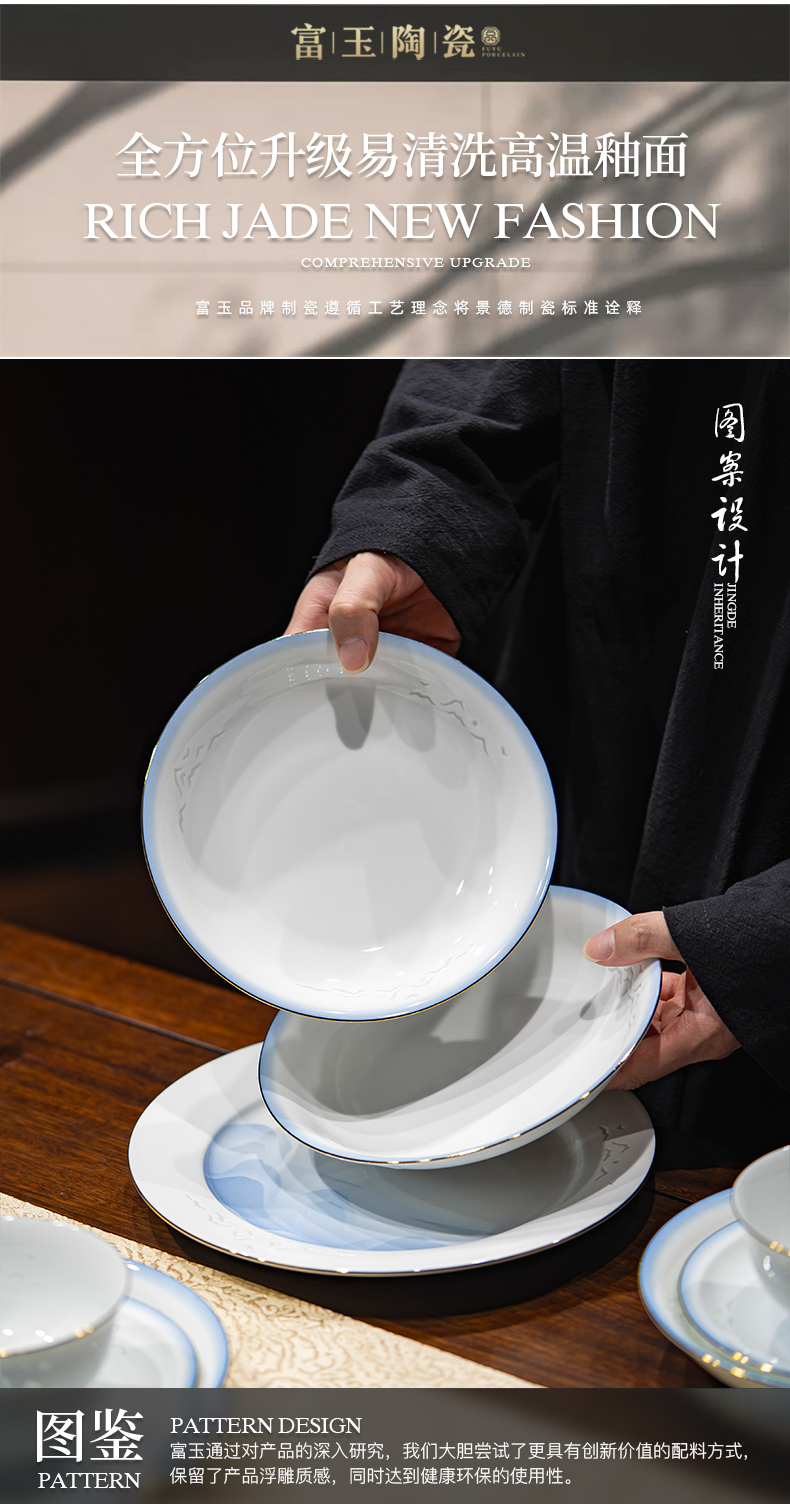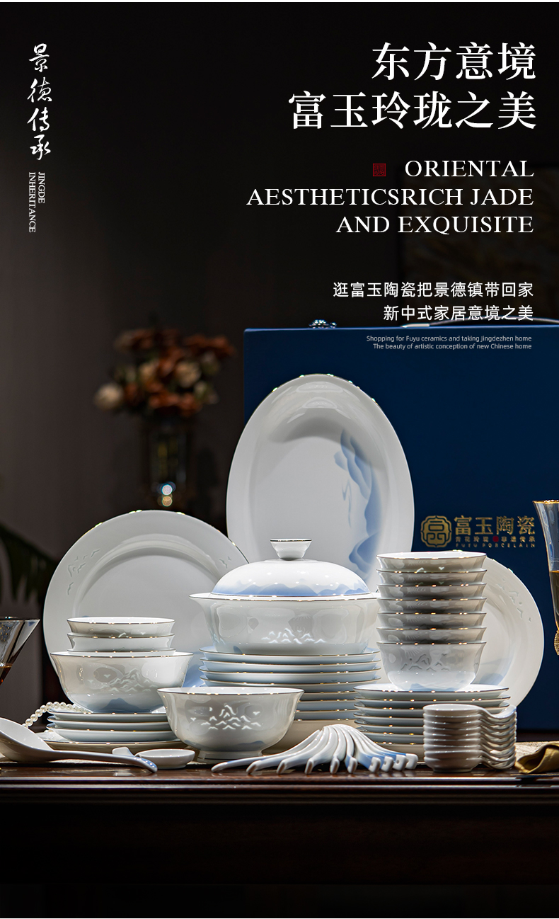 富玉 景德镇高温玲珑瓷餐具套装家用 新中式国风天青餐具礼盒装