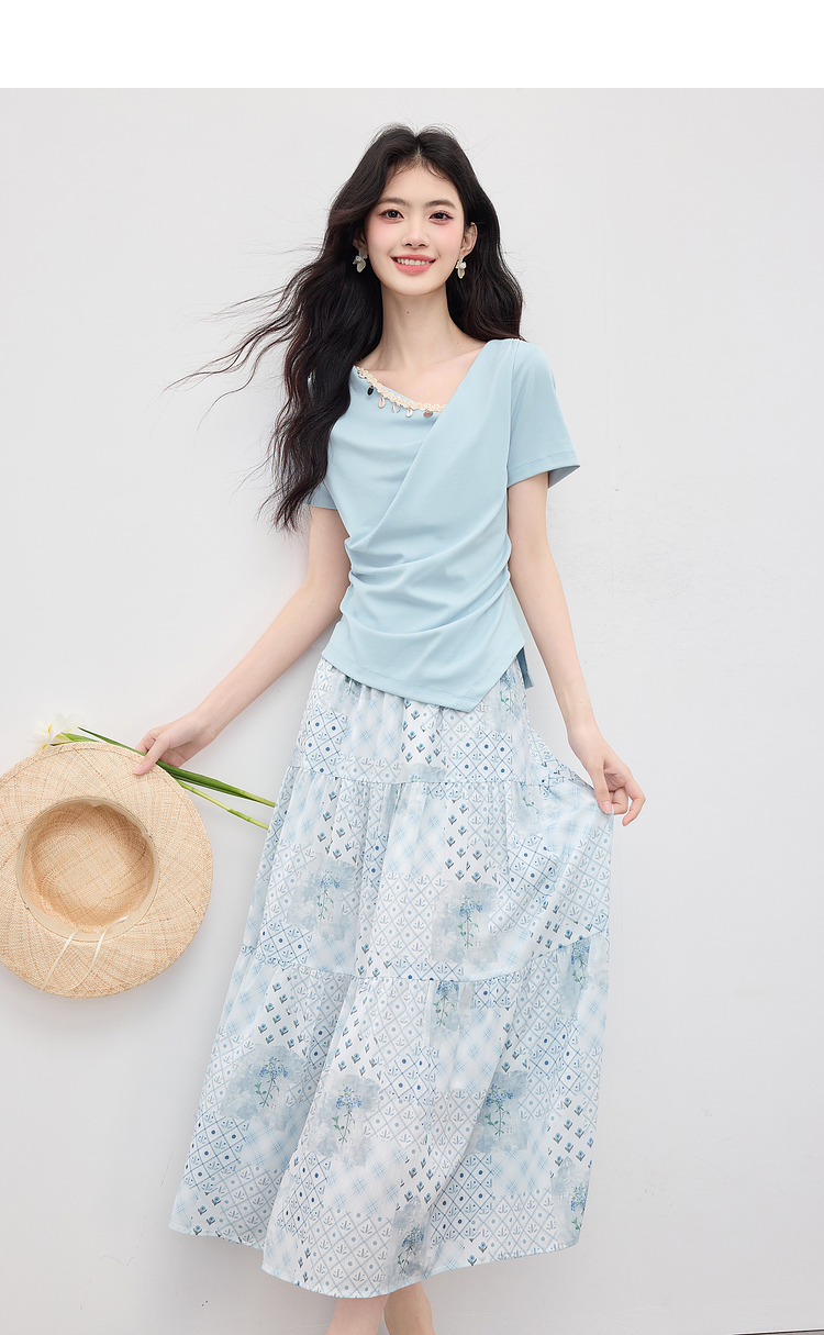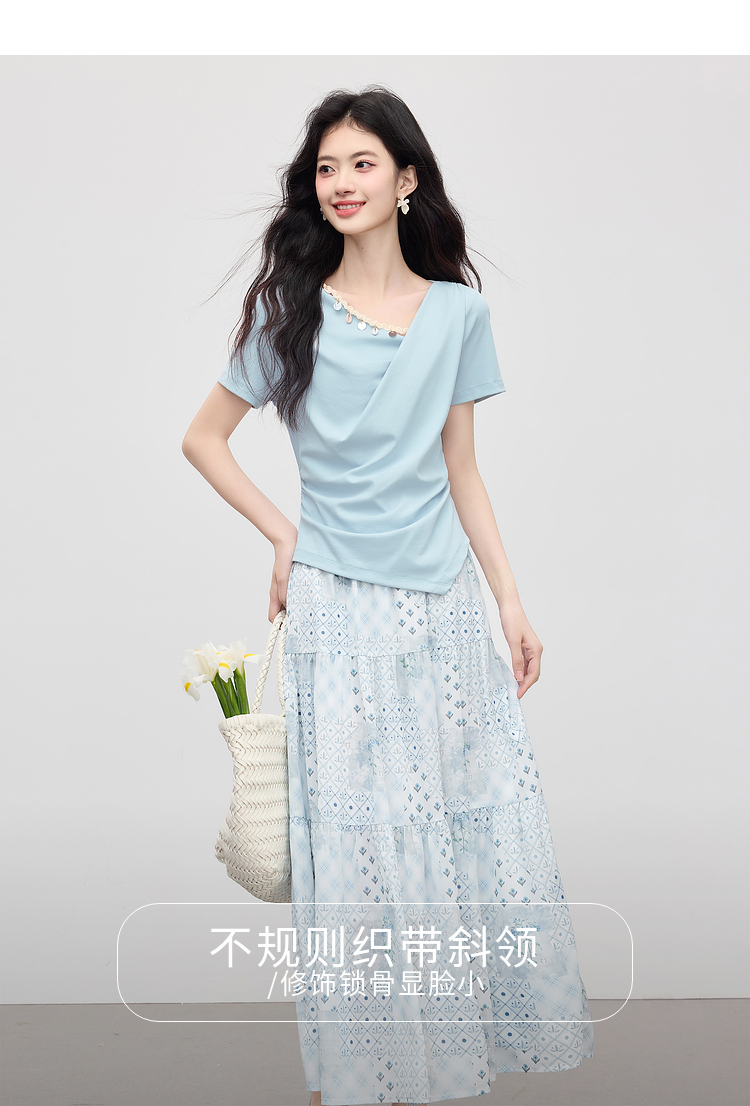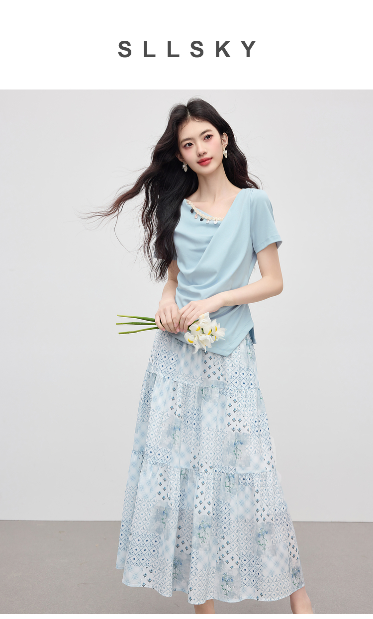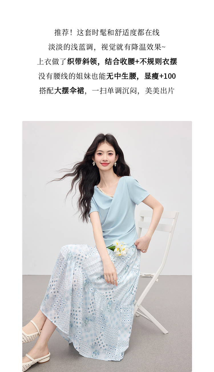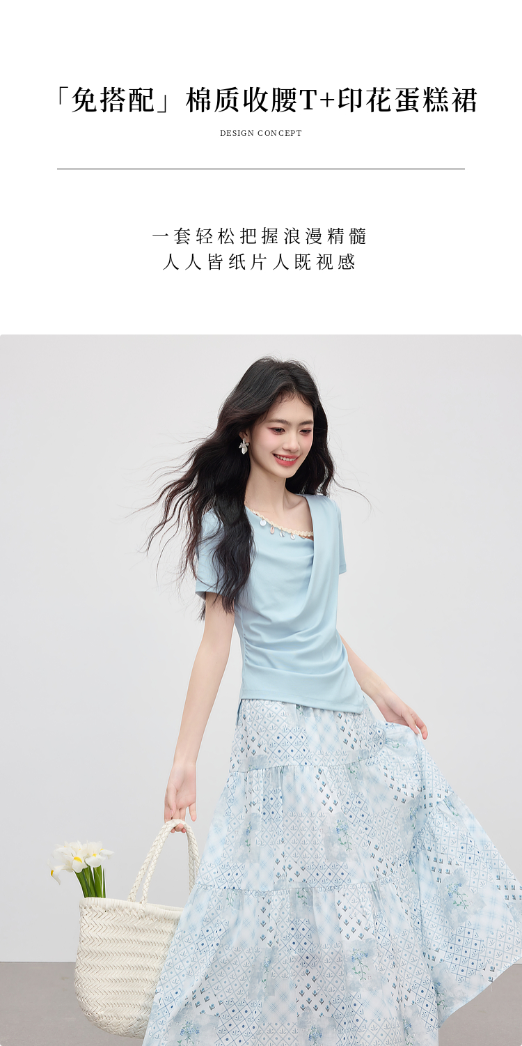 【周末秒杀】熙世界夏日独特漂亮套装裙女装新款收腰T恤印花蛋糕半身裙两件套