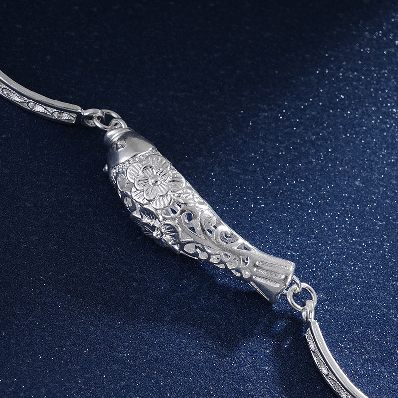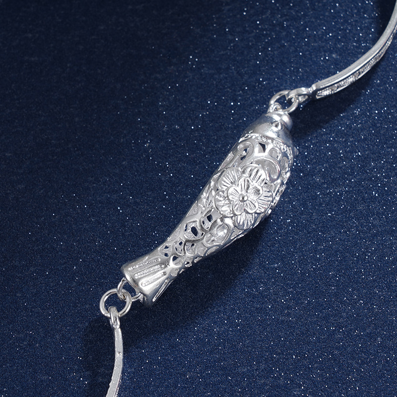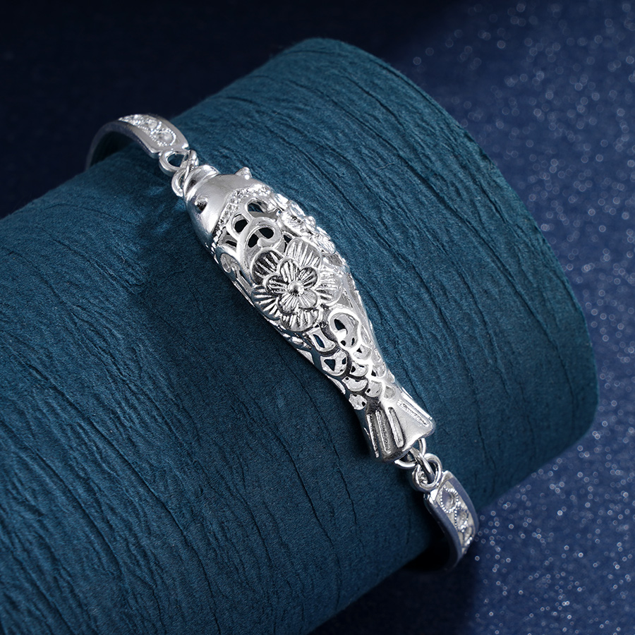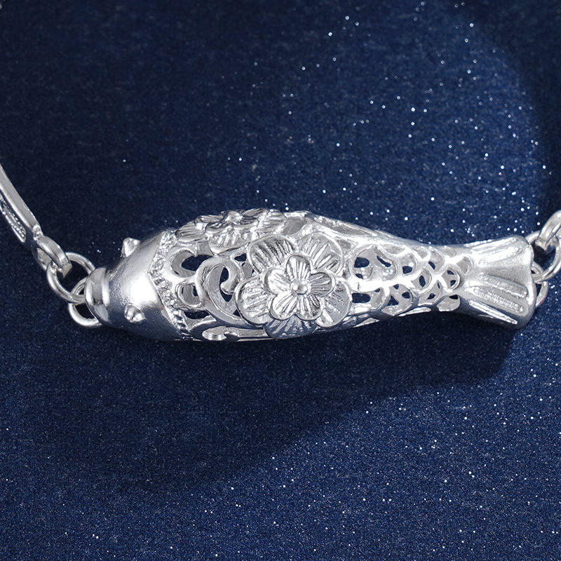【寓意】:“花鱼梦境” 手链采用花丝工艺,将鲤鱼与花朵组合,立体饱满,灵动祥和。蕴含和谐昌盛之意,寓意幸福美满。