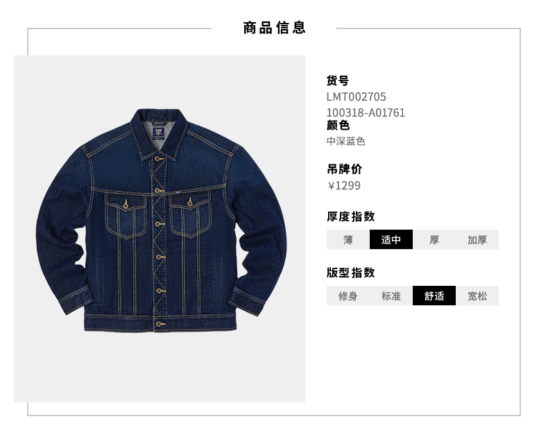 Lee商场同款101+22秋冬新品蓝色男牛仔夹克外套LMT002705100-761