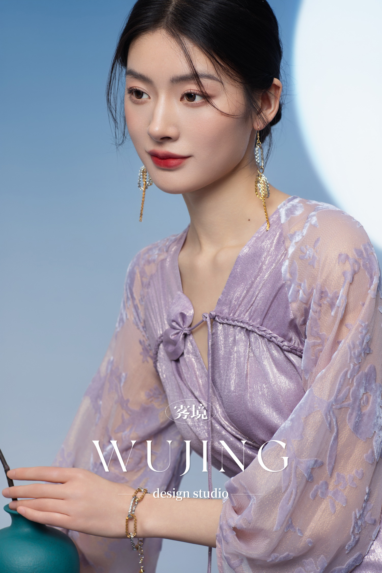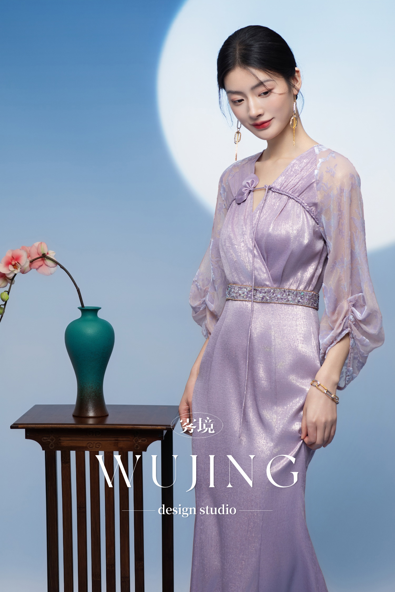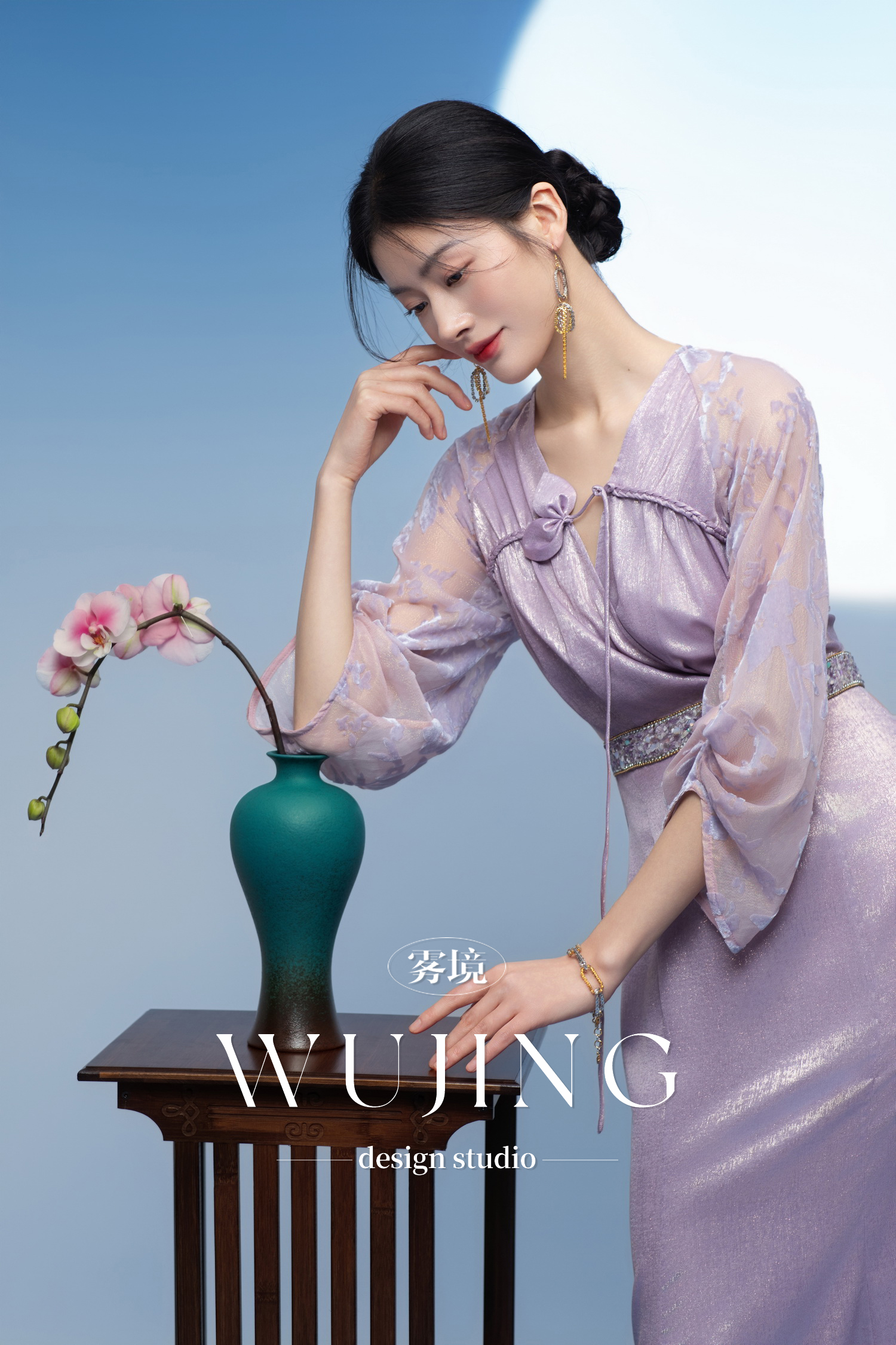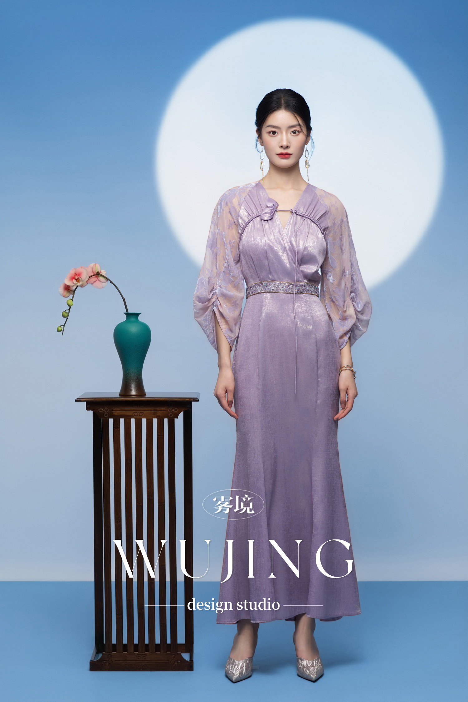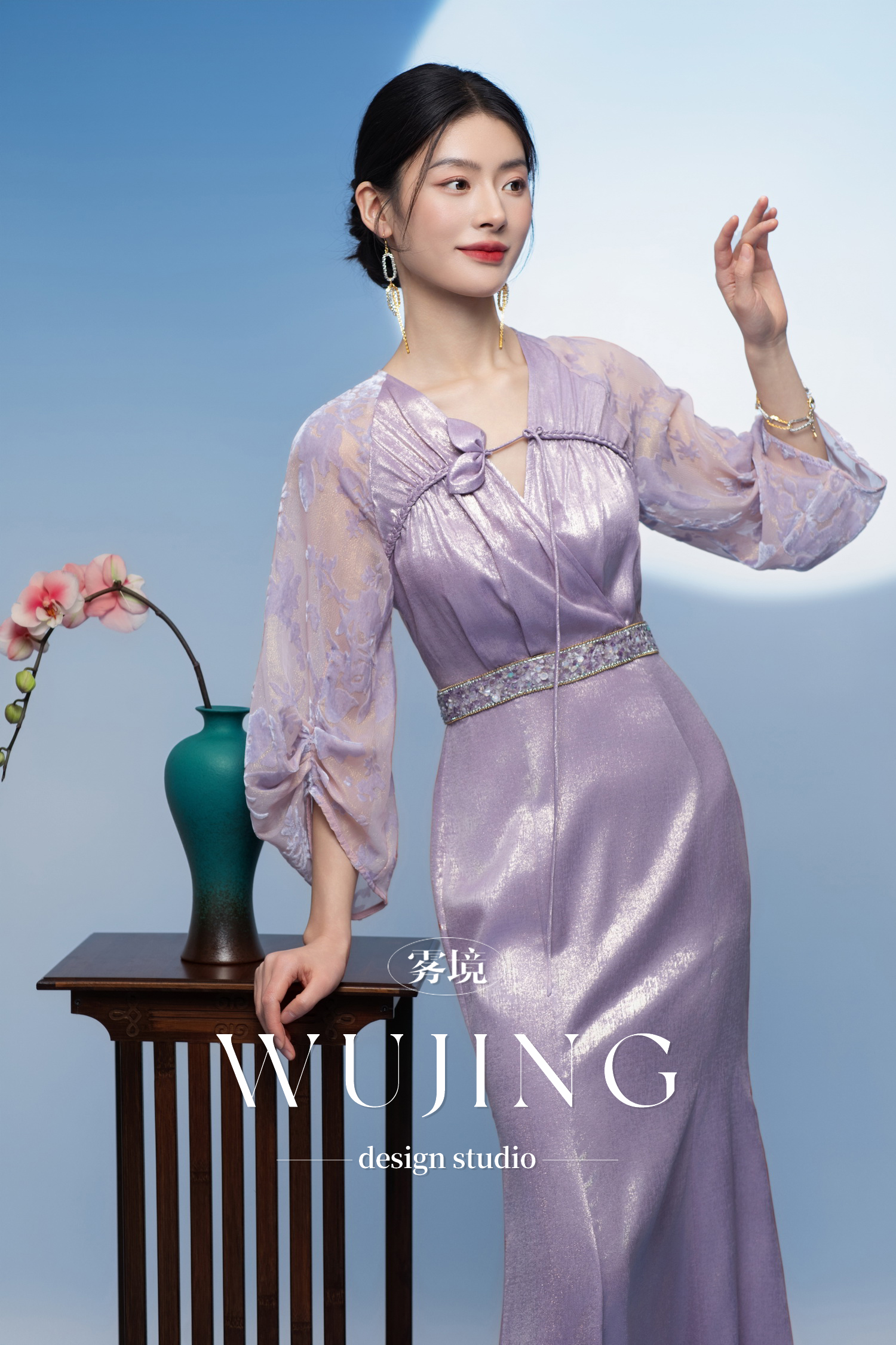 3205152 紫金梦雨 重磅仿真丝印花植绒料/重磅涂层工艺料连衣裙 雾境