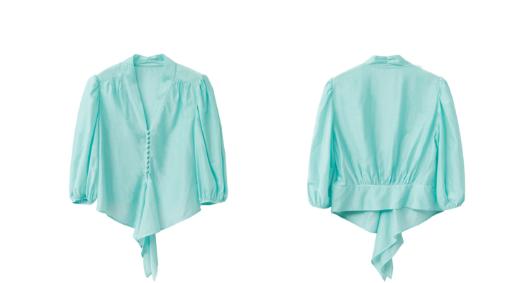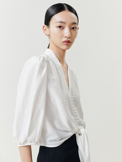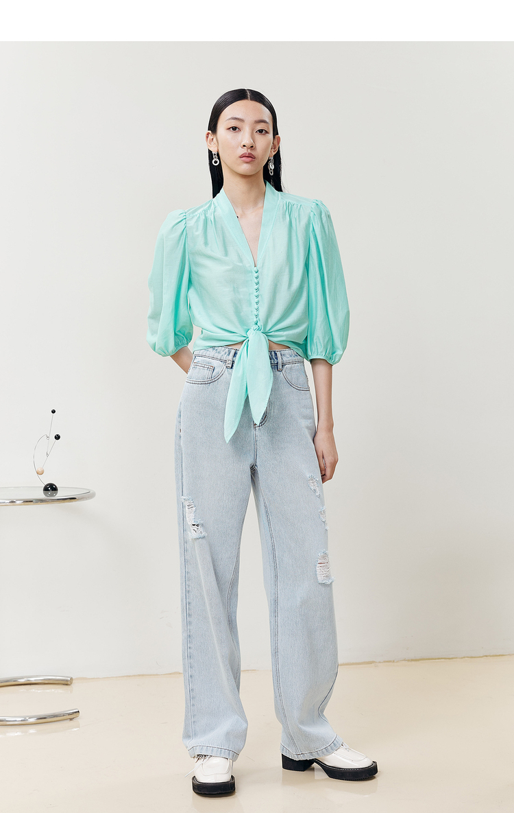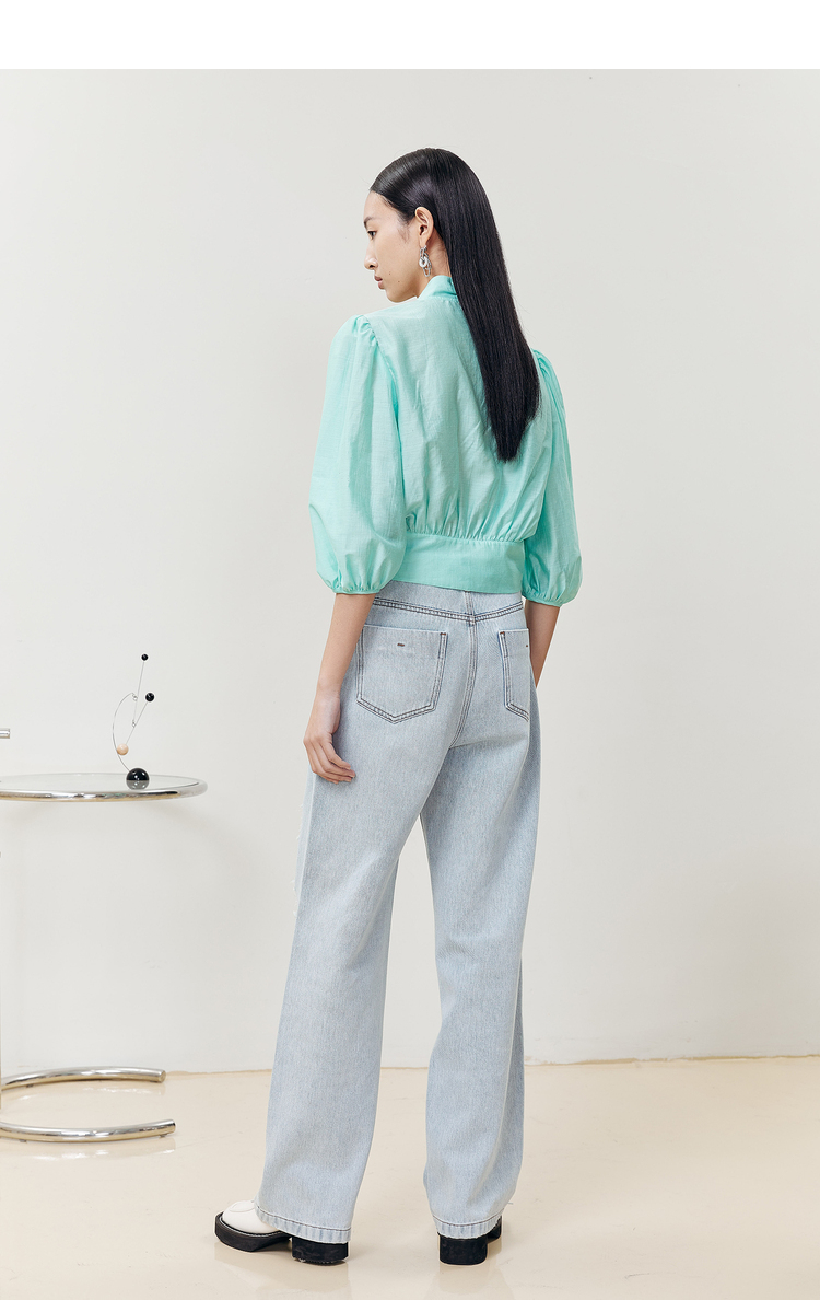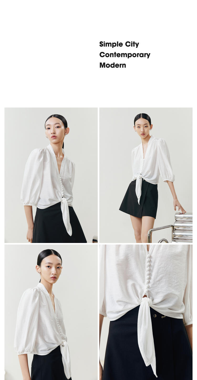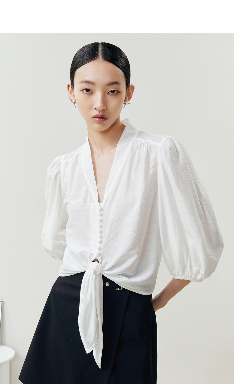 NEELLY纳俪商场同款气质立领白色衬衫女泡泡袖轻薄上衣系带下摆N22041B01007