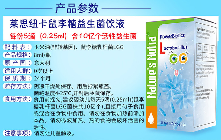 美国莱思纽卡LGG益生菌滴剂8ml(莱思纽卡任选2个包邮)