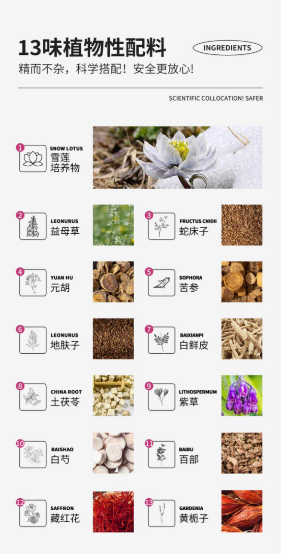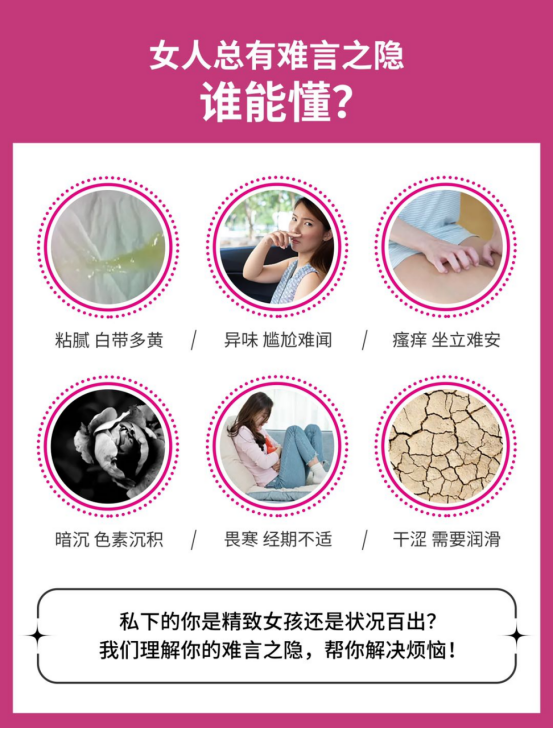 用“芯”呵护‼️科学添加十多种珍稀成分加乘🛑 蛇床子💃治滴虫性阴道炎、阴部瘙痒~ 白芍💃治白带黄稠、气味腥臭~ 元胡💃治尿痛、急慢性阴道炎~ 益母草💃治月经不调、痛经、月经量少~ 藏红花💃活血通经,治血滞闭经~
