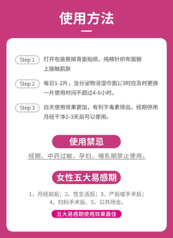 雪莲贴使用方法🔥 🔥 初期一天2-3片、贴于内裤上,6到8小时更换一次。打湿面积超过1/3一定要更换!经期停用,月经干净两三天后可以用❤️ 【女性五大易感期】1月经前后、2、性生活后3、产后或手术后、4、妇科手术后、5、公共场合。五大易感期使用效果最佳