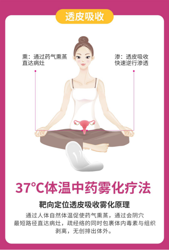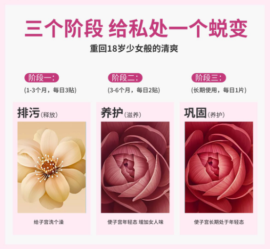 用“芯”呵护!中药层均匀扎实! 超细腻的中药小分子粉末,雾化吸收! 三个阶段,给私处一个蜕变