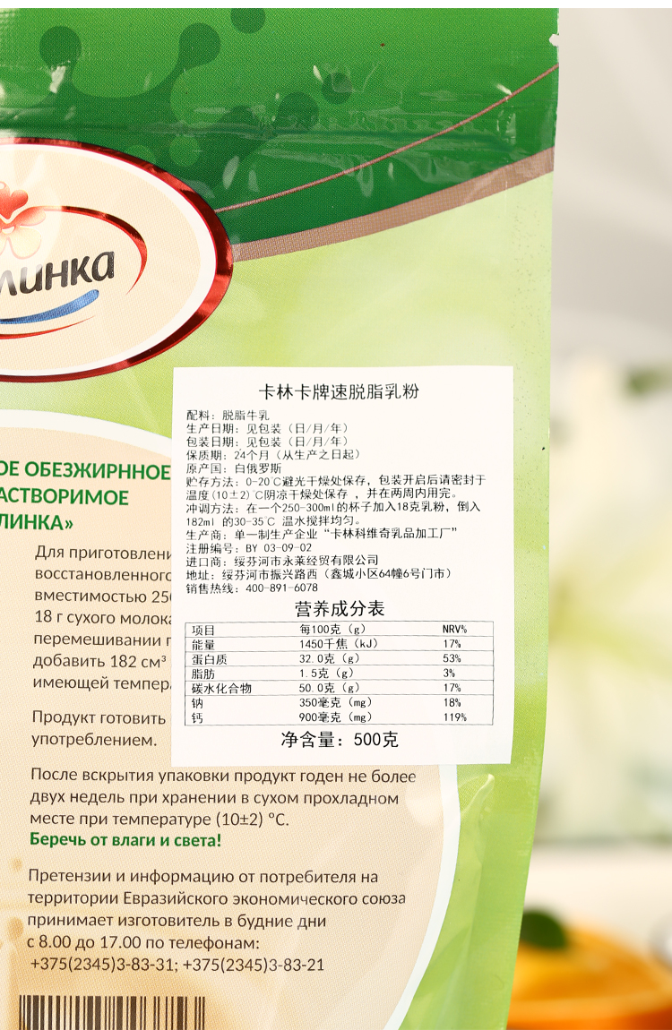 【中欧班列精选】白俄罗斯原装进口卡林卡无蔗糖低脂高钙成人乳粉 袋装 500g/袋 新日期