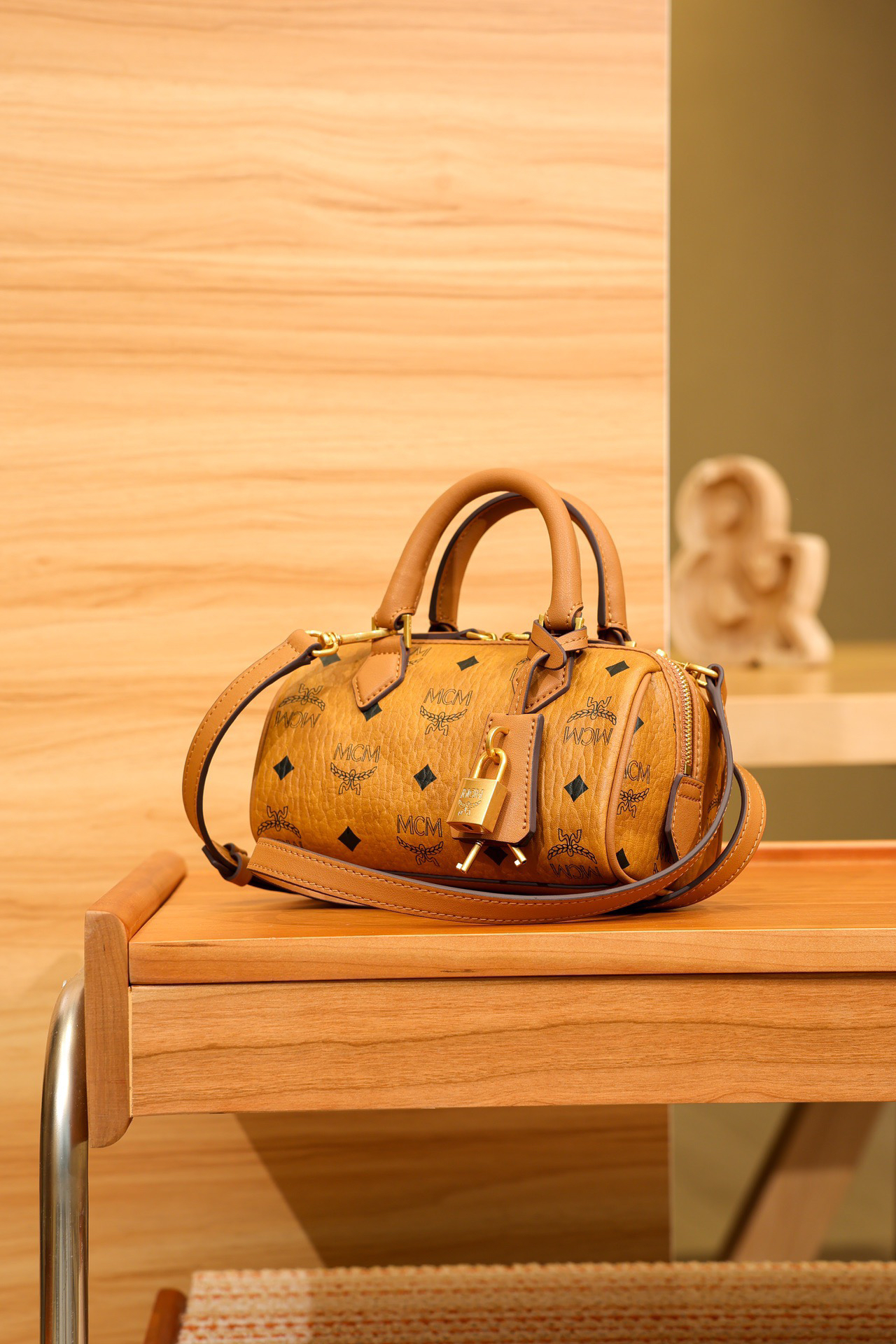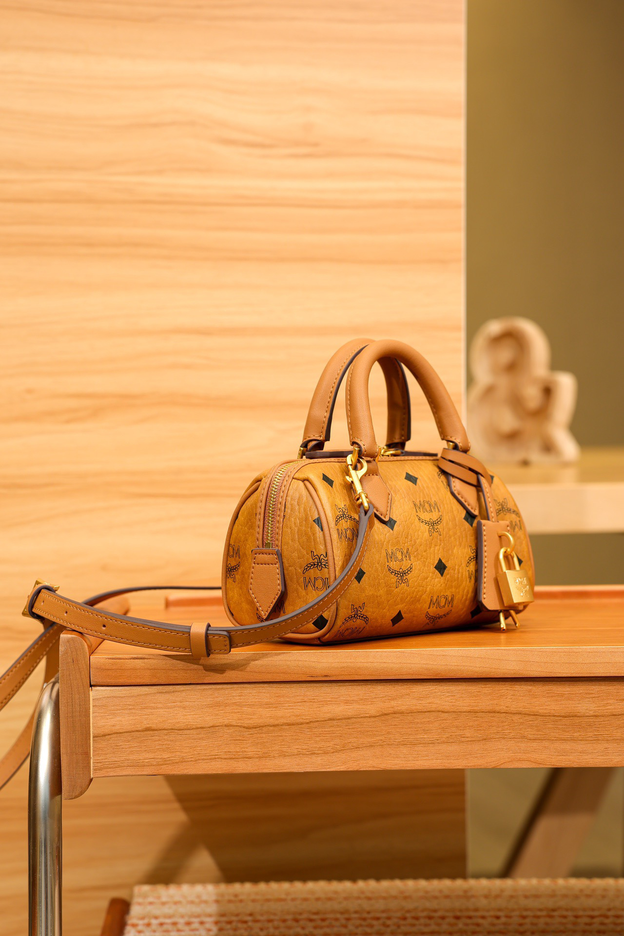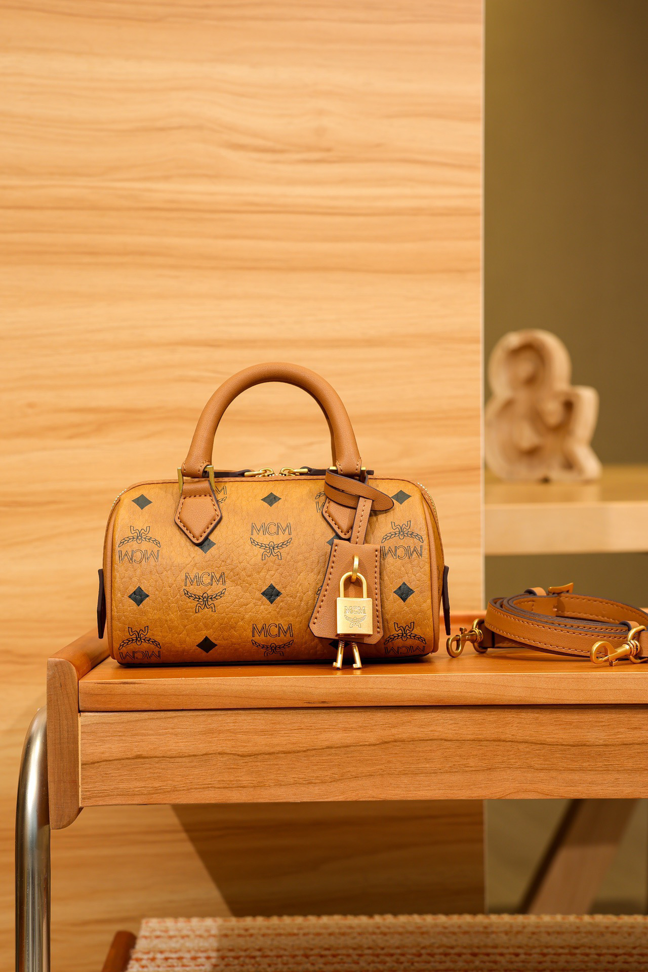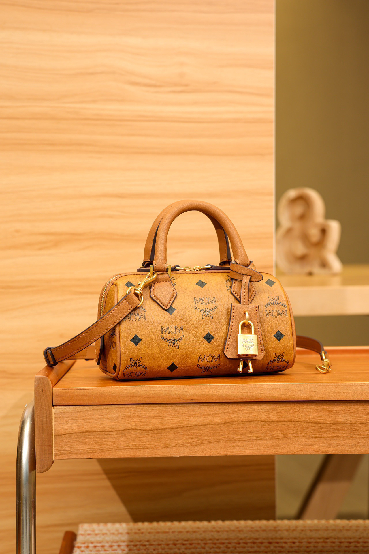 秋冬特惠💰780 原单MCM 原厂皮 新款干邑色Mini 波士顿挂锁包MWBESEA01CO001 老花满印 这款迷你Ella波士顿包