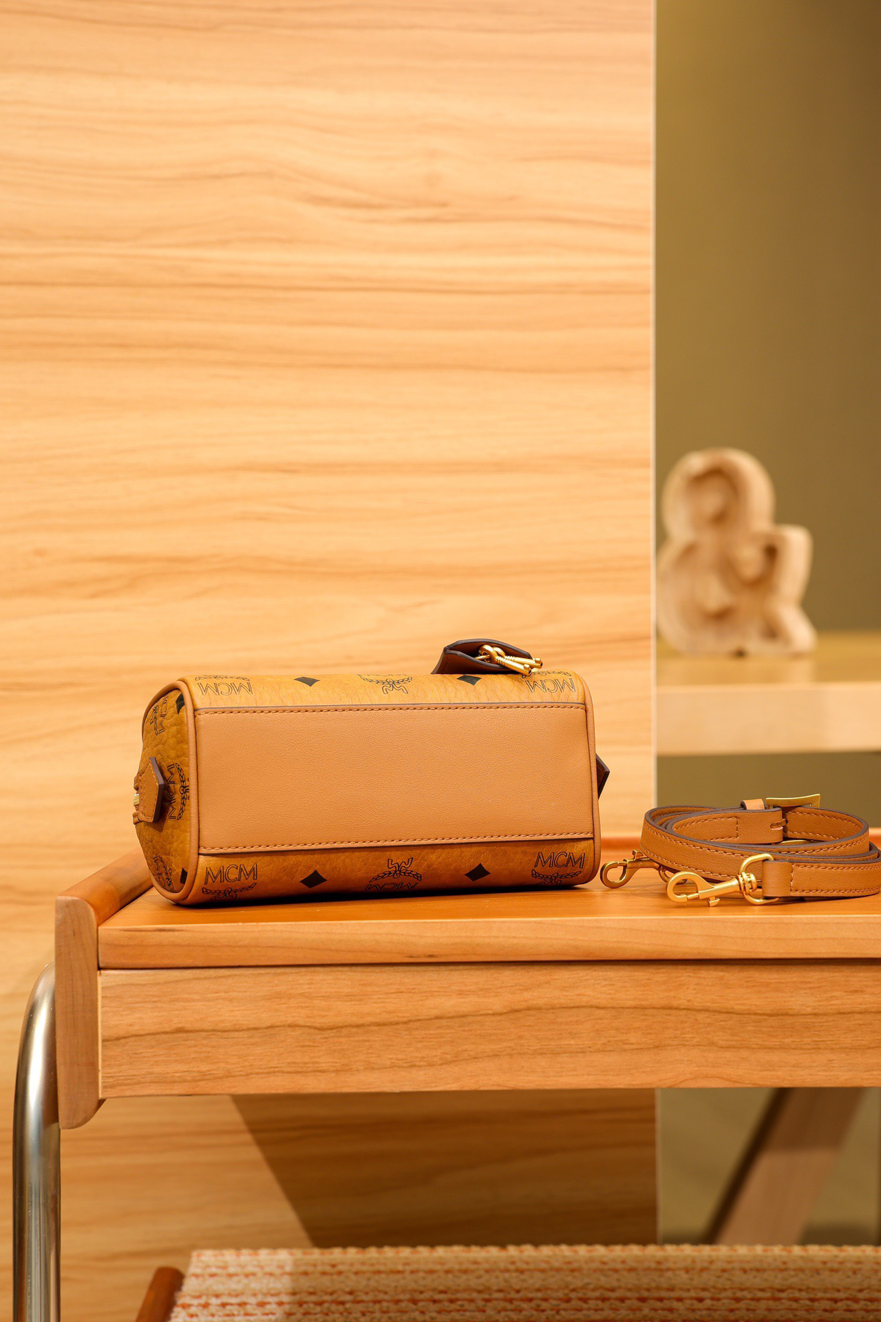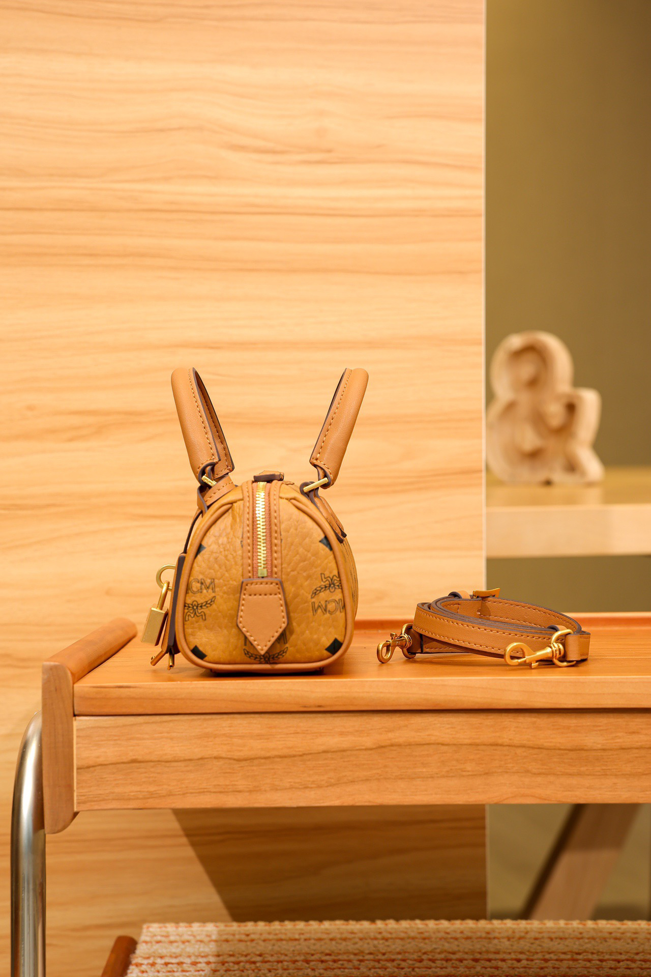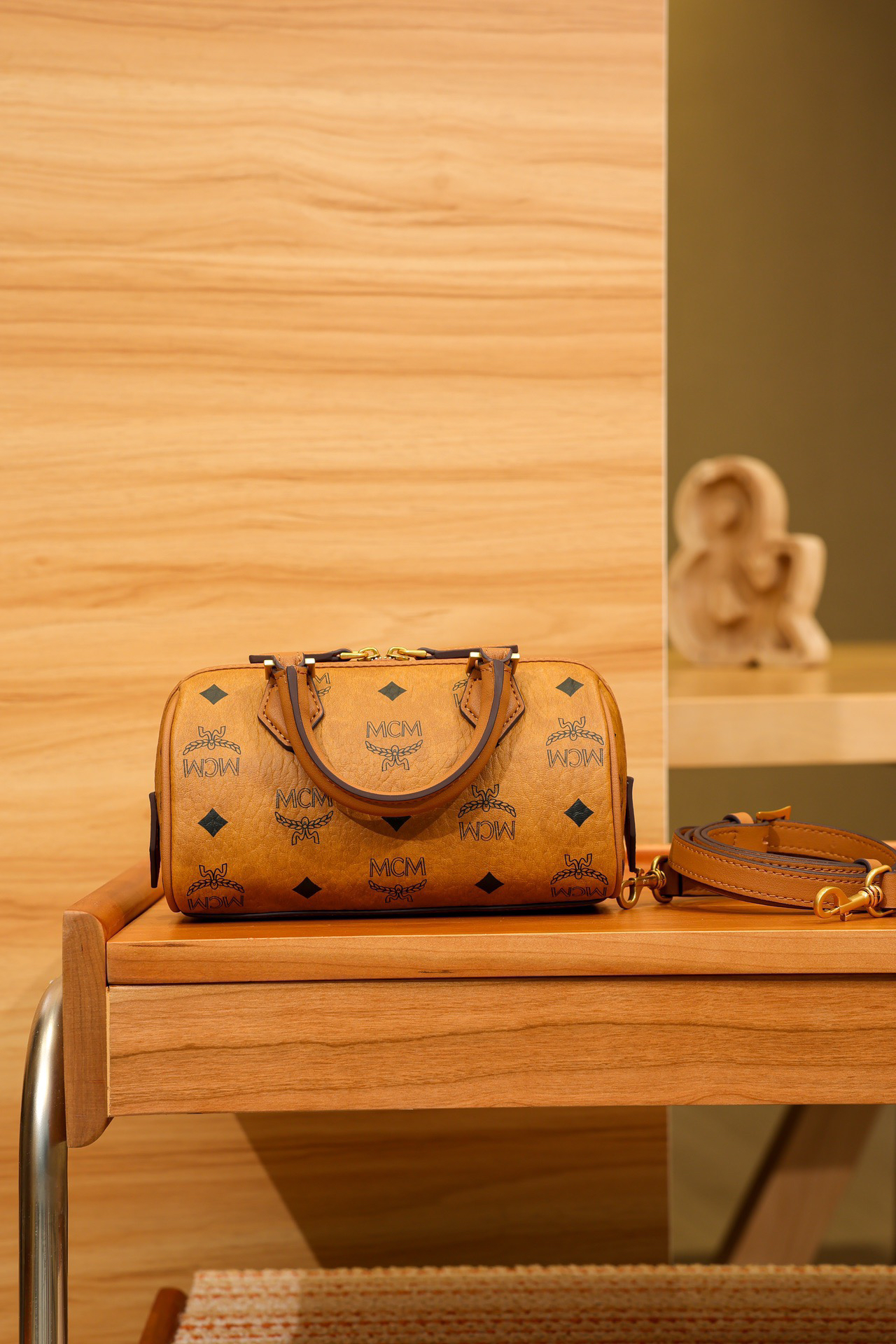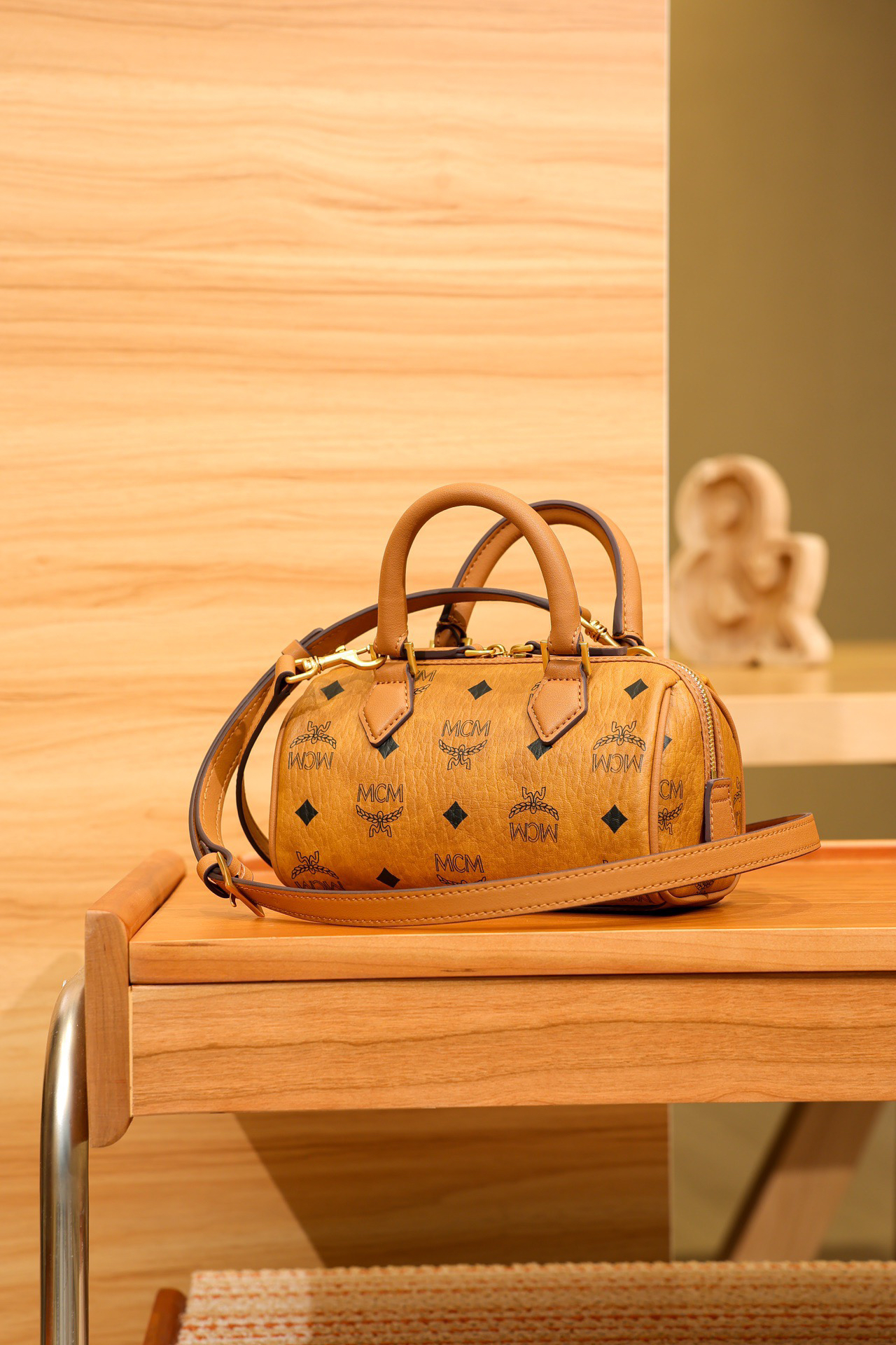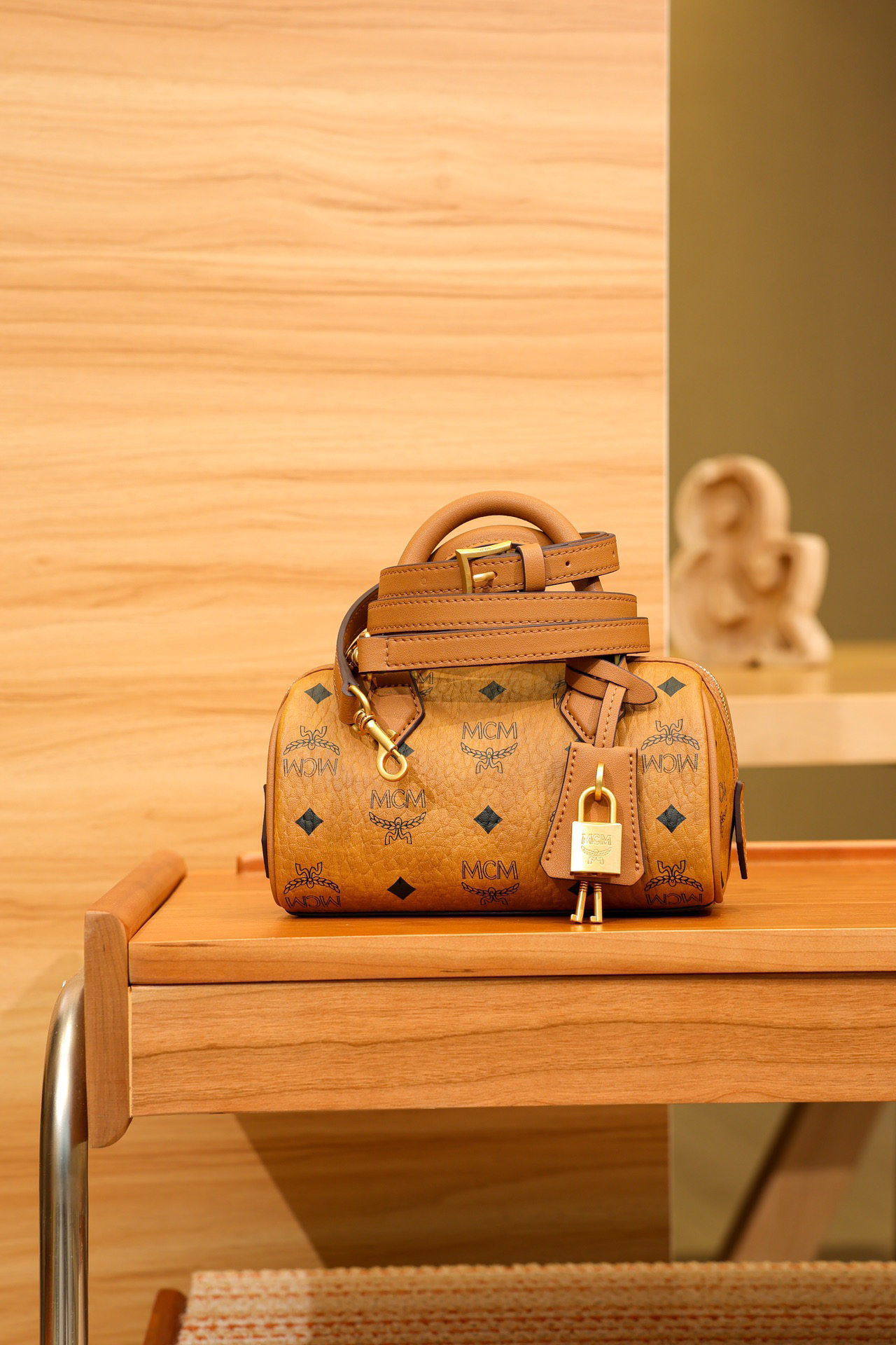秋冬特惠💰780 原单MCM 原厂皮 新款干邑色Mini 波士顿挂锁包MWBESEA01CO001 老花满印 这款迷你Ella波士顿包