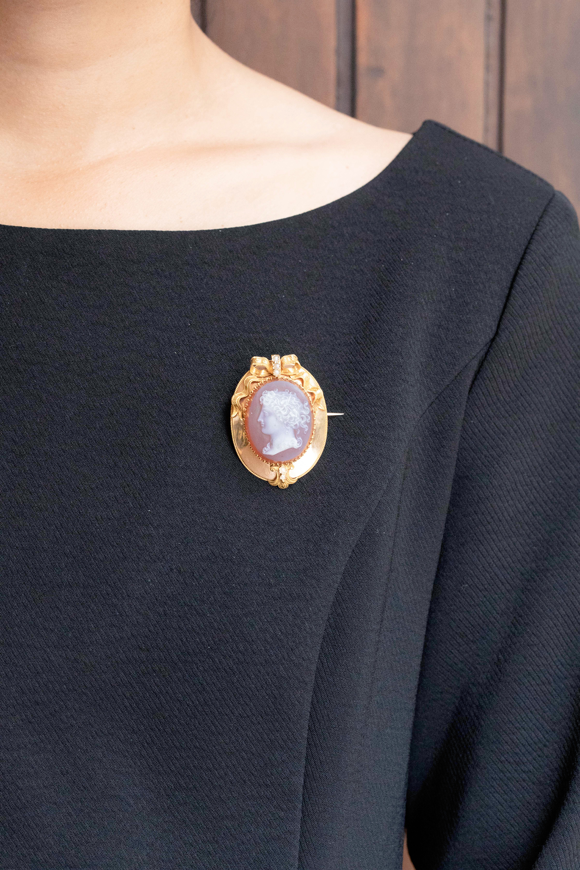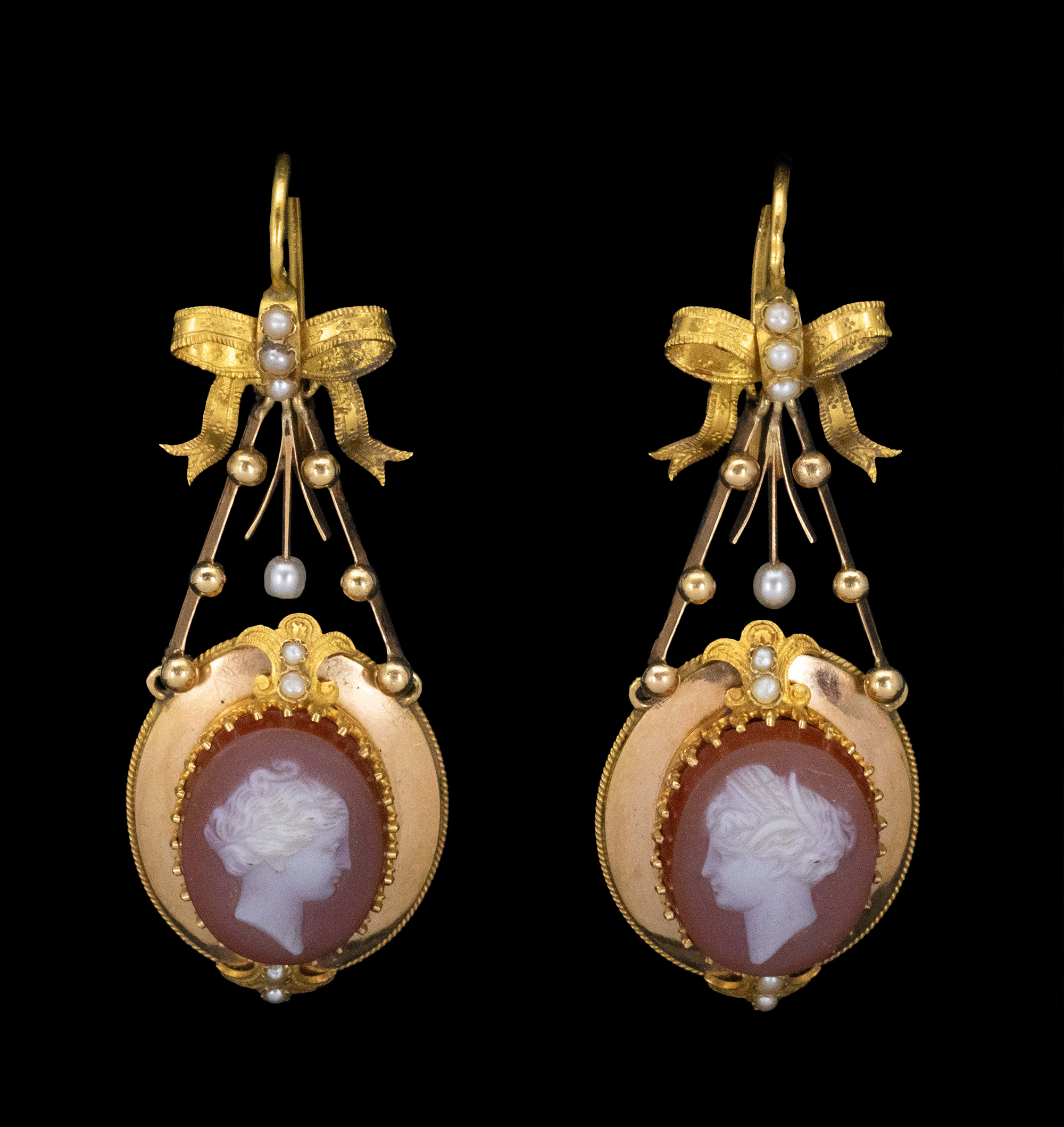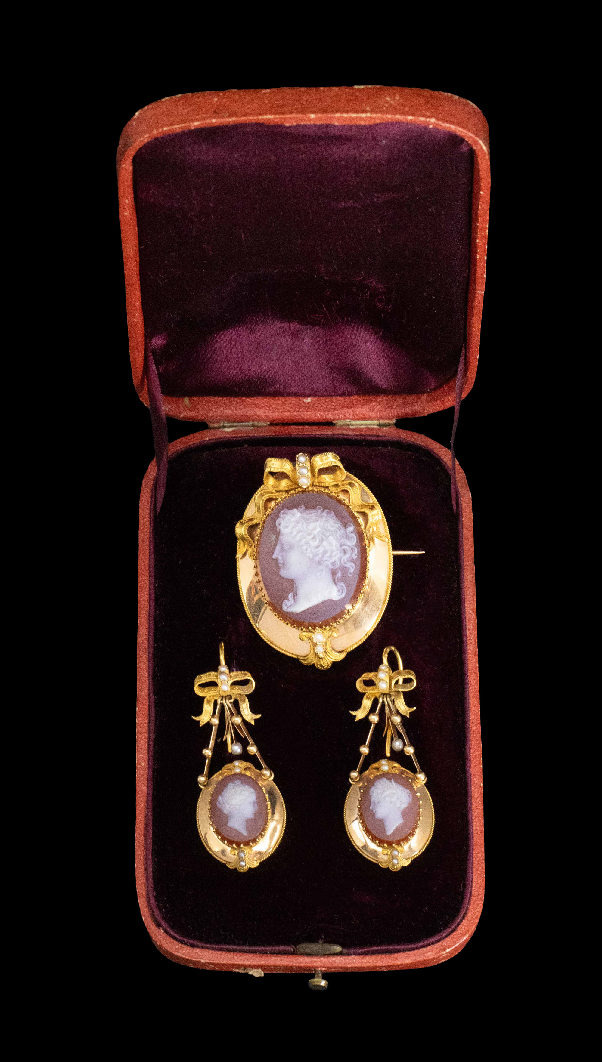 1850-1870年代法国拿破仑三世时期出品蝴蝶结造型18K黄金镶嵌天然海水珍珠及古典女神主题卡梅奥玉髓浮雕耳环及胸针套件