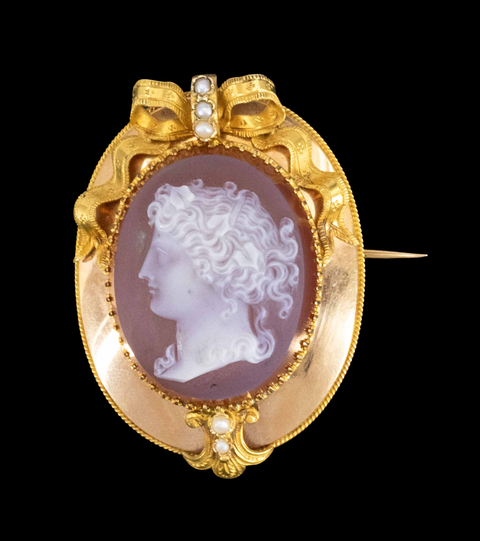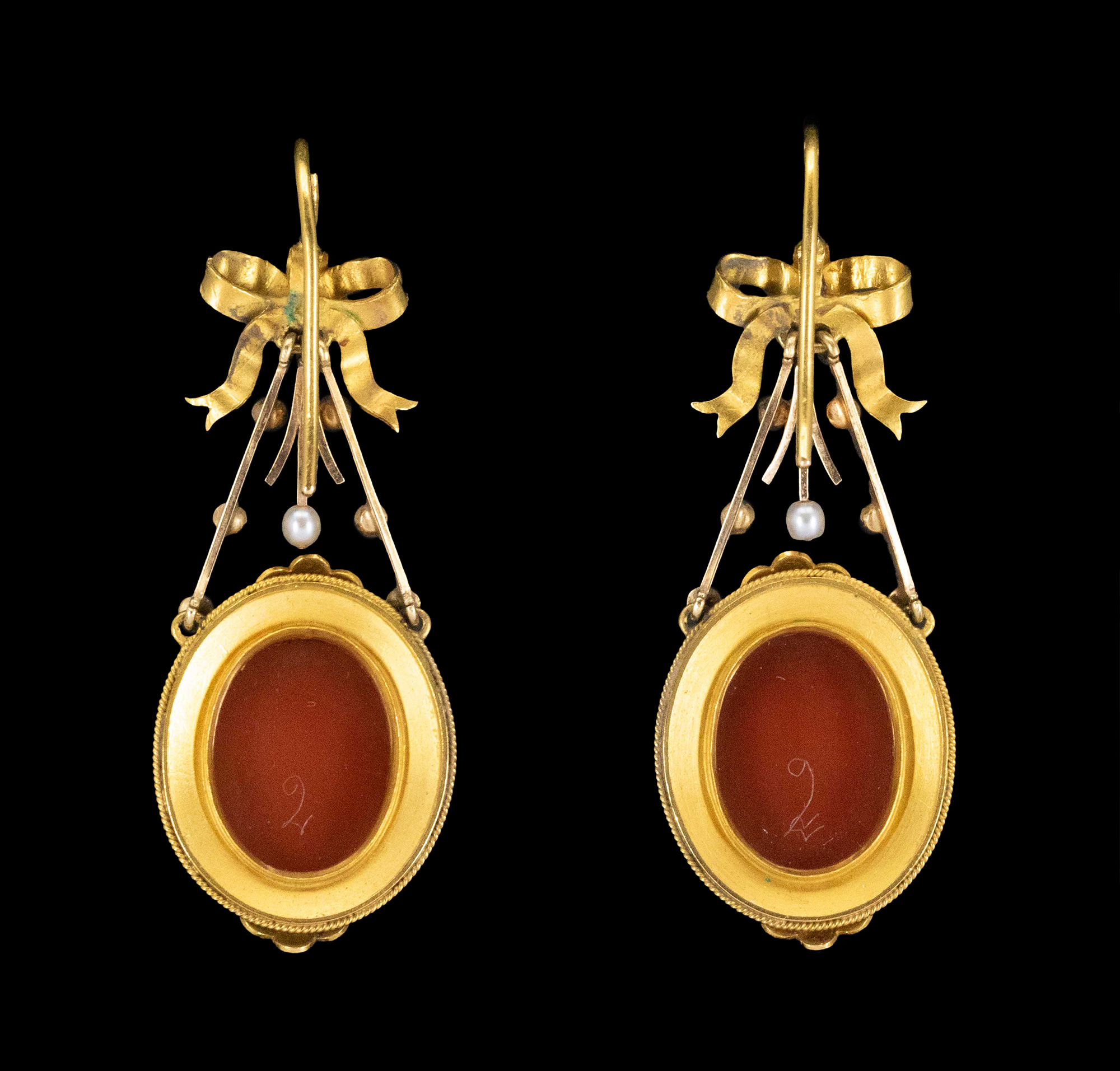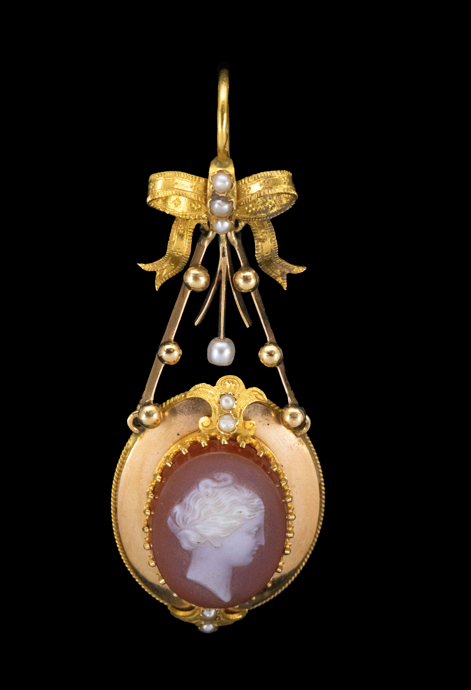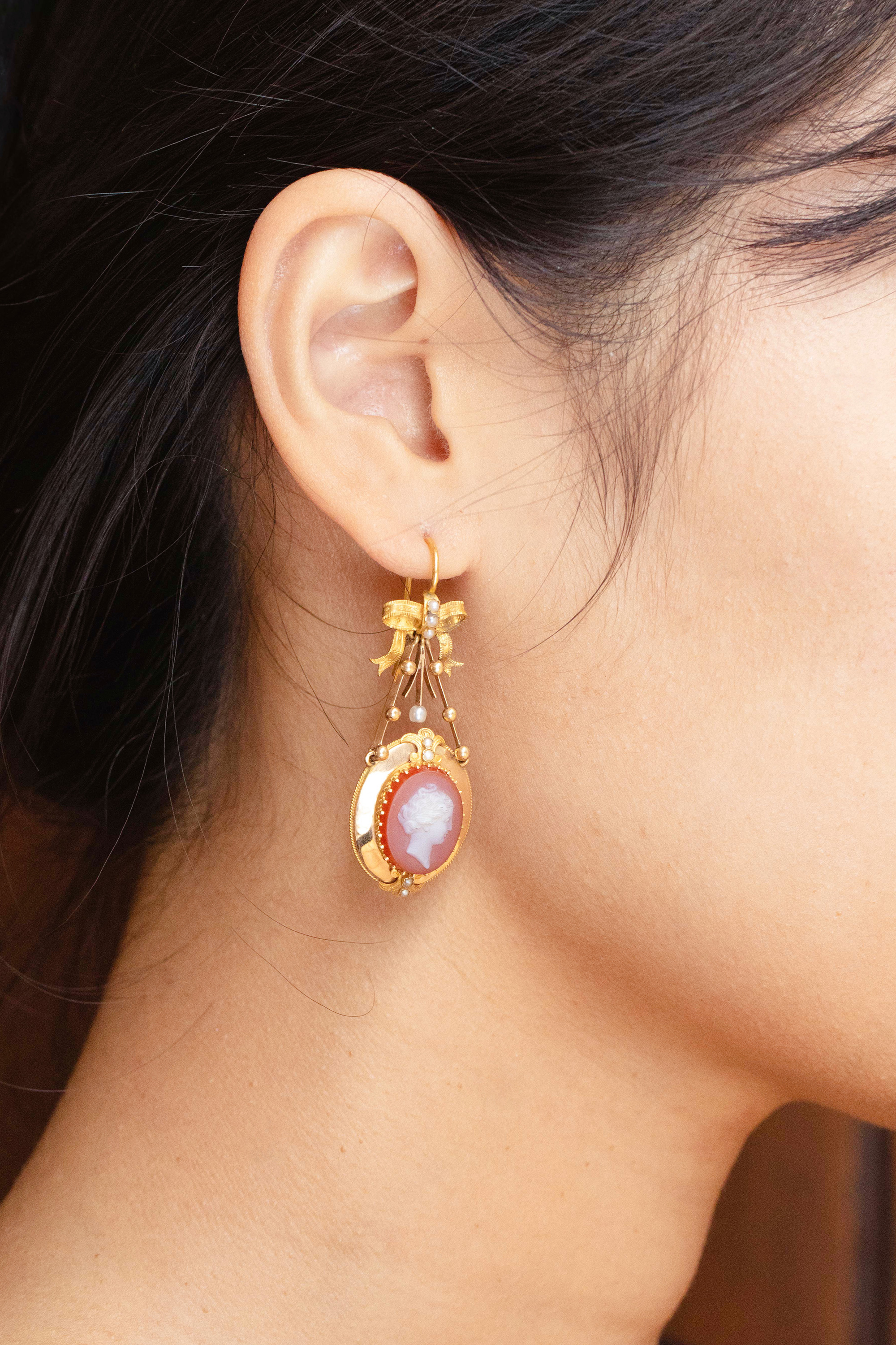 1850-1870年代法国拿破仑三世时期出品蝴蝶结造型18K黄金镶嵌天然海水珍珠及古典女神主题卡梅奥玉髓浮雕耳环及胸针套件