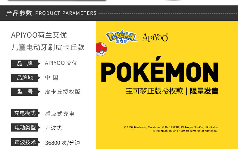 APIYOO/艾优 皮卡丘儿童声波电动牙刷JPY带授权招加盟代理