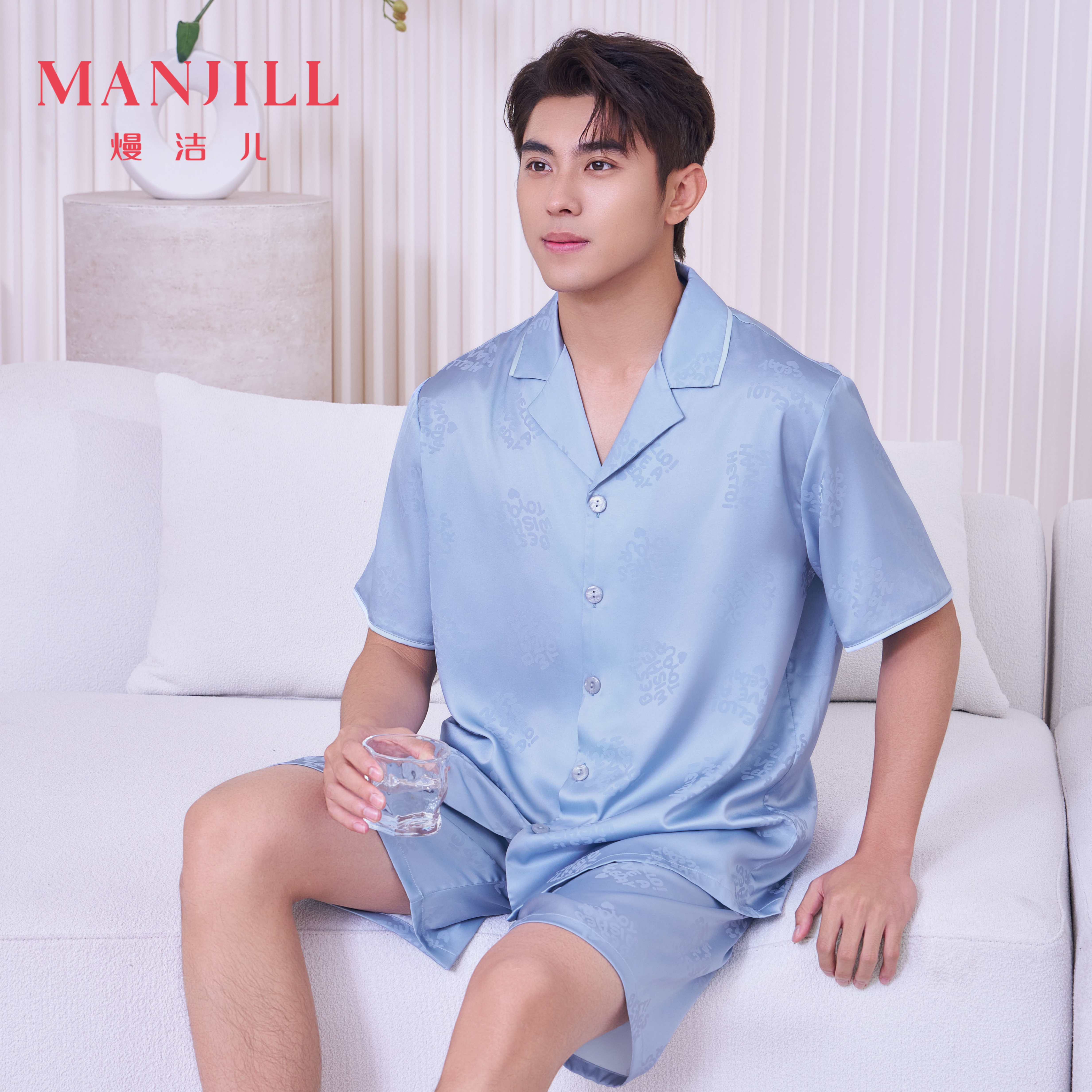 【商场同款】熳洁儿 丝质提花家居男士开衫短袖中裤套装清凉透气26203901