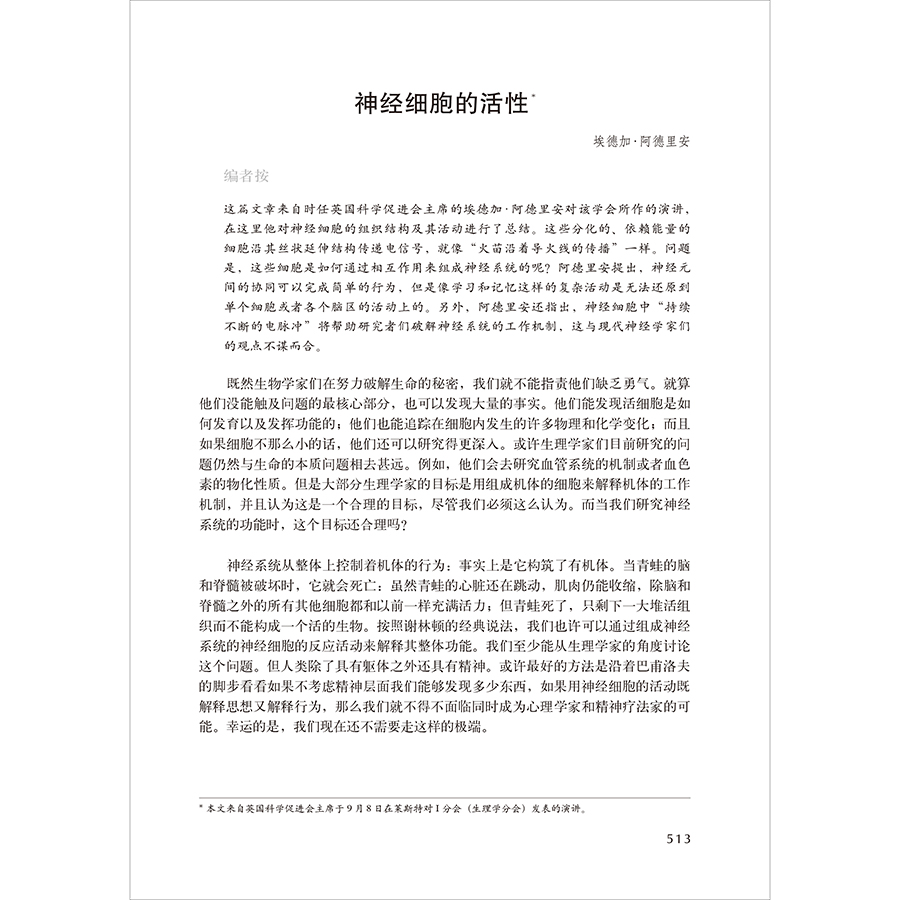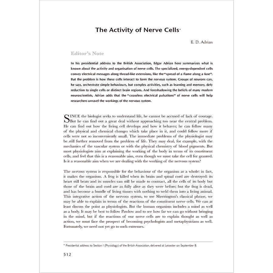 这篇文章来自时任英国科学促进会主席的埃德加· 阿德里安对该学会所作的演讲,在这里他对神经细胞的组织结构及其活动进行了总结。这些分化的、依赖能量的细胞沿其丝状延伸结构传递电信号,就像“火苗沿着导火线的传播”一样。问题是,这些细胞是如何通过相互作用来组成神经系统的呢?阿德里安提出,神经元间的协同可以完成简单的行为,但是像学习和记忆这样的复杂活动是无法还原到单个细胞或者各个脑区的活动上的。另外,阿德里安还指出,神经细胞中“持续不断的电脉冲”将帮助研究者们破解神经系统的工作机制,这与现代神经学家们的观点不谋而合。
