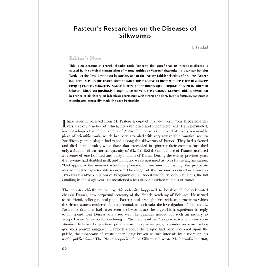 法国化学家路易·巴斯德提出,感染性疾病是由很小的实体或者说“病菌”(细菌)的物理传播造成的,这篇文章报道的正是巴斯德关于此项研究的首例证据。文章作者是伦敦皇家研究院的约翰·廷德尔,他是当时英国流的科学家之一。早先,法国化学家让–巴蒂斯特·杜马邀请巴斯德研究当时给法国家蚕带来极大破坏的一种疾病的起因。巴斯德把重点放在了一种微观“粒子”上。早先就有人在家蚕的体液中发现了这种粒子,但先前人们认为这种粒子是家蚕本身就有的。巴斯德的感染性病菌理论一经在法国公布便遭到了强烈的批判,不过,通过出色的系统实验,他终无可辩驳地证明了其理论的正确。