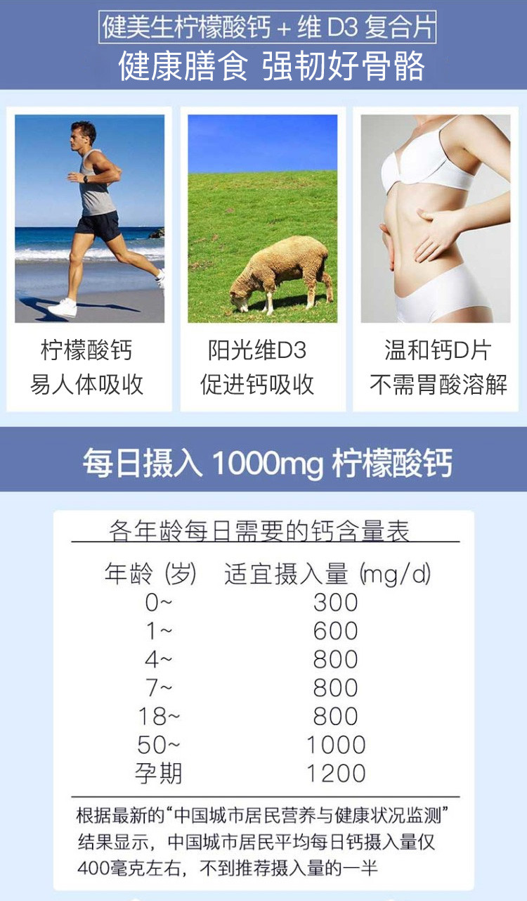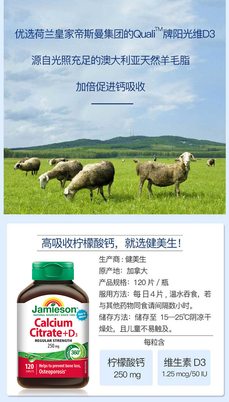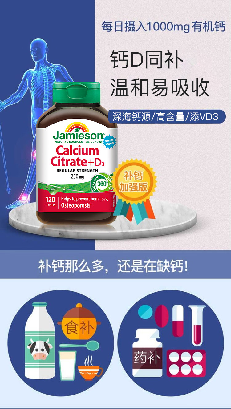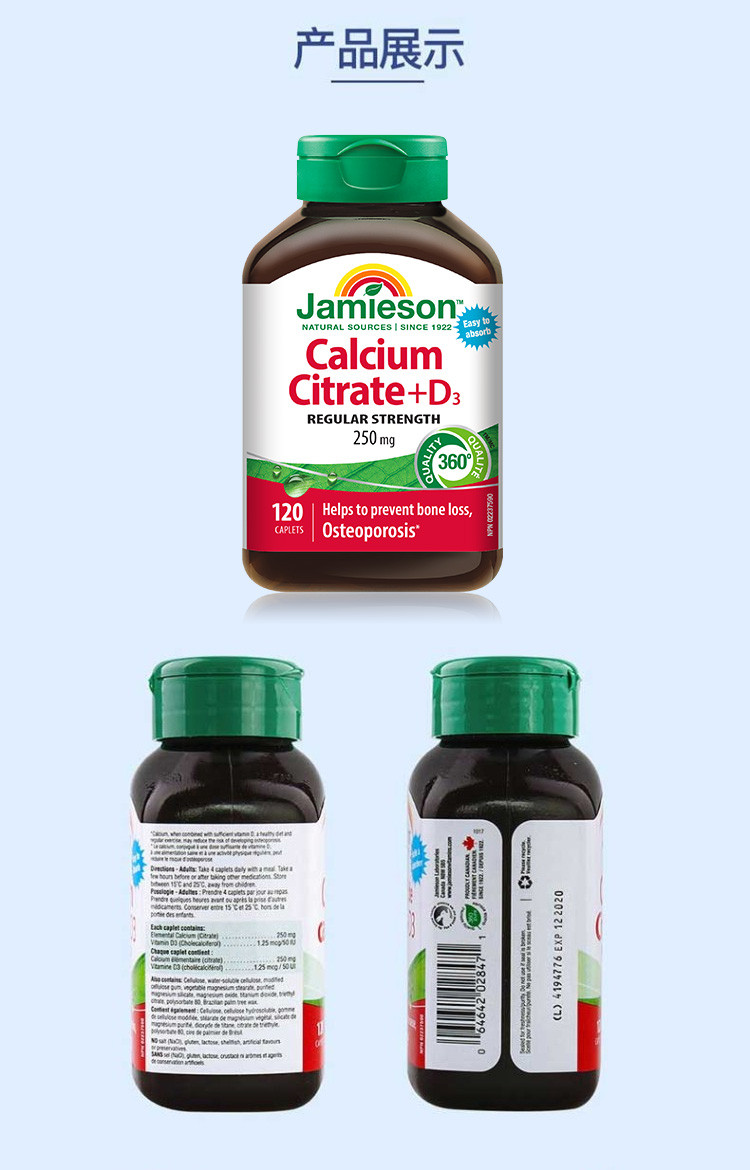 【分销】Jamieson健美生柠檬酸钙+维生素D3复合片120片250mg补钙强韧骨骼牙齿