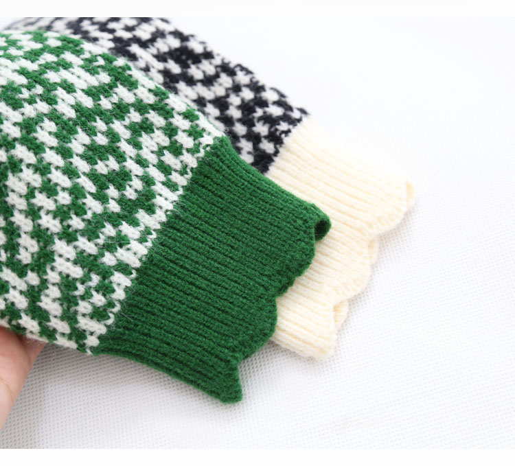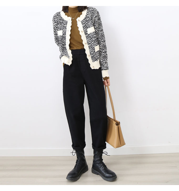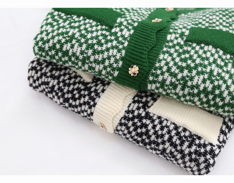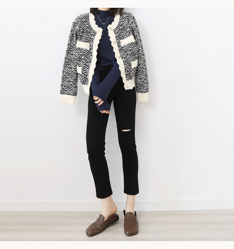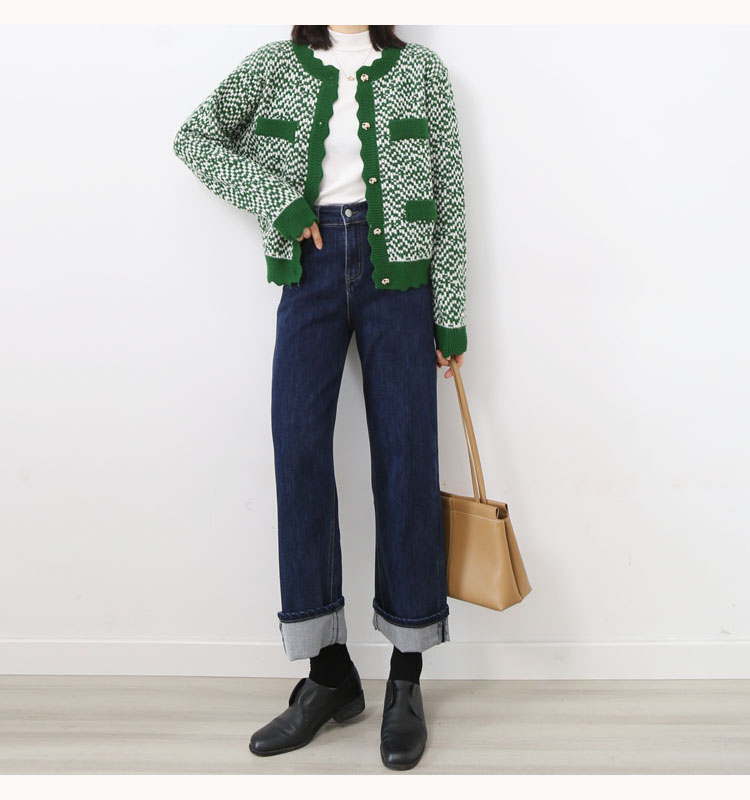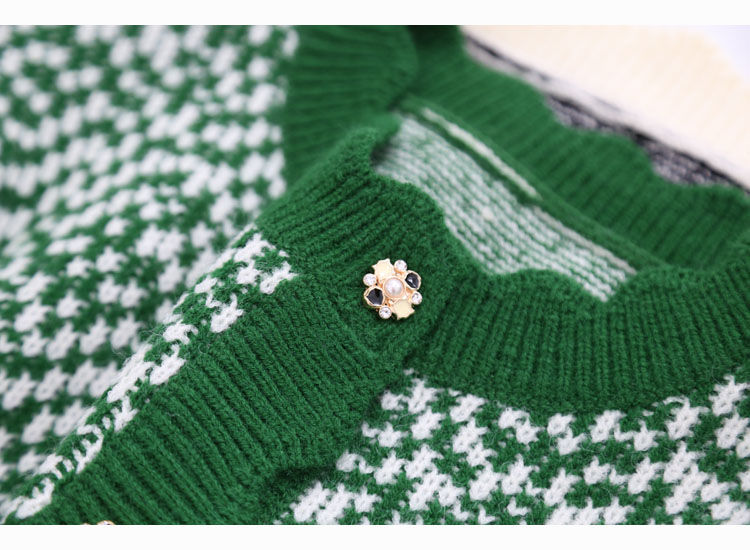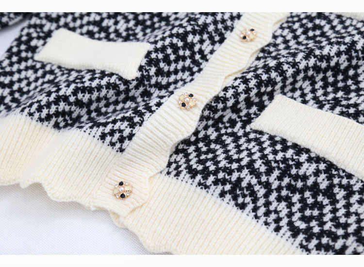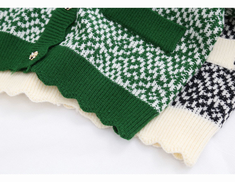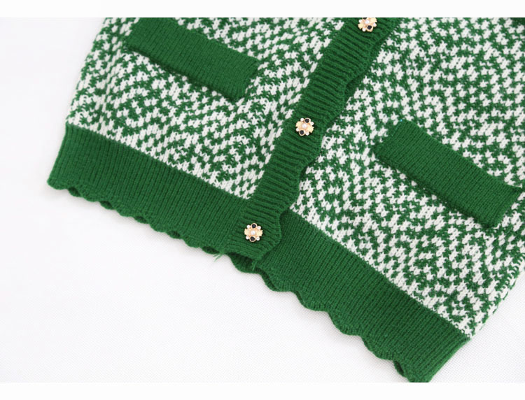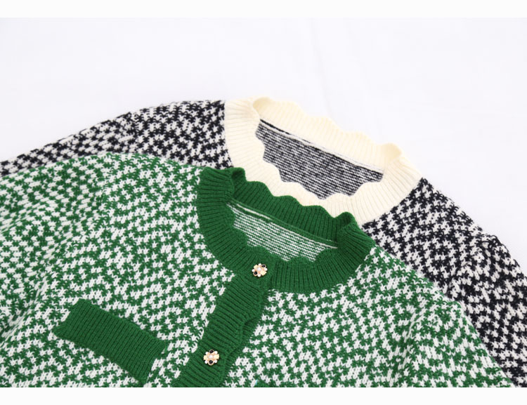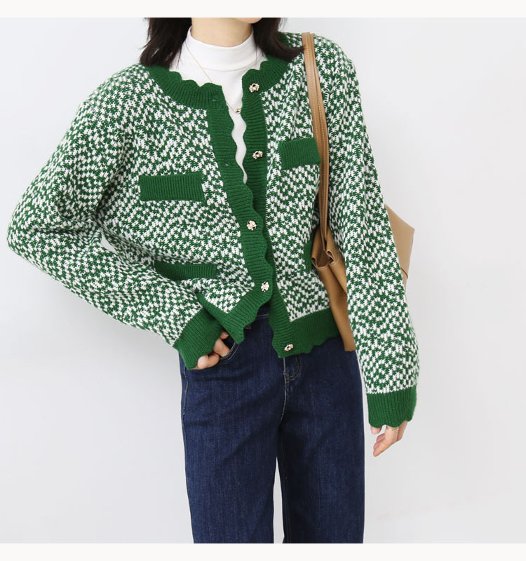 波浪边圆领单排扣毛线针织花撞色短款开衫7215
