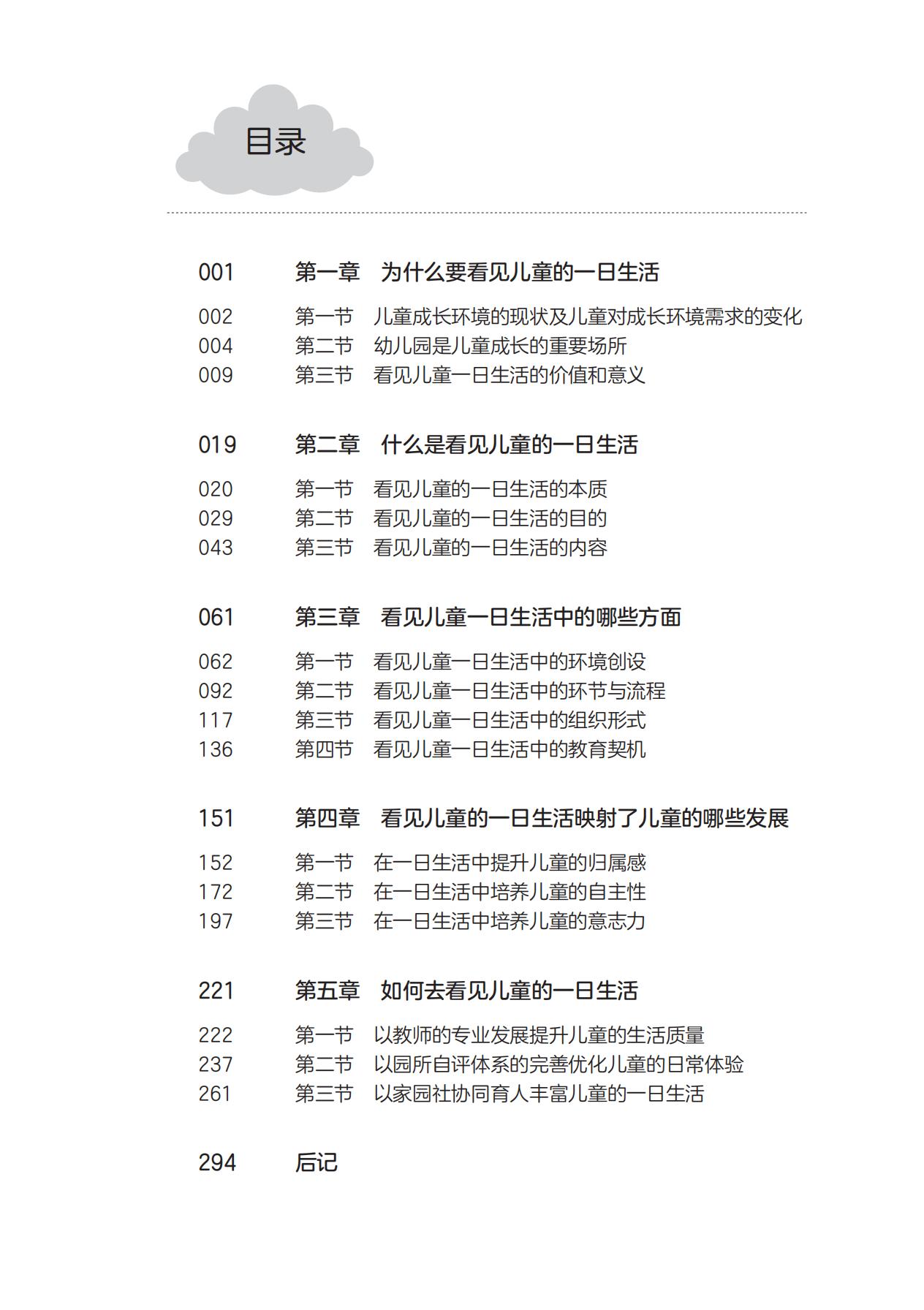 《看见儿童的一日生活》围绕儿童在幼儿园一日生活中的各个方面,通过大量来自幼儿园一日生活中的真实案例,从为什么、是什么、怎么做、保障机制的逻辑视角,让读者更全面地了解看见儿童的一日生活的内涵、本质及具体策略。全书共五章。第一章阐述了为什么要看见儿童的一日生活,从重要性和必要性的层面解读看见儿童的一日生活具有独特的价值和意义。第二章阐述了什么是看见儿童的一日生活,介绍了看见儿童一日生活的本质、目的和内容,帮助读者深入理解看见的重要性。第三章和第四章分别从技术层面和价值层面阐明了如何看见儿童的一日生活。其中,第三章结合具体案例讨论了看见儿童的一日生活的具体策略和方法,包括一日生活的环境创设、环节与流程、组织形式和教育契机。第四章探讨了看见儿童的一日生活对儿童发展的意义,展示了看见儿童的一日生活的积极影响,细致呈现了培养具有归属感、自主性和意志力的儿童的教育理念和策略。最后一章从支持保障的视角,提供了实用的方法与思路,探讨如何支持园所和教师更好地看见儿童的一日生活,包括教师的多元赋能、园所保教质量的自我评估体系和家园社协同育人路径等,可以帮助教育工作者更好地看见儿童,并提供支持和指导。