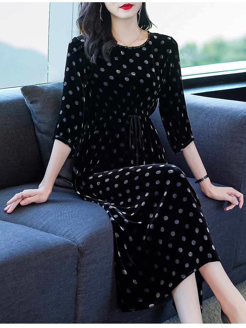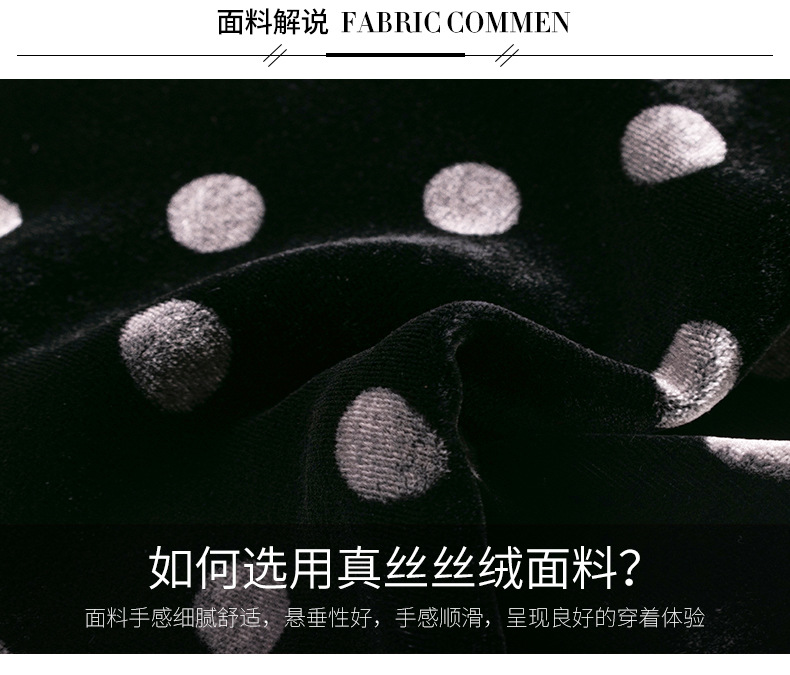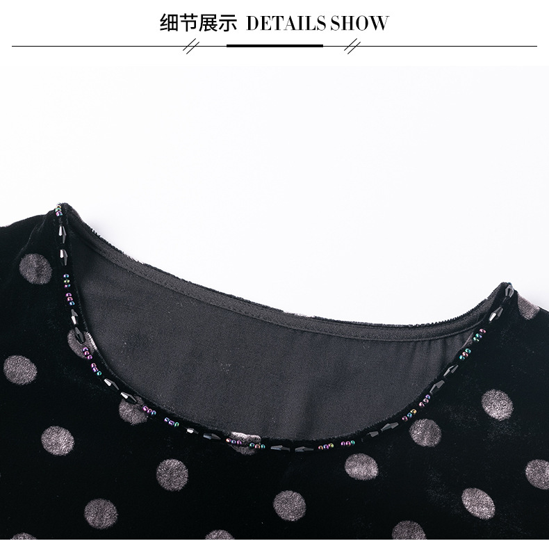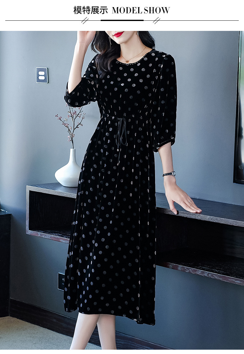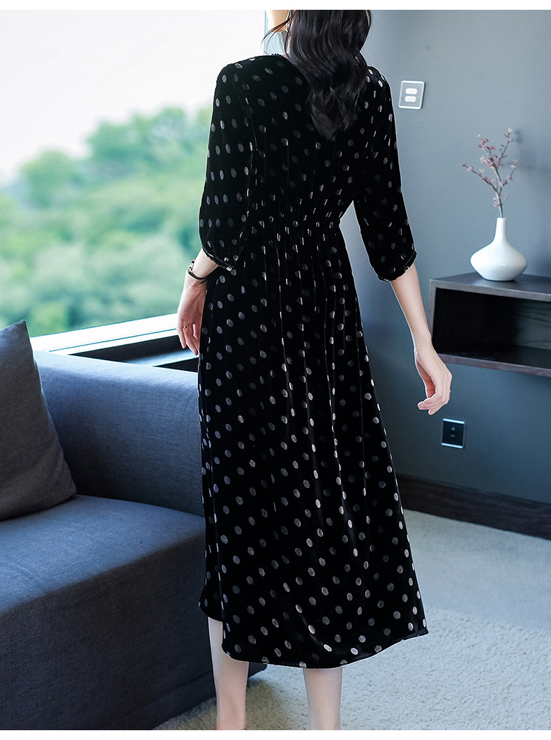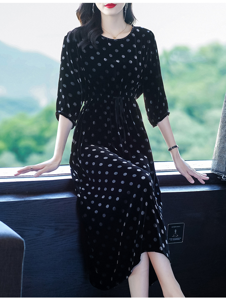 秋季真丝丝绒波点连衣裙女欧美气质订珠裙子中长裙WWM-81802