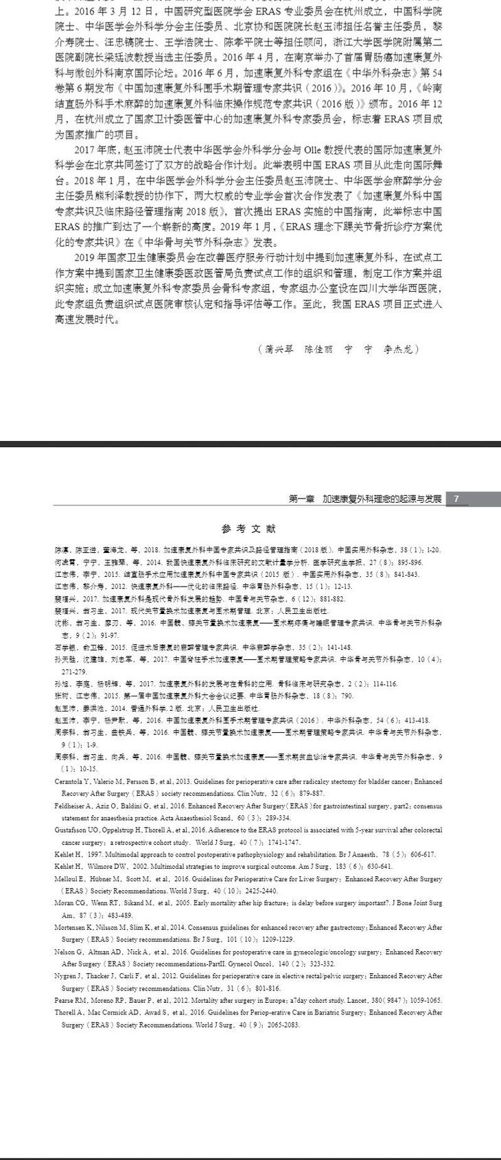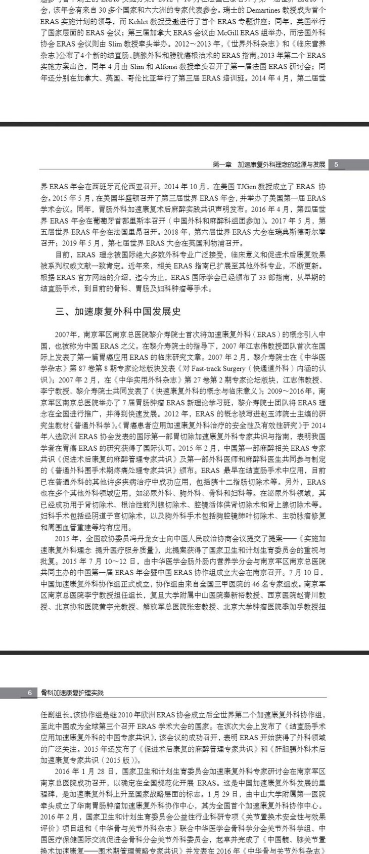 2007年,南京军区南京总医院黎介寿院士*次将加速康复外科(ERAS)的概念引入中国,也被称为中国ERAS之父。在黎介寿院士的指导下,2007年江志伟教授团队*次在国际上发表了第一篇胃癌应用ERAS的临床研究文章。2007年2月,黎介寿院士在《中华医学杂志》第87卷第8期专家论坛版块发表《对Fast-track Surgery(快通道外科)内涵的认识》;2007年2月,在《中华实用外科杂志》第27卷第2期专家论坛版块,江志伟教授、李宁教授、黎介寿院士共同发表了《快速康复外科的概念与临床意义》;2009~2016年,南京军区南京总医院举办了7届胃肠肿瘤ERAS新理论学习班,黎介寿院士团队将ERAS理念在全国进行推广,并得到快速发展。2012年,ERAS的概念被写进赵玉沛院士主编的研究生教材《普通外科学》。《胃癌患者应用加速康复外科治疗的安全性及有效性研究》于2014年入选欧洲ERAS协会发表的国际第一部胃切除加速康复外科专家共识与指南,表明我国学者在胃癌ERAS的研究获得了国际认可。2015年2月,中国第一部麻醉相关ERAS专家共识《促进术后康复的麻醉管理专家共识》及第一部外科医师和麻醉科医生共同参与制定的《普通外科围手术期疼痛处理专家共识》颁布。ERAS*早在结直肠手术中应用,目前已在普通外科的其他许多疾病治疗中成功应用,包括胰十二指肠切除术等。另外,ERAS也在多个其他外科领域应用,如泌尿外科、胸外科、骨科和妇科等。在泌尿外科领域,其已经成功用于肾切除术、根治性前列腺切除术、腔镜活体供肾切除术和肾上腺切除术等。妇科手术包括经阴道子宫切除术,以及胸外科手术包括胸腔镜肺叶切除术、主动脉瘤修复和周围血管重建等均有应用。