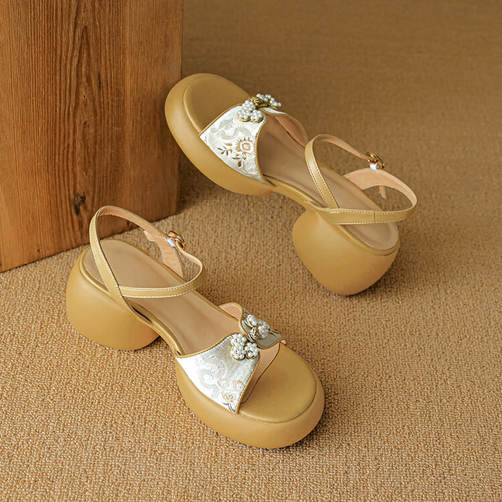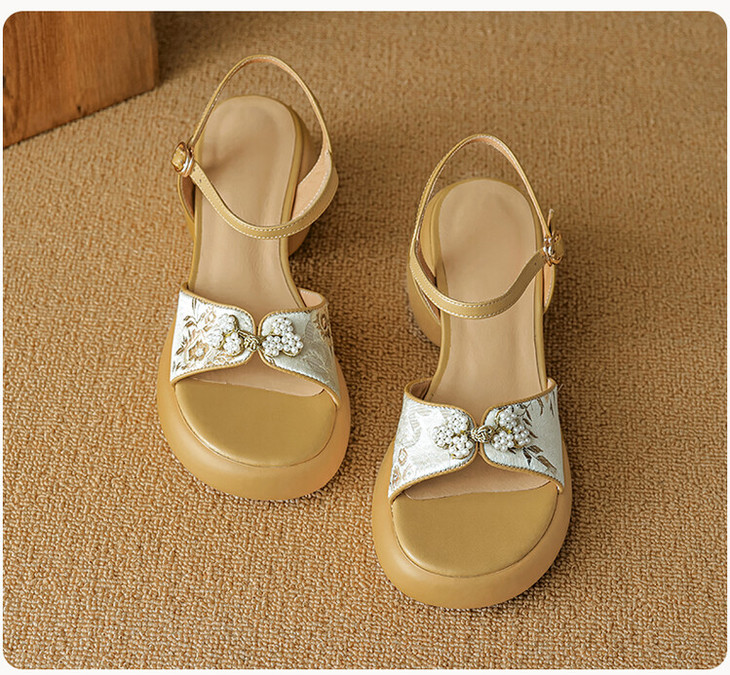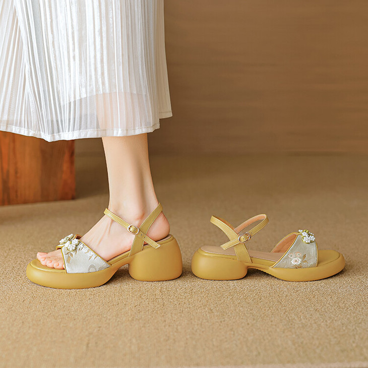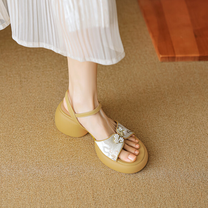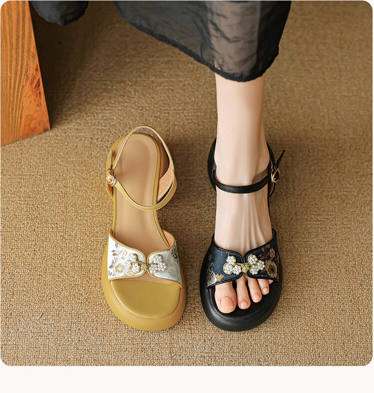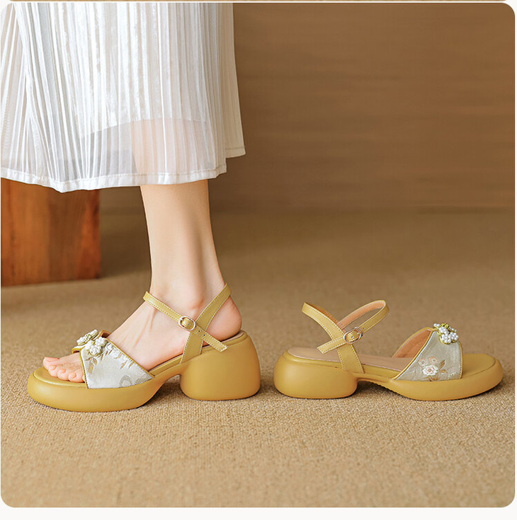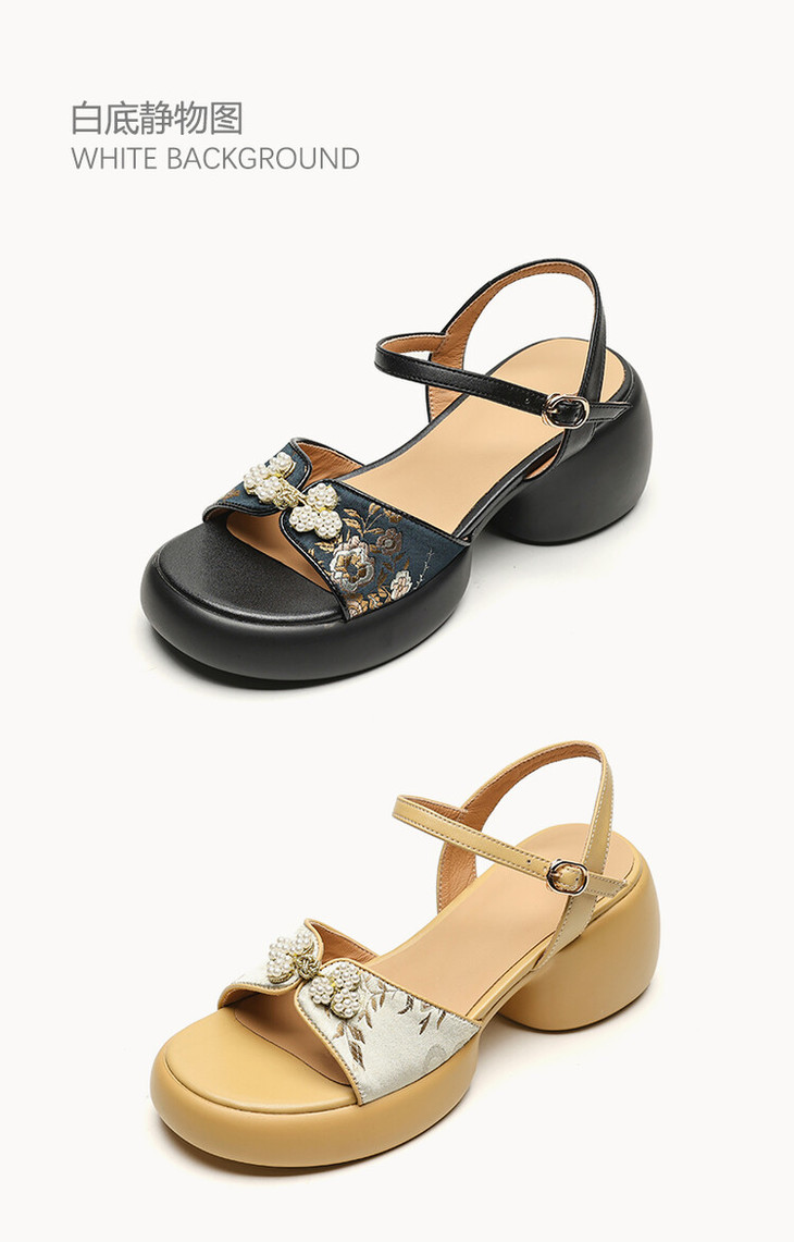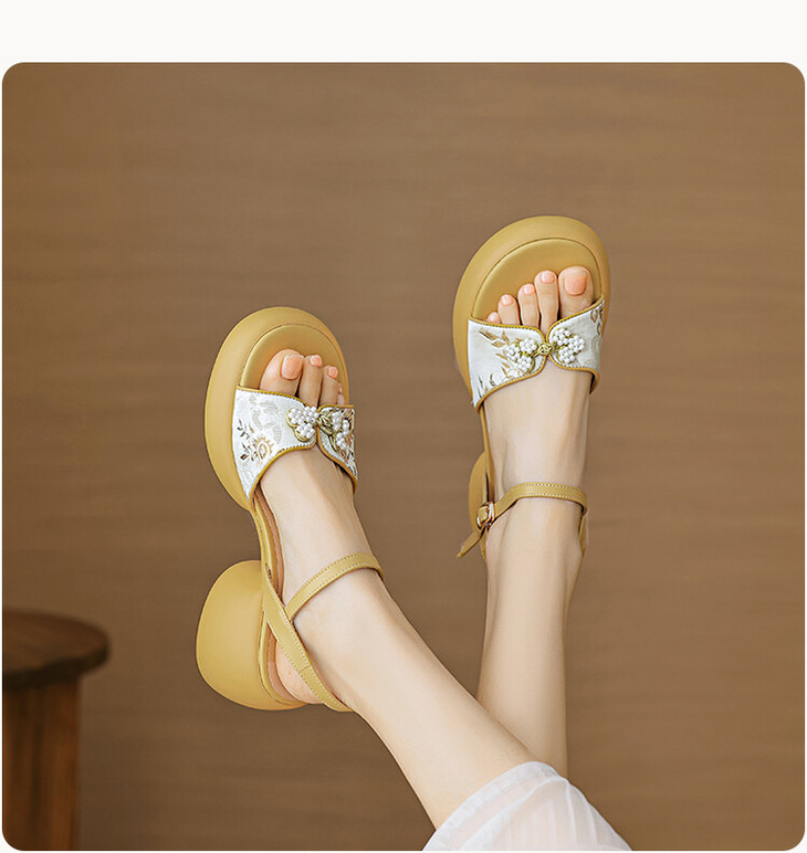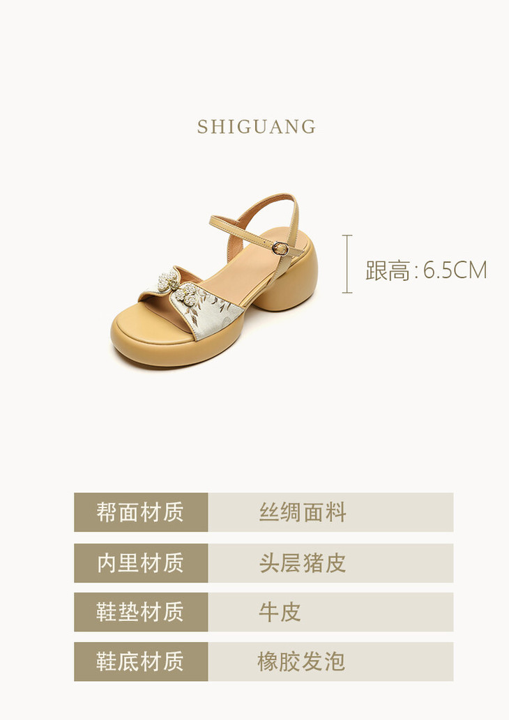 【预售5天】2种跟~巨软松糕厚底凉鞋女夏新中式丝绸盘扣一字带露趾粗跟高跟鞋YMT&MT3740
