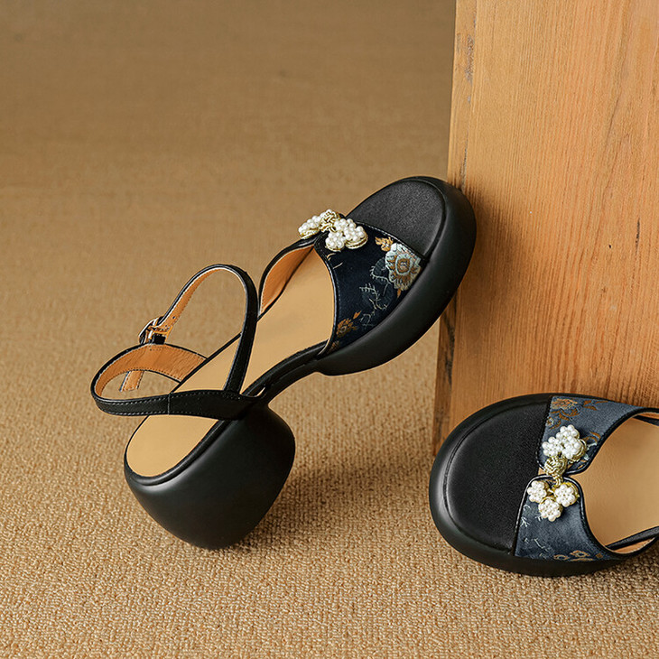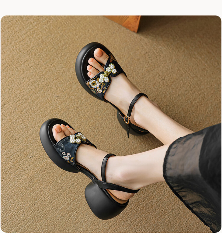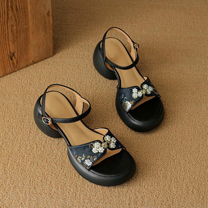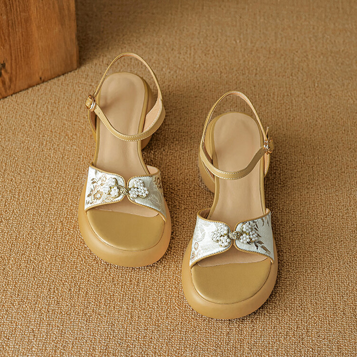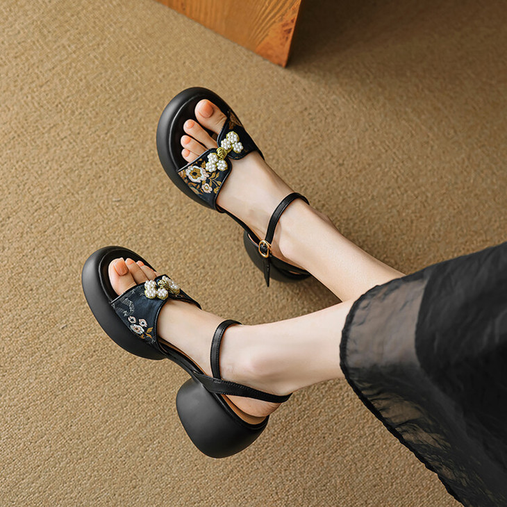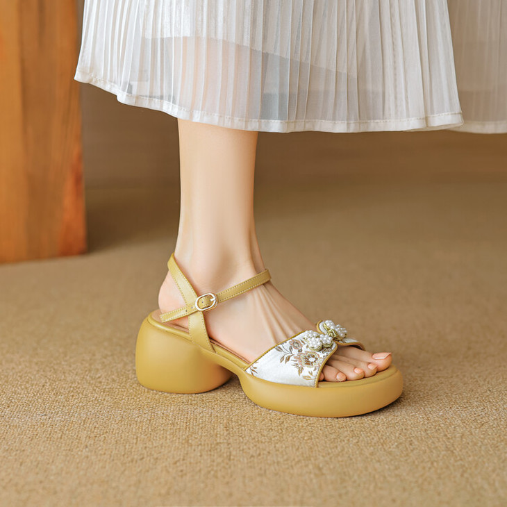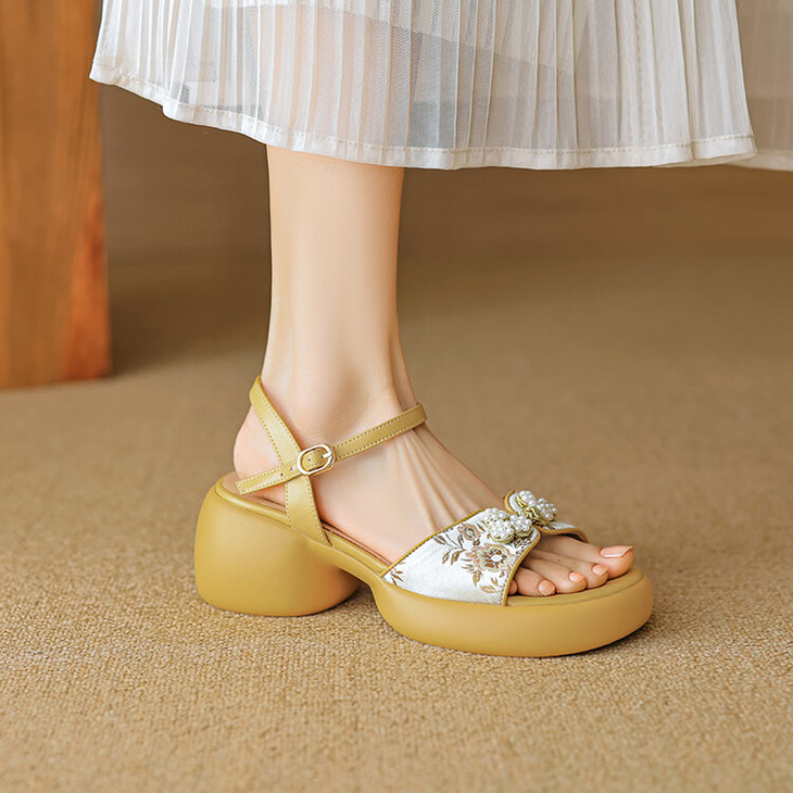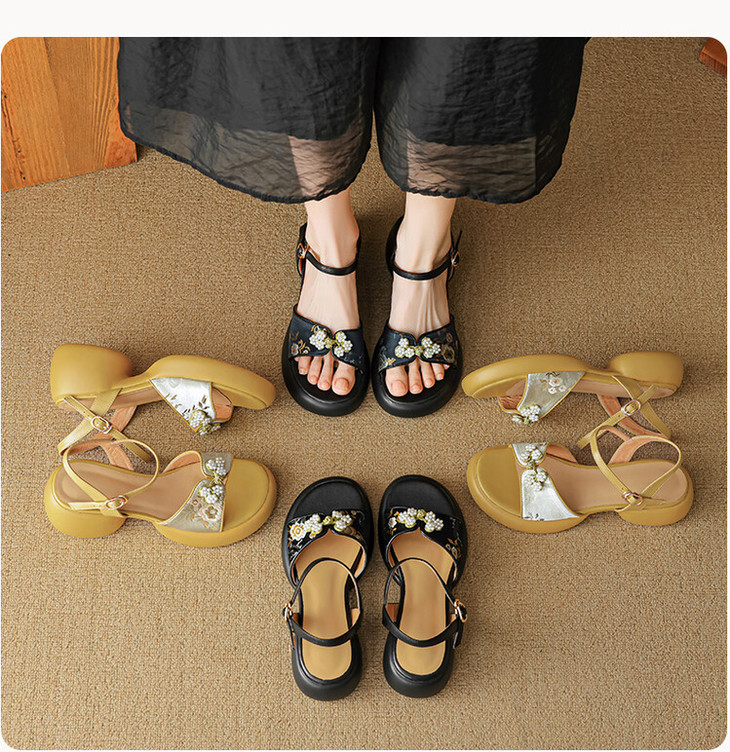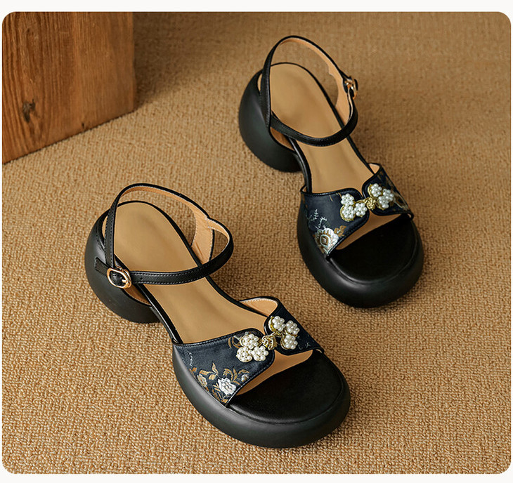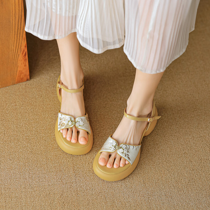 【预售5天】2种跟~巨软松糕厚底凉鞋女夏新中式丝绸盘扣一字带露趾粗跟高跟鞋YMT&MT3740